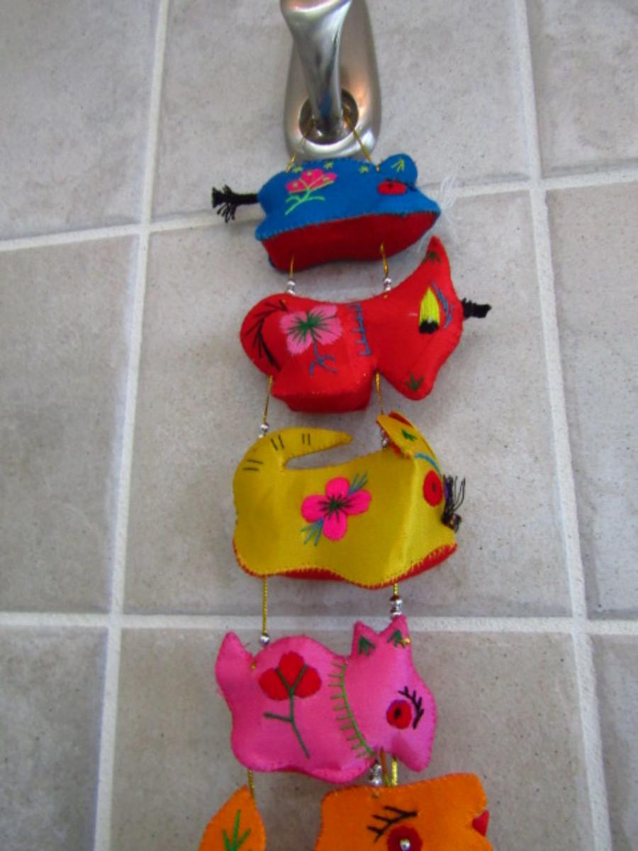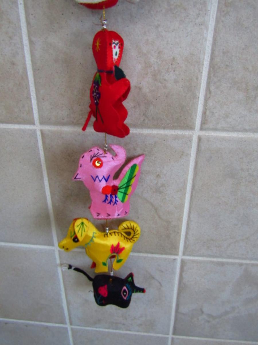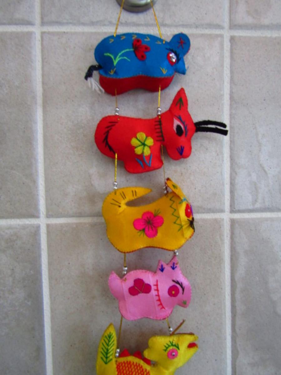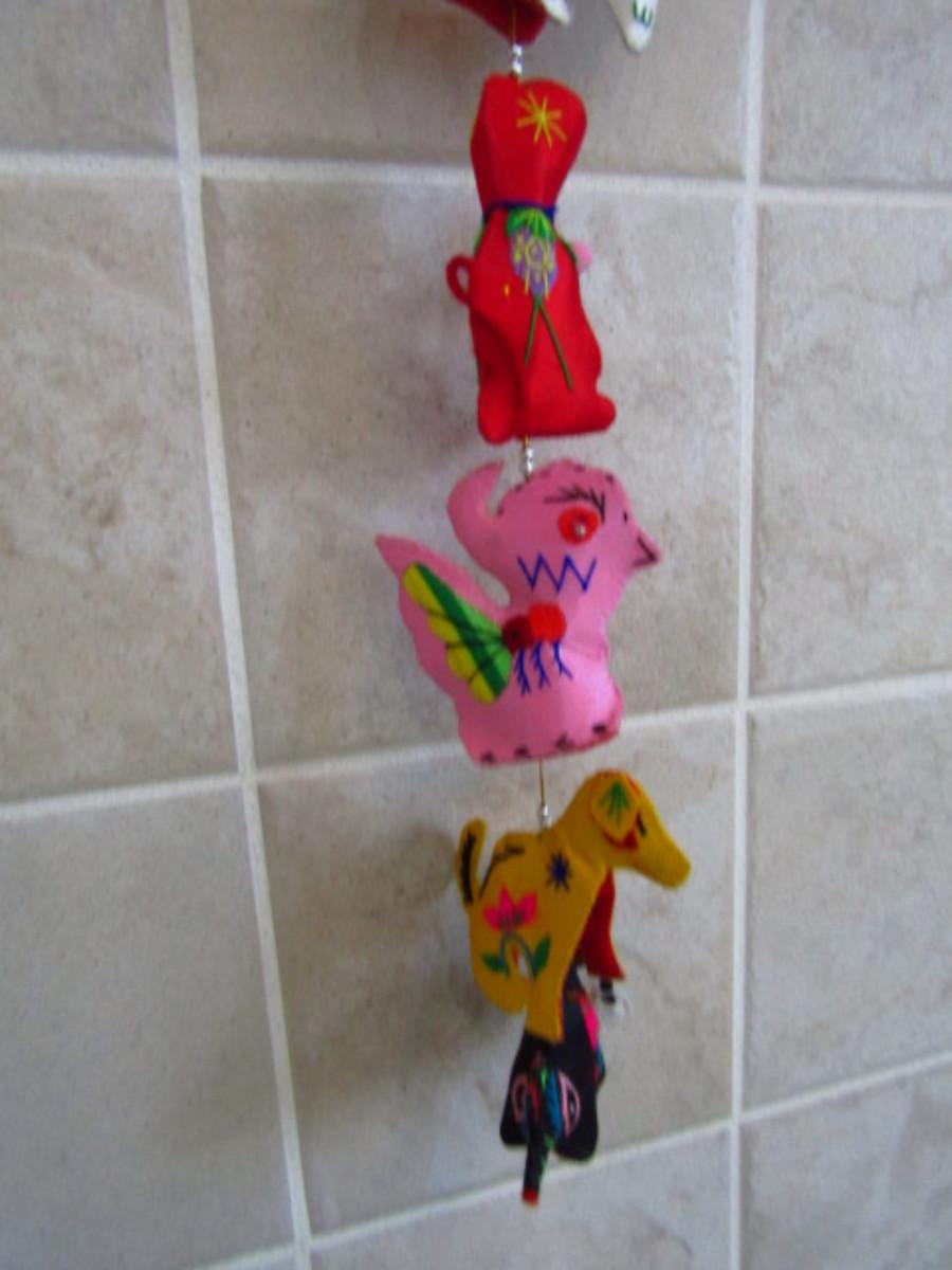 Collection of Colorful Home Decor and Change Purses (MBR). Two strands of colorful sewn figures and four change purses.