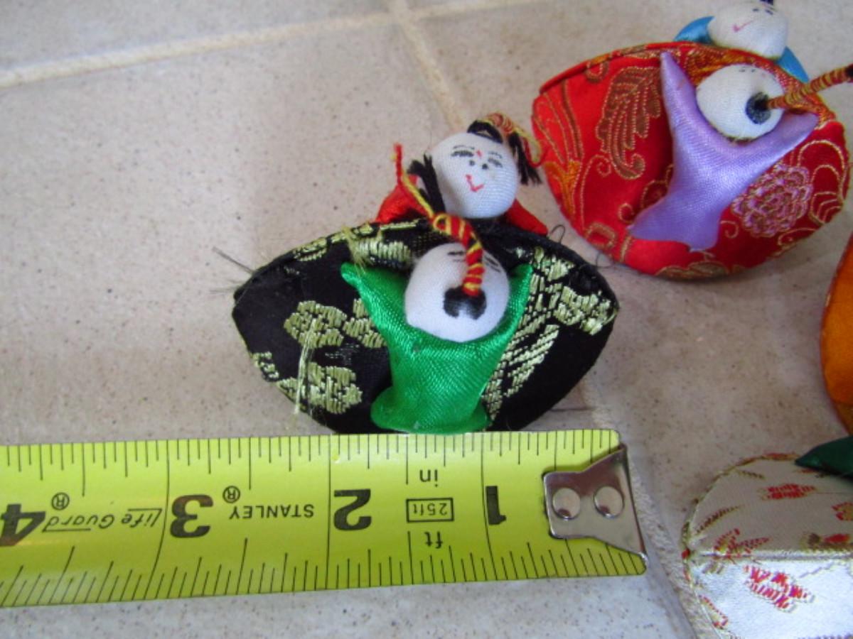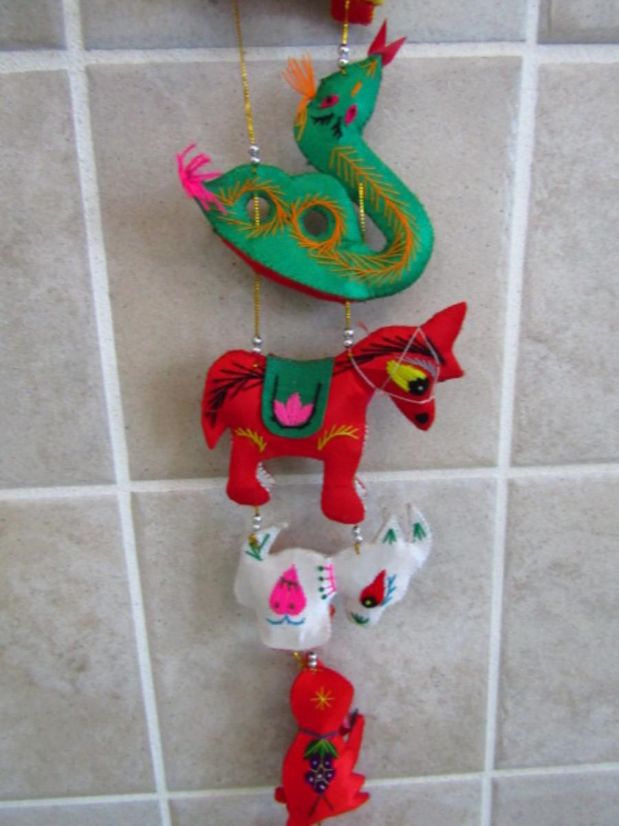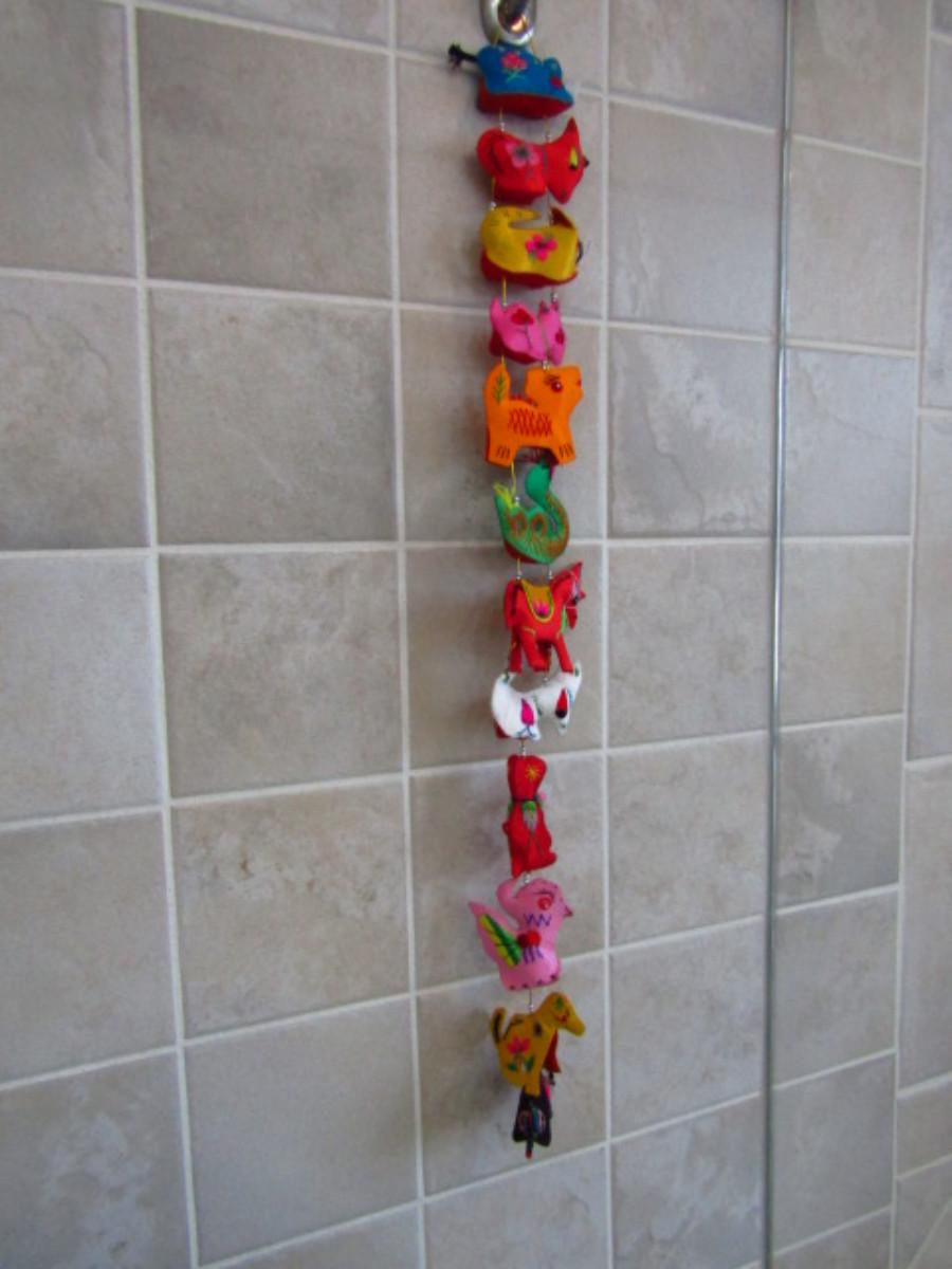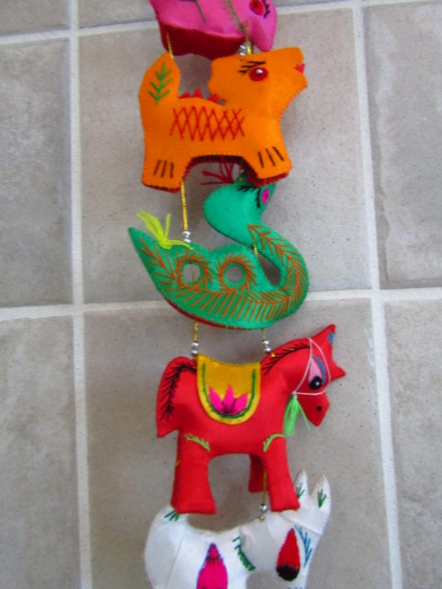 Collection of Colorful Home Decor and Change Purses (MBR). Two strands of colorful sewn figures and four change purses.