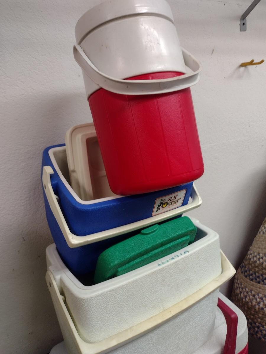 Collection of Coolers Various Sizes Mostly Coleman Brand. Coolers and thermos only. Fan, rug, and storage box not included in this lot.