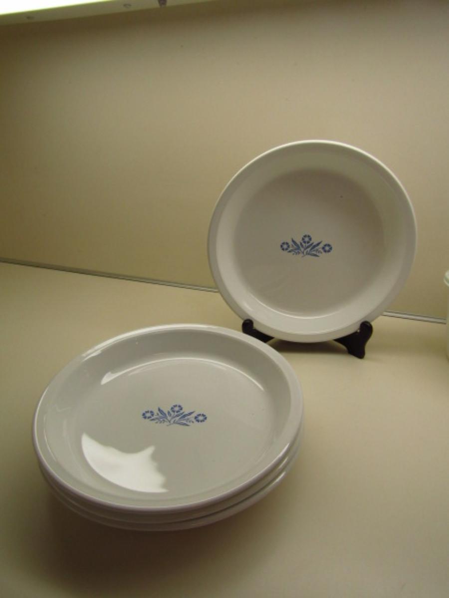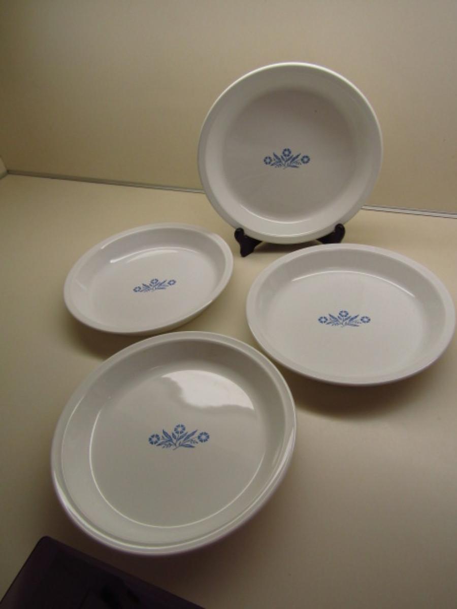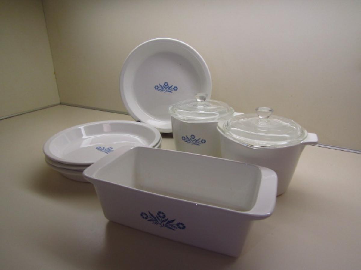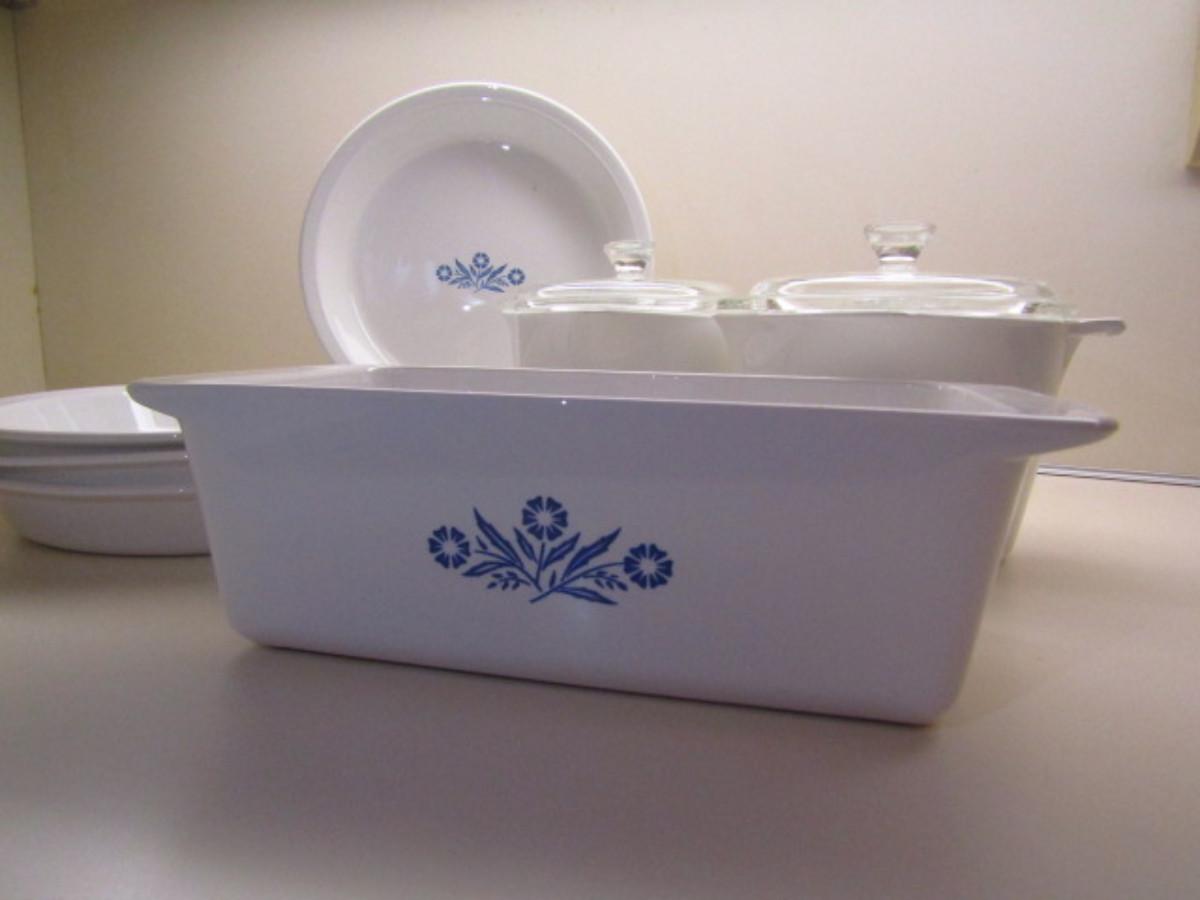 Collection of Corning Ware Blue Cornflower Baking Dishes. Bread pan, four 9" pie plates, two 32 ounce round casserole dishes with lids. Please see all pictures- one lid has a chip.