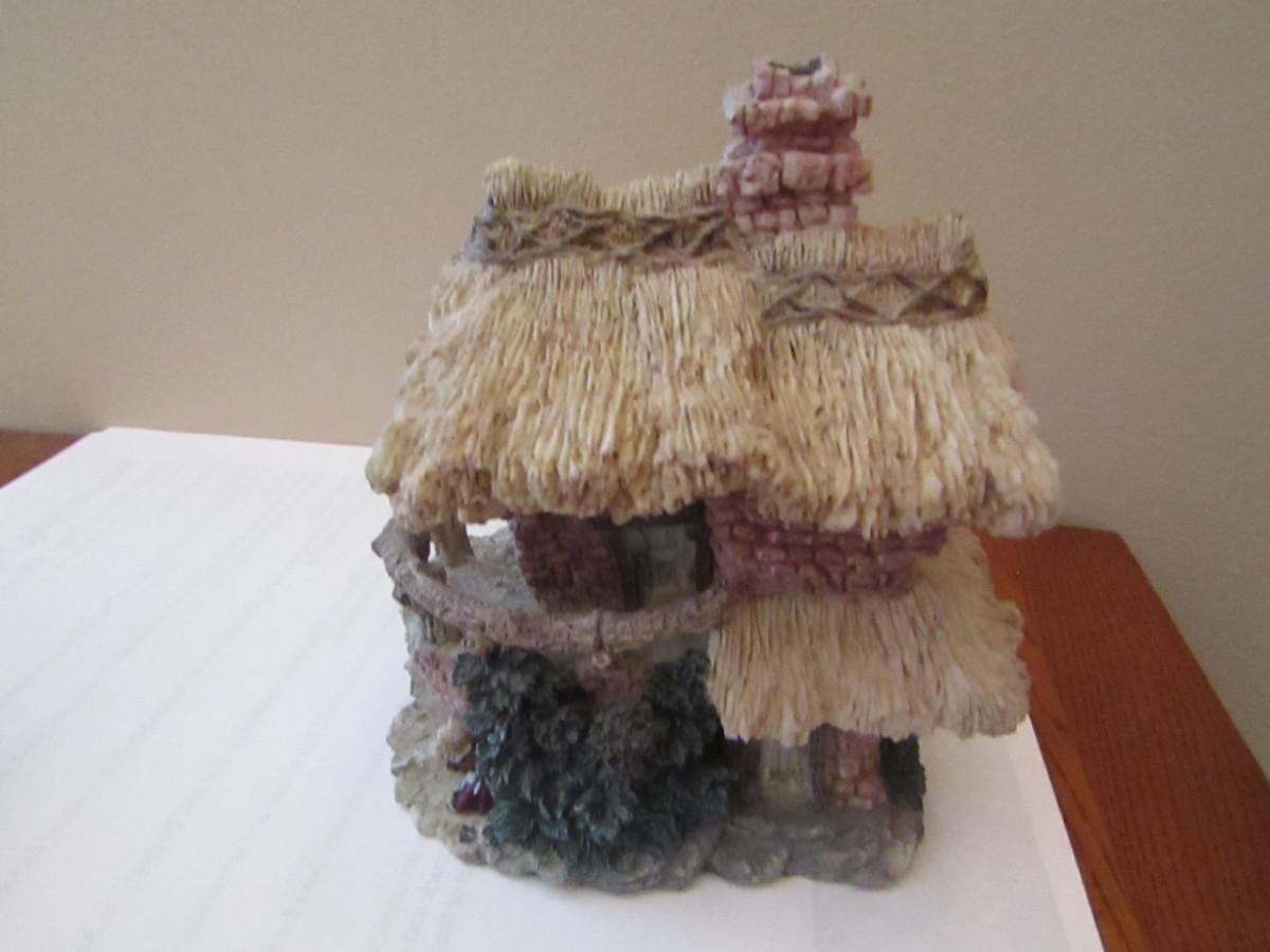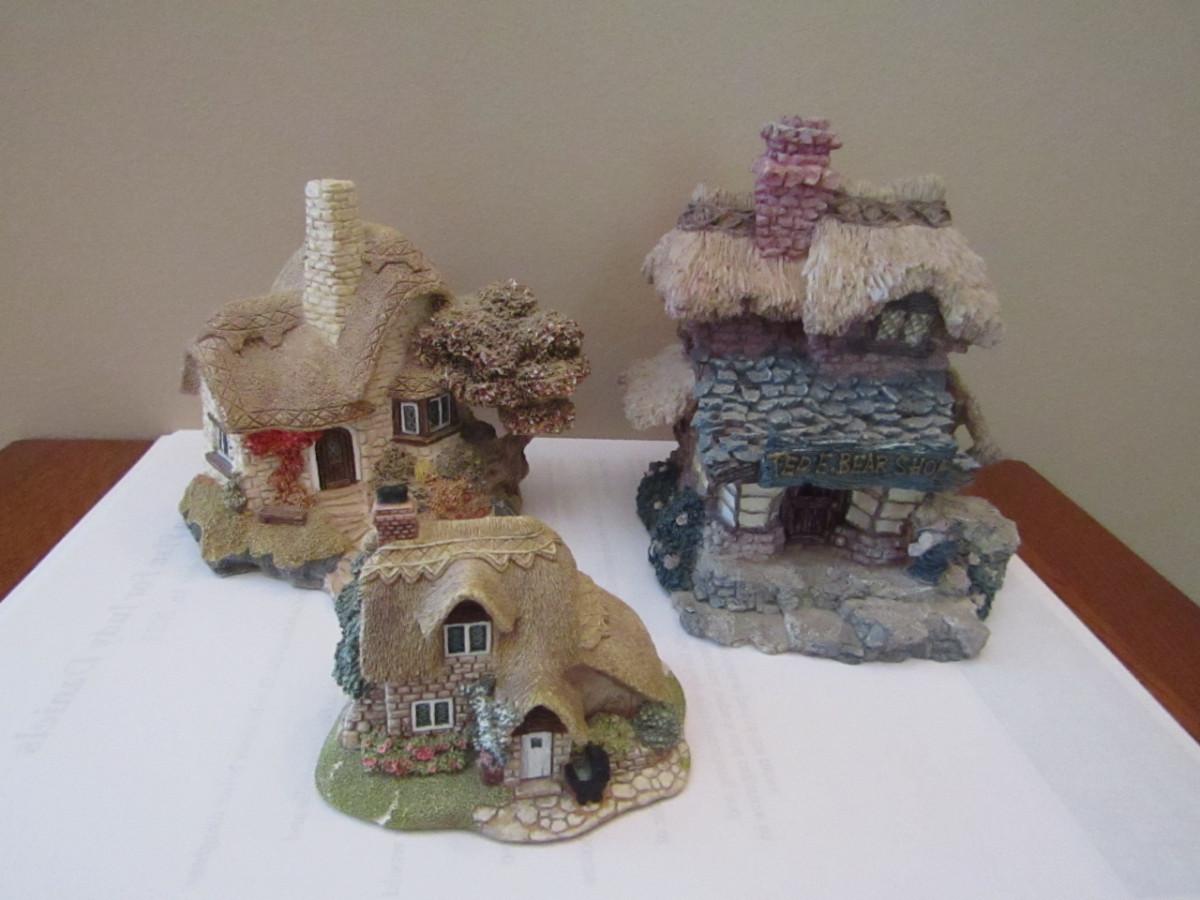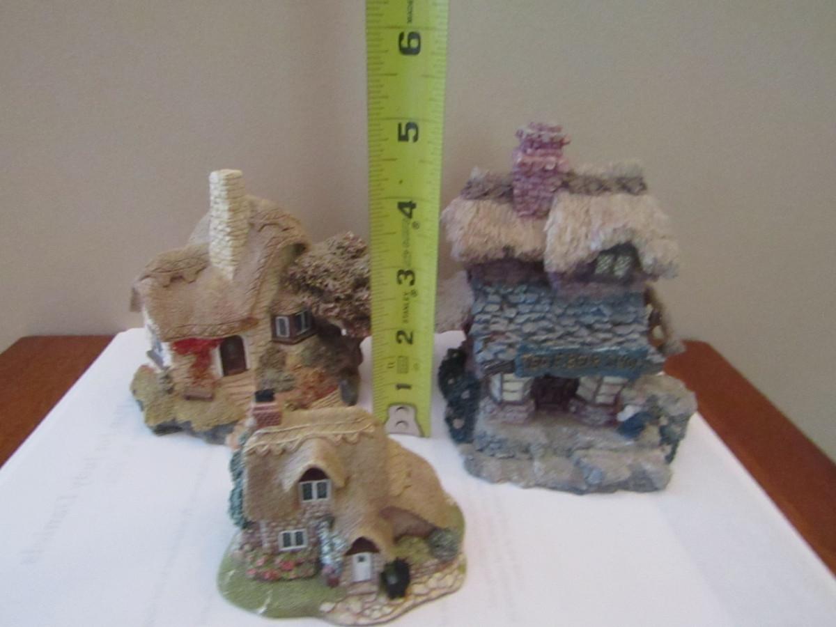 Set of Three Cottage Style Collectible Figurines. Makers include Lilliput Lane and Boyds Bearly Built Villages.