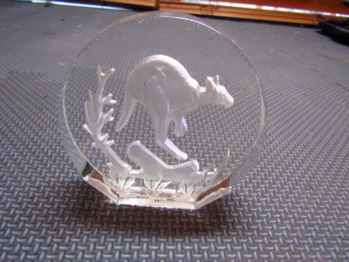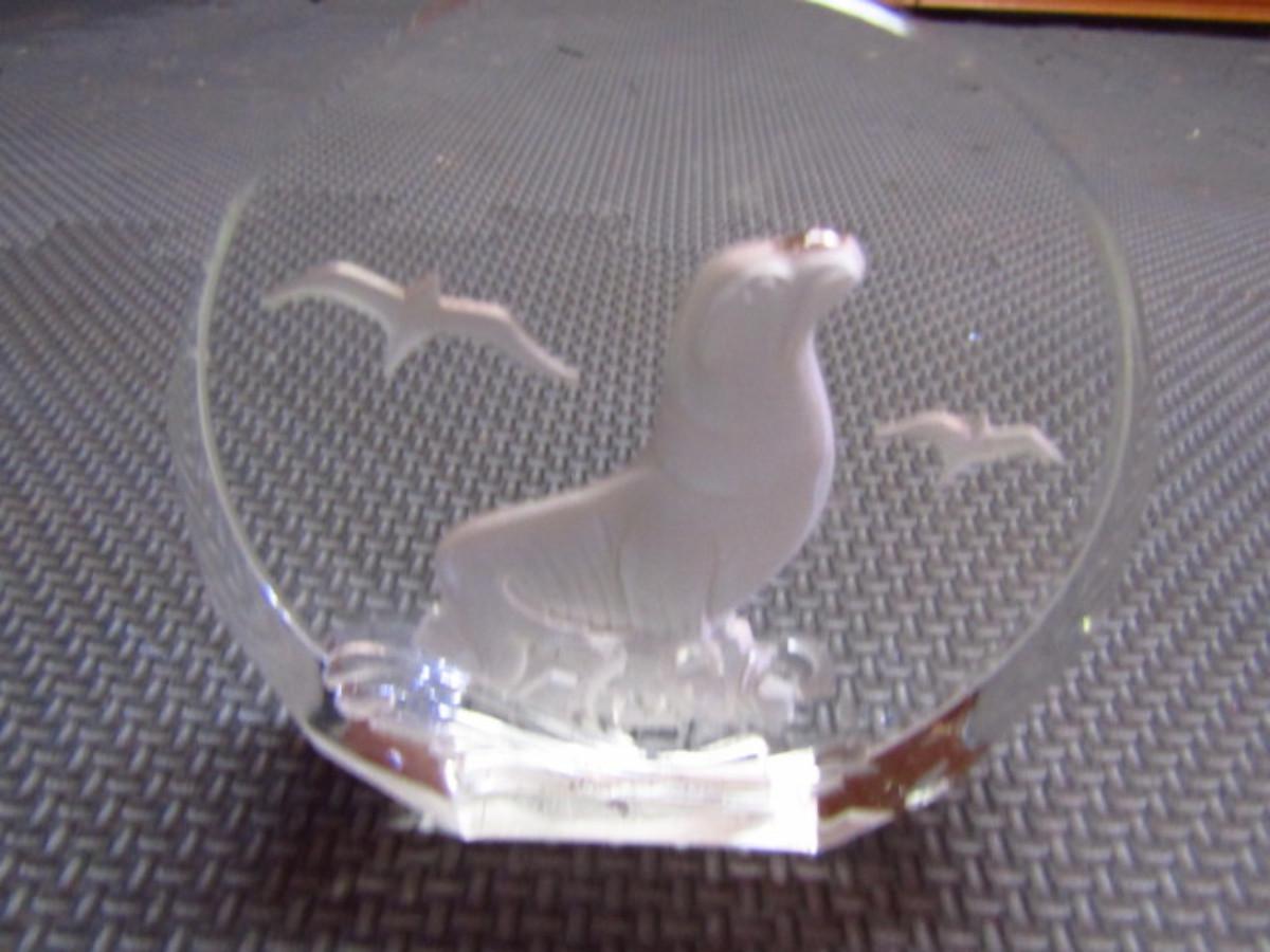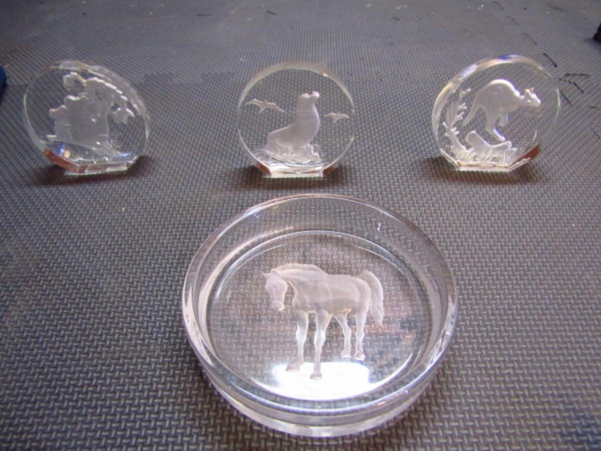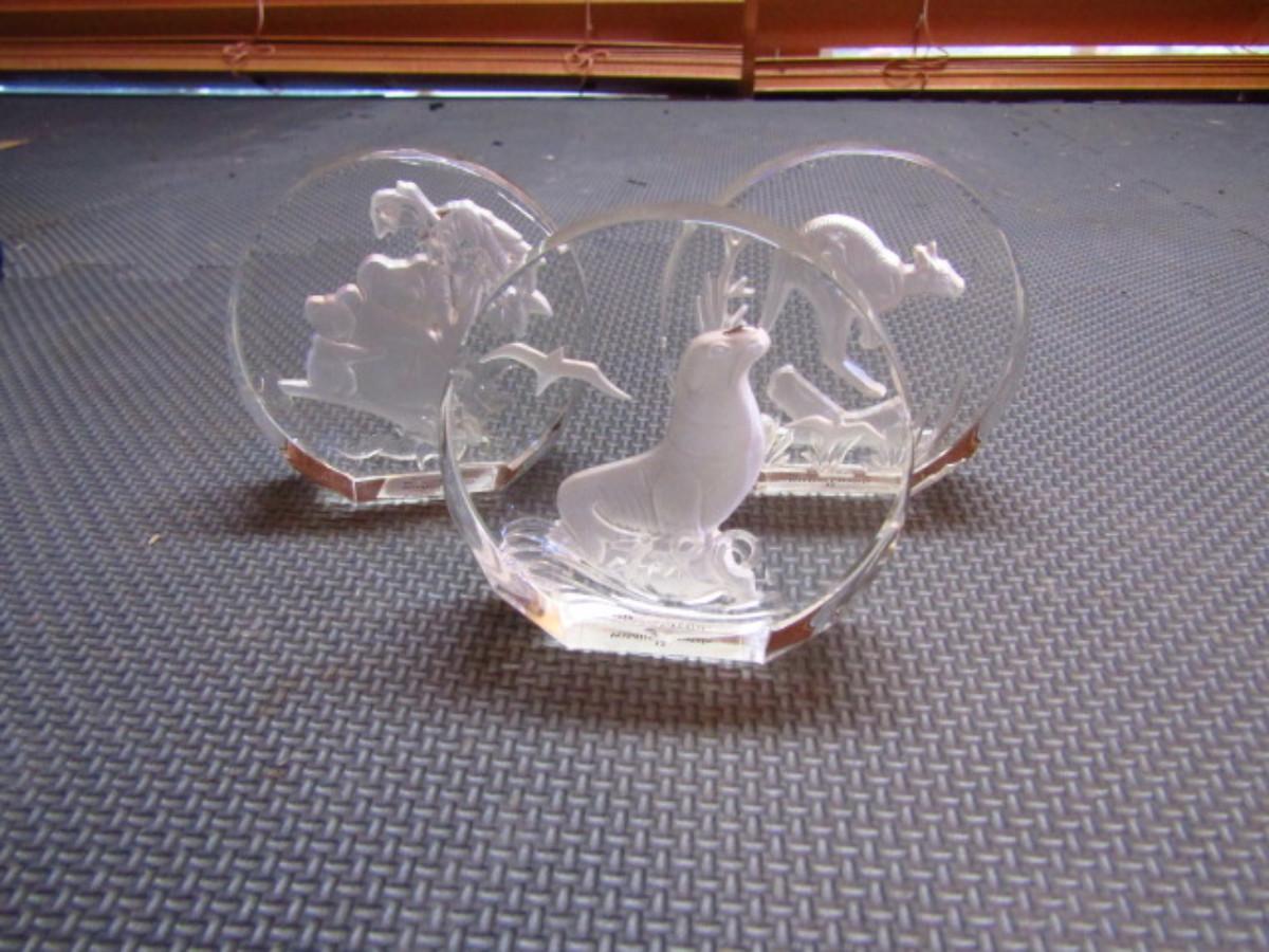 Collection of Crystal Home Decor (G). Three Danbury Mint Wildlife Crystal Figures- kangaroo, kaola, and seal. Etched crystal dish with horse design.