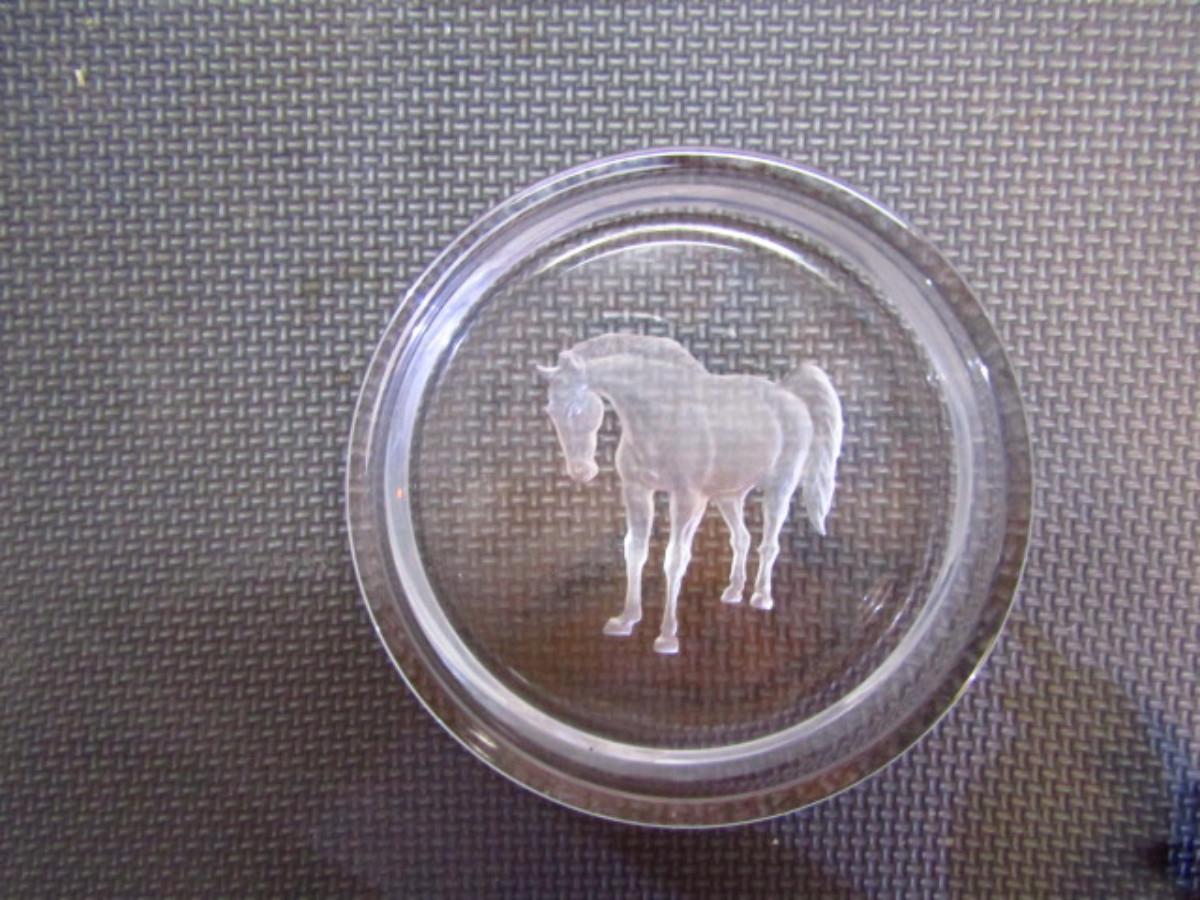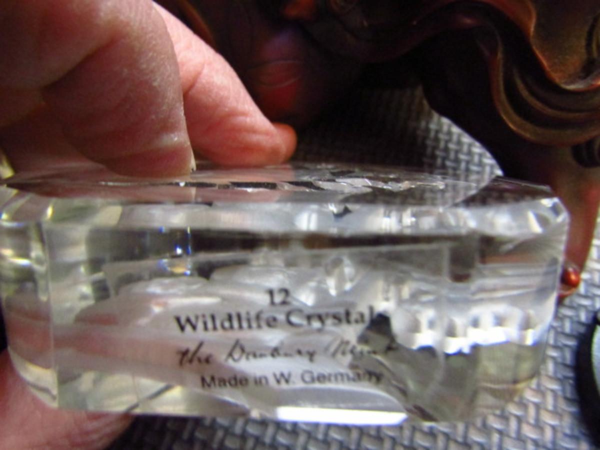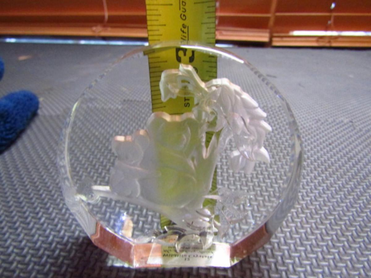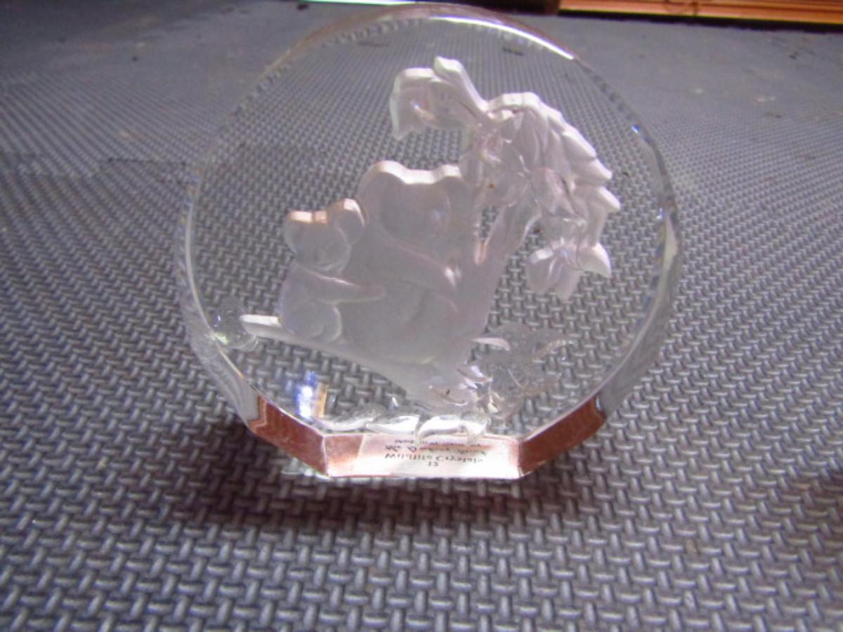 Collection of Crystal Home Decor (G). Three Danbury Mint Wildlife Crystal Figures- kangaroo, kaola, and seal. Etched crystal dish with horse design.