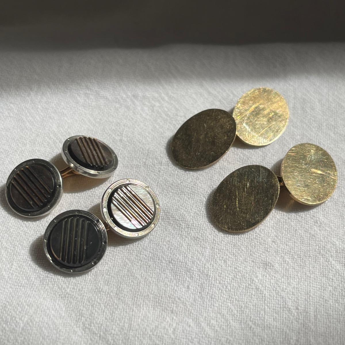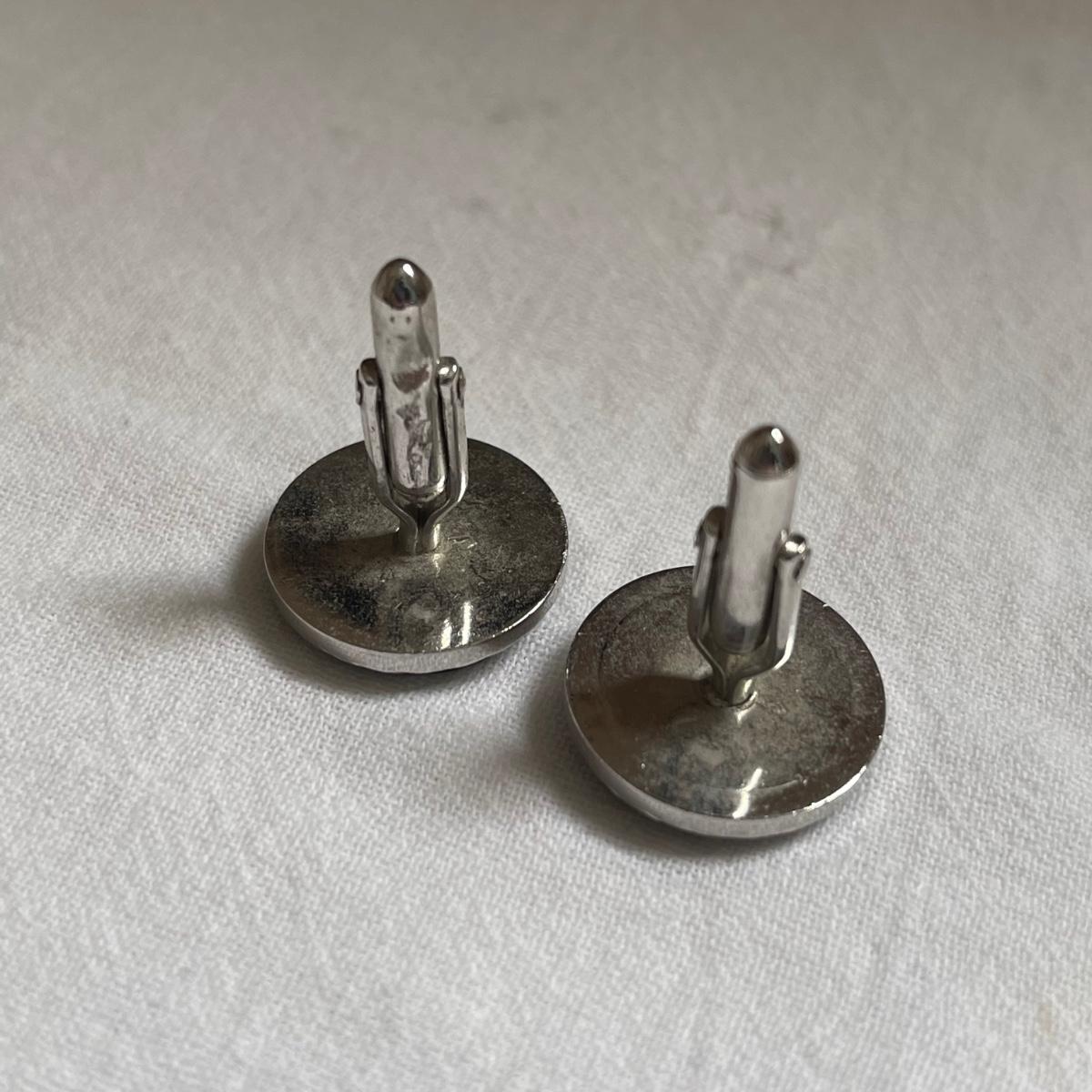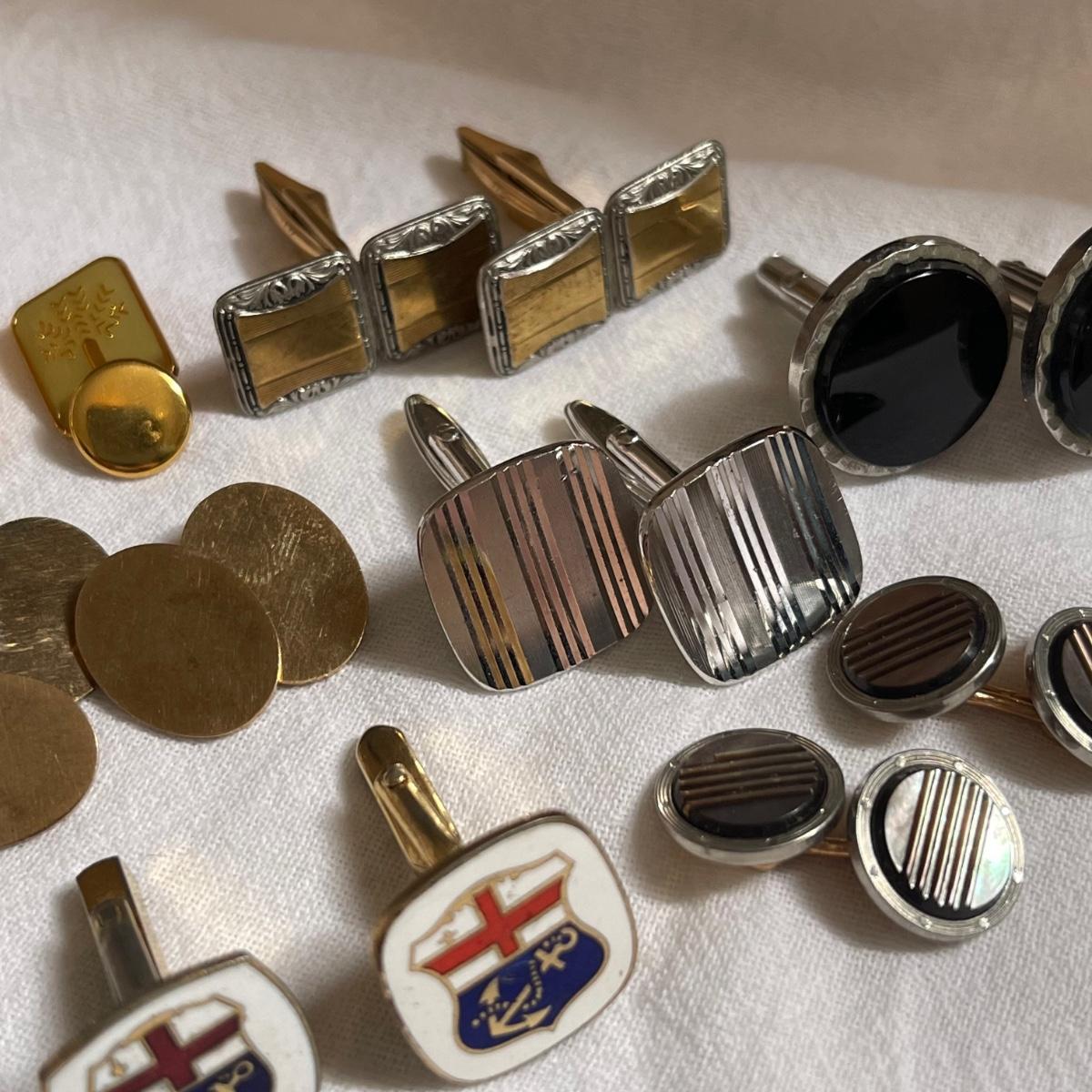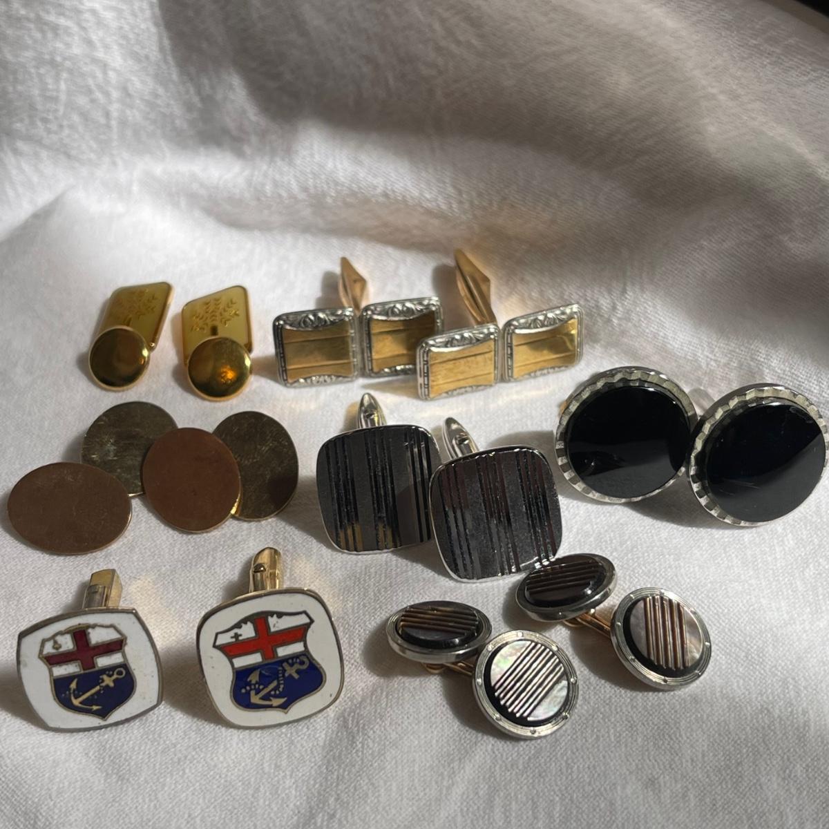 Seven pairs of cufflinks. Two of the cufflinks have the same image on them but different styles of of clips. Some of them had marks although they are difficult to read if they do.