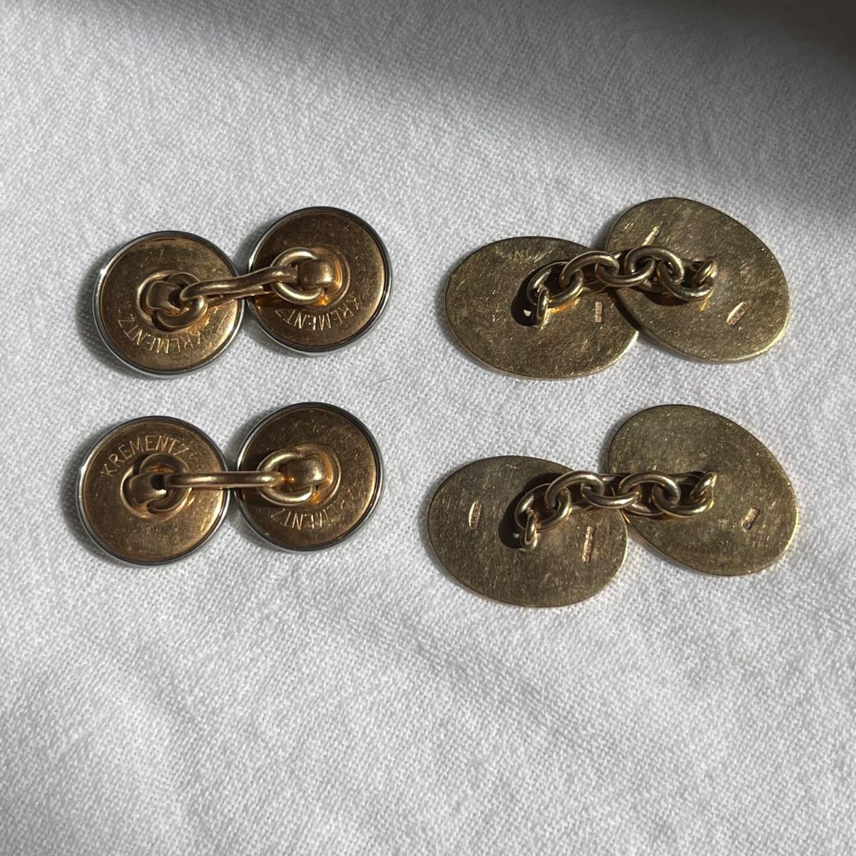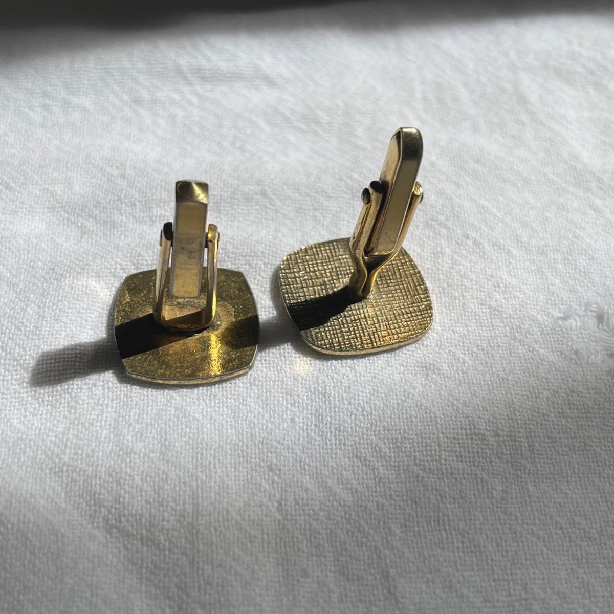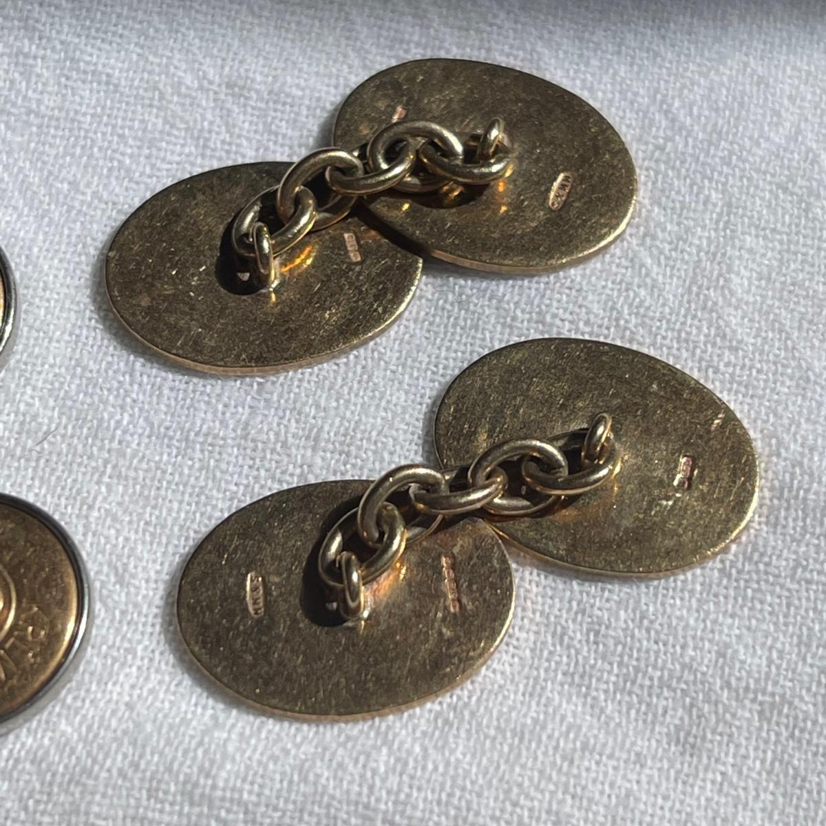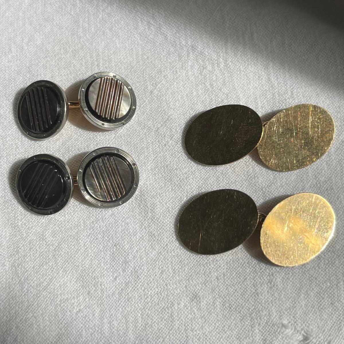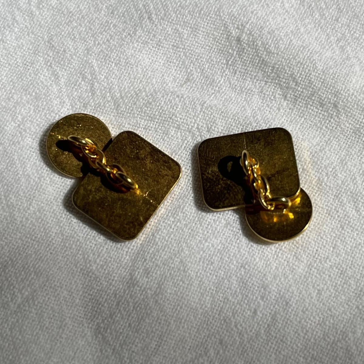 Seven pairs of cufflinks. Two of the cufflinks have the same image on them but different styles of of clips. Some of them had marks although they are difficult to read if they do.