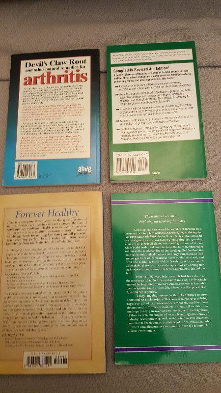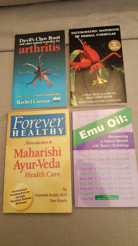 This auction lot is for nice, clean copies of 4 current books on various modern looks at aspects of herbs. All books are softbound. A copy each of Naturopathic Handbook of Herbal Formulas, Emu Oil: Reexaminaing A Natural Remedy with Today's Technology, Forever Healthy: Introduction to Maharishi Ayur-Veda Health Care and Devil's Claw Root and other natural remedies for arthritis. See photos for back cover information. Donated by Kay Whitlock.