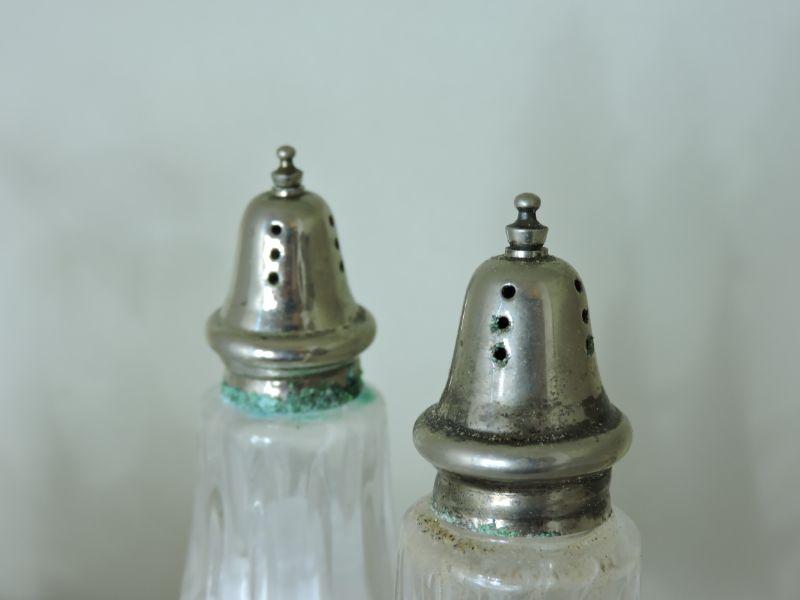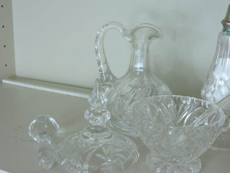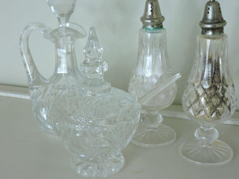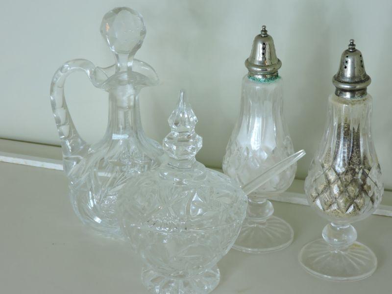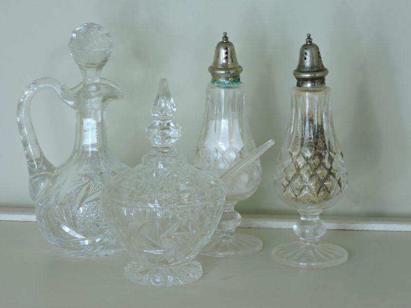Cruet, covered sugar bowl, and salt and pepper shakers. **Please read Terms and Conditions before placing a bid. Pick up is Saturday, November 30 from 9am to 3pm in Bridgeton, NJ. All sales are final. All sales are as is, where is. Please review all photos. Any props included in photos are not included in listing. All measurements are approximate.