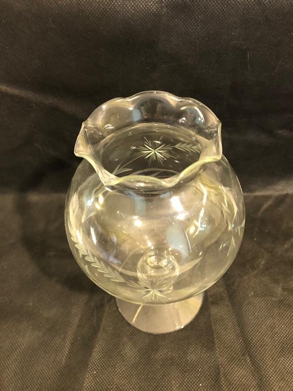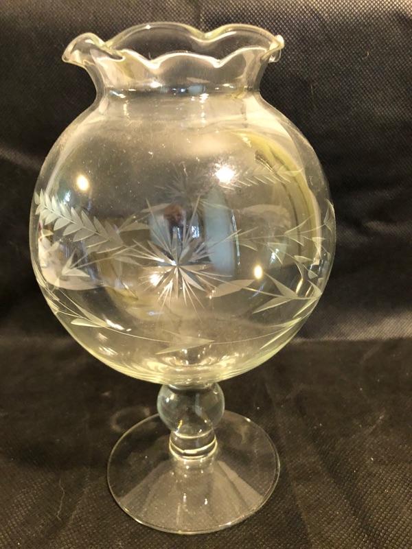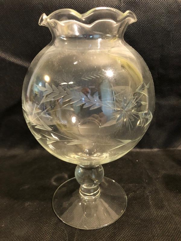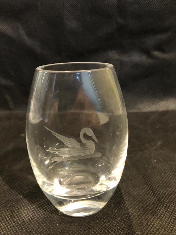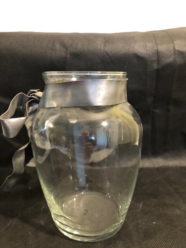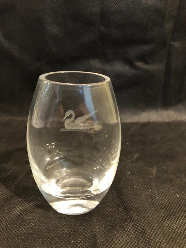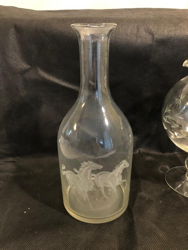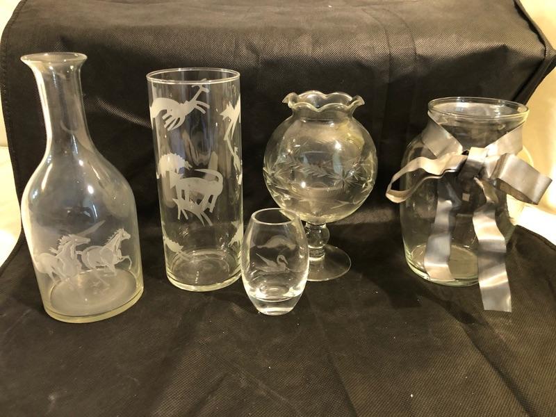 A collection of 5 glass vases of varying cut glass/frosted designs New Mexican vase is 8.5in tall x3.5 diameter, the metal bow vase is 7in tall x 3.5 diameter, Horse decanter is 9.5 in tall with 2in diameter opening, swan bud vase is 4in tall x 1.5in diameter and the vintage bowl is 7.5in tall with 3in diameter