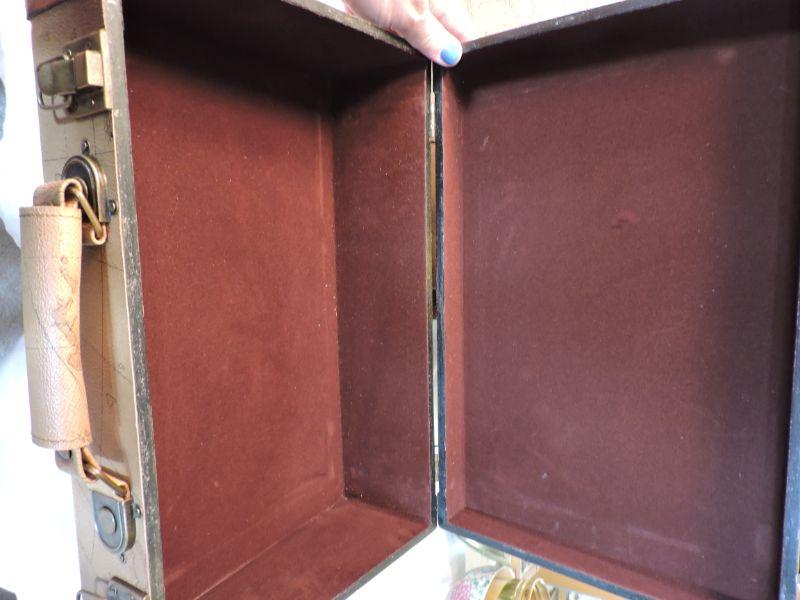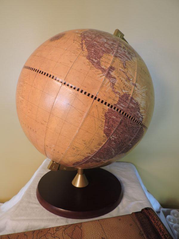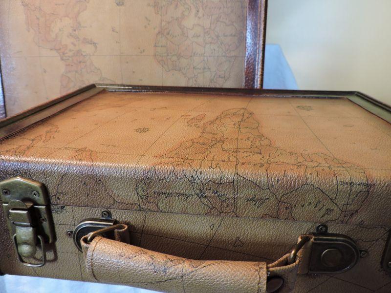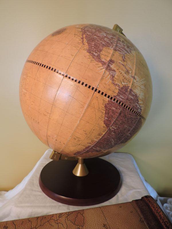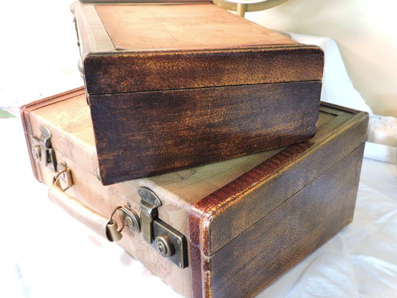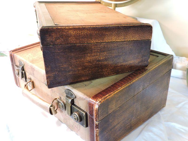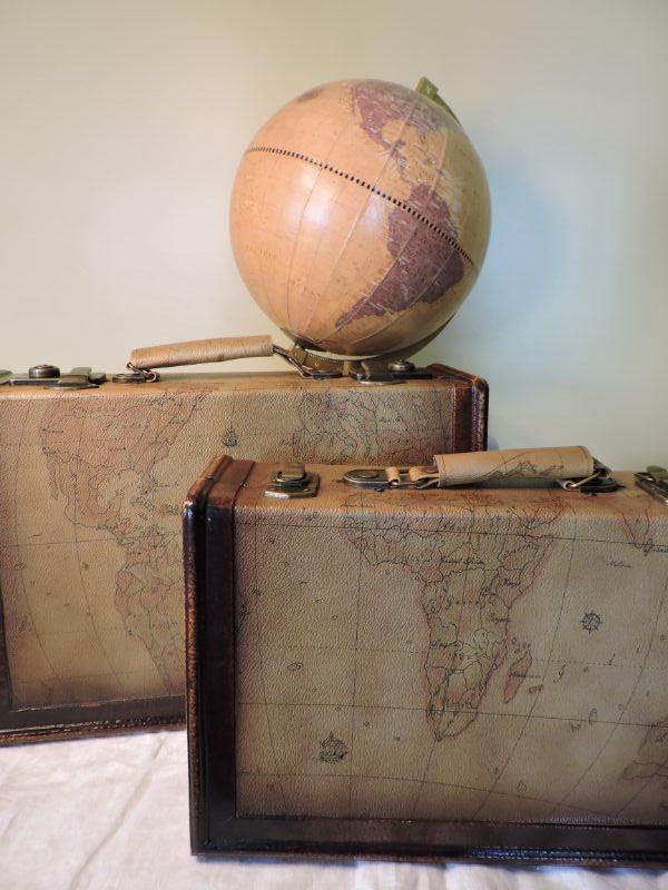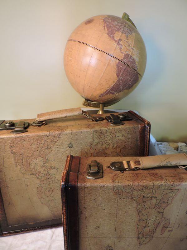 Two suitcases in a vintage patina and a vintage looking globe. Globe is 18" High, Suitcases are 12 and 15. **Please read Terms and Conditions before placing a bid. Pick up is Wednesday, September 25 from 4pm to 7pm and Saturday, September 28 from 9am to 1pm in Williamstown, NJ. All sales are final. All sales are as is, where is. Please review all photos. Any props included in photos are not included in listing. All measurements are approximate.