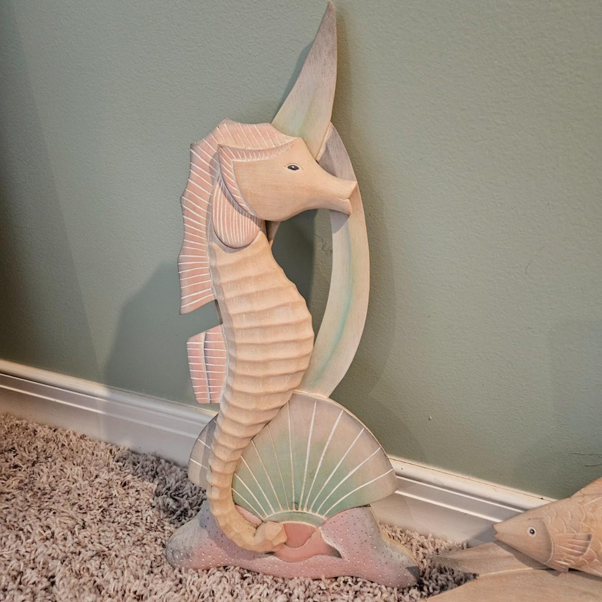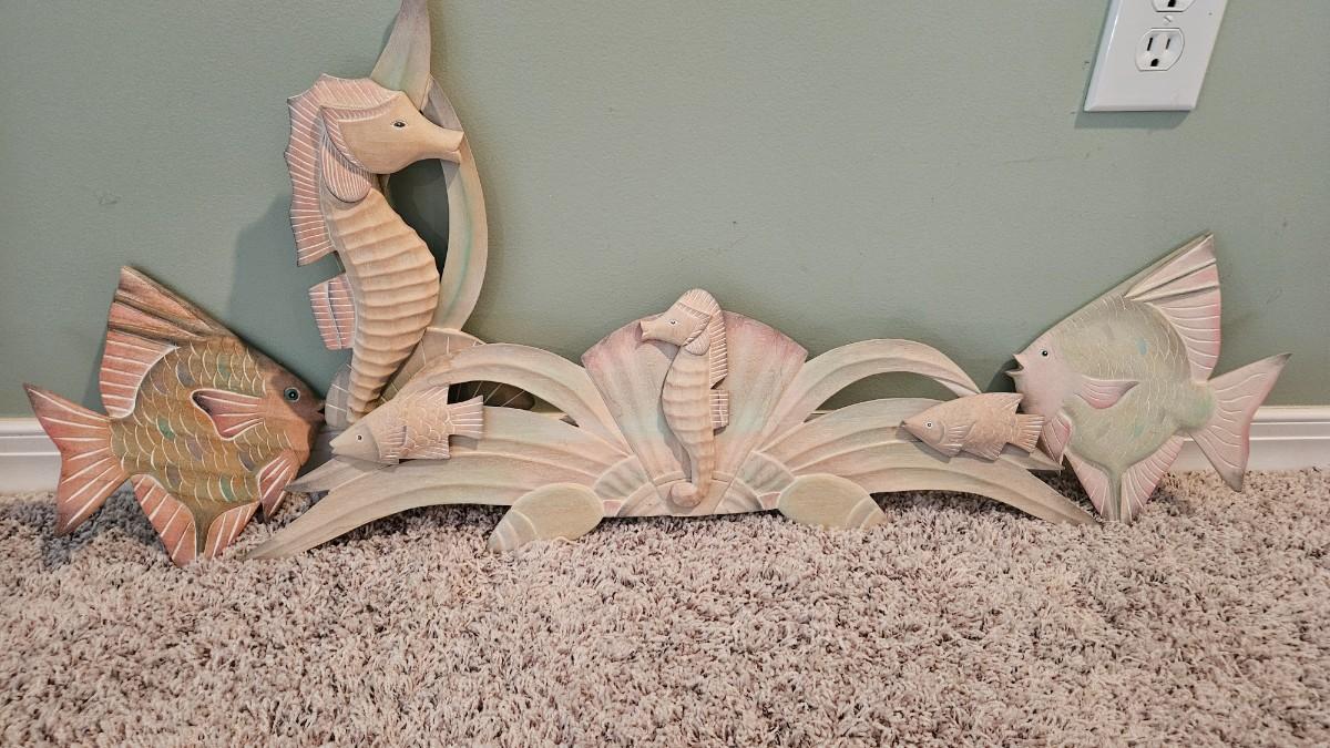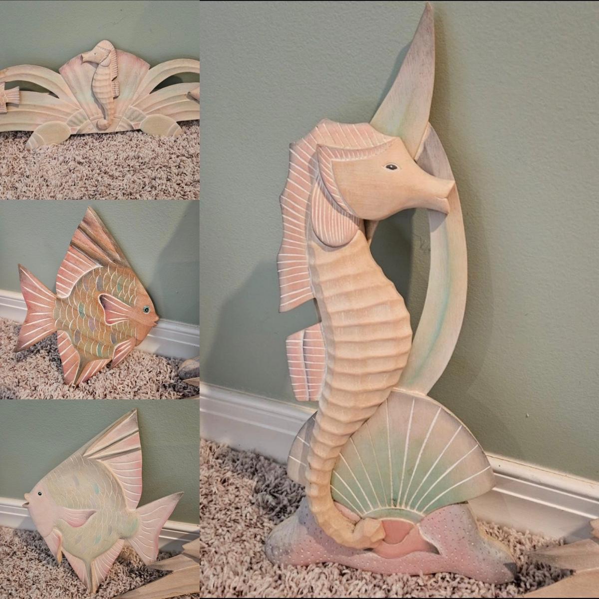 A collection of four decorative fish and seahorses made of wood and painted with soft pastels tones. The largest piece measures approximately 27.5" x 8 5"H. Shipping available