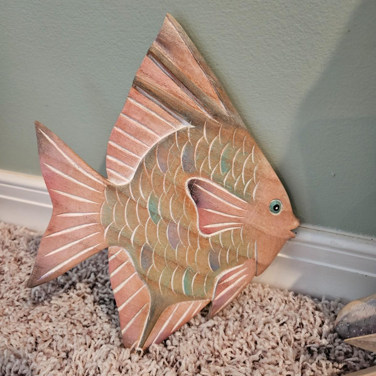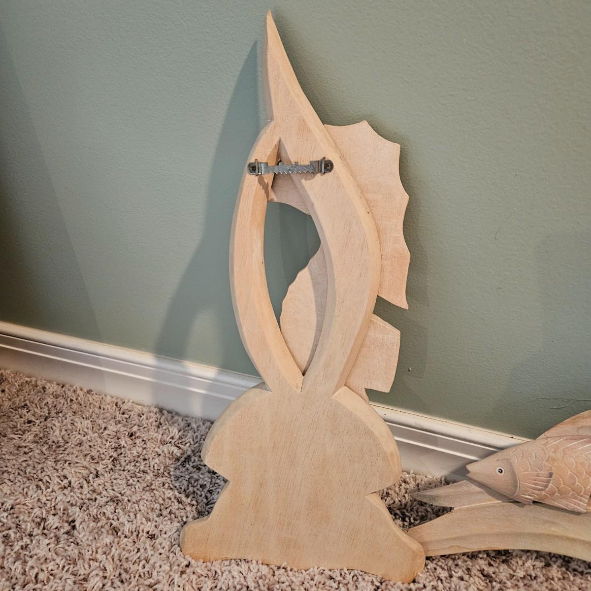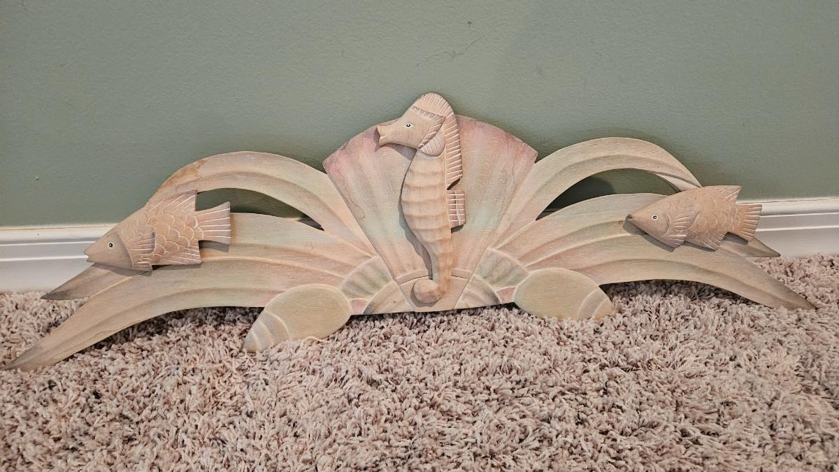 A collection of four decorative fish and seahorses made of wood and painted with soft pastels tones. The largest piece measures approximately 27.5" x 8 5"H. Shipping available