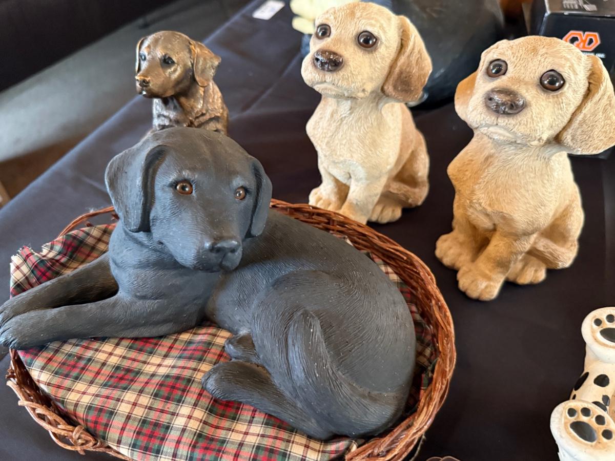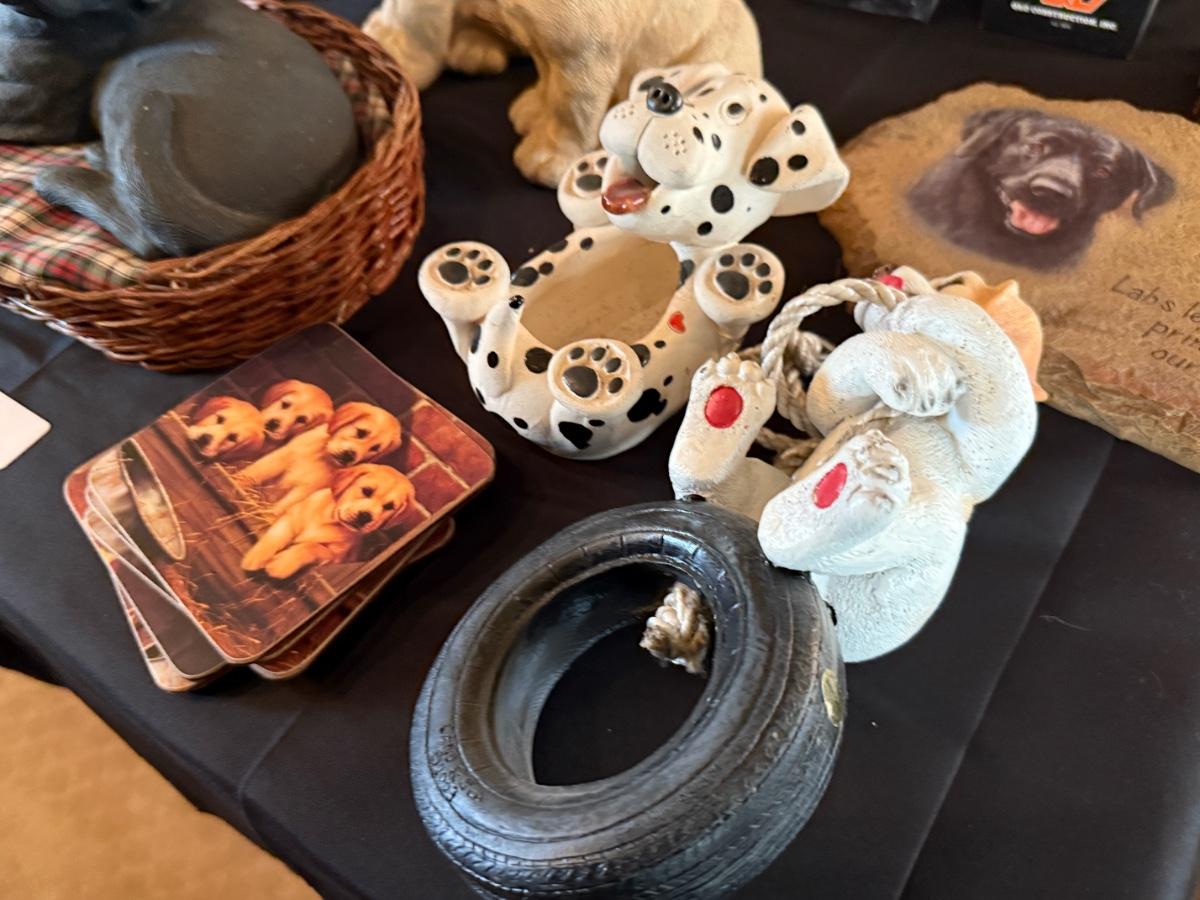 Collection of Dog figures - Coasters/Stone/Pair/1 in Basket/1 on tire swing +