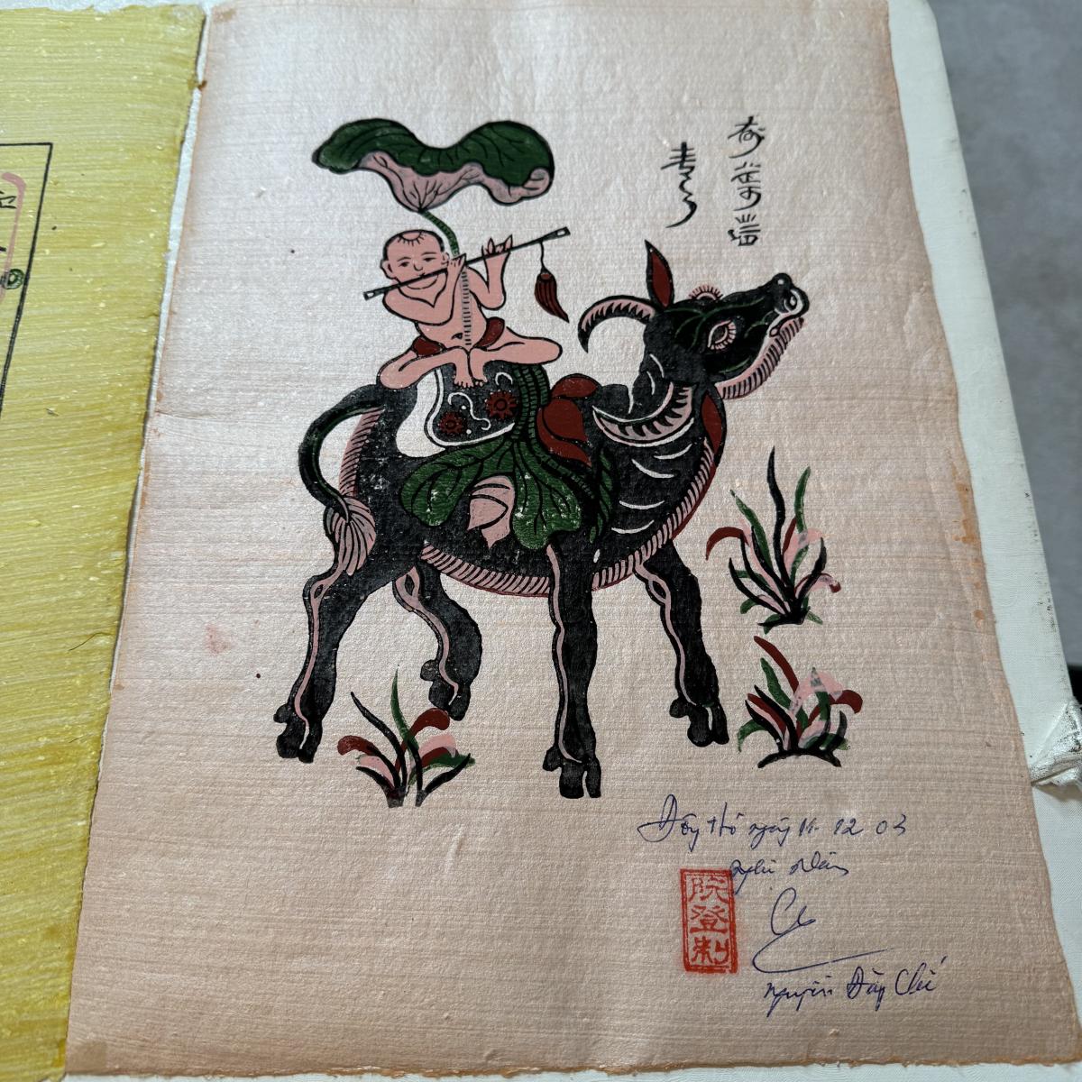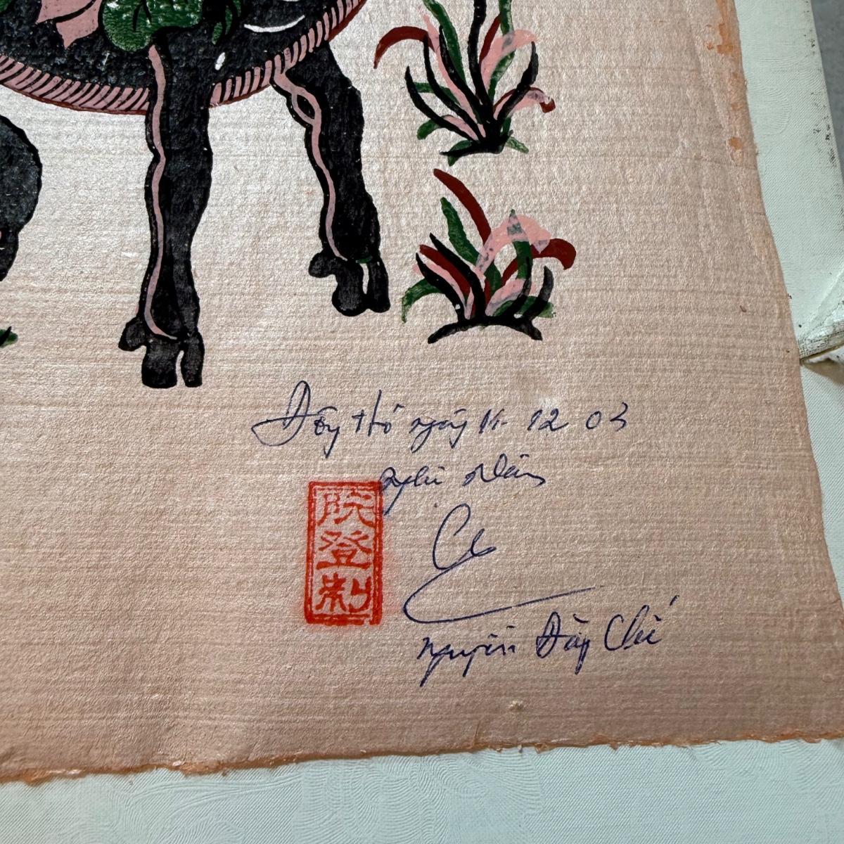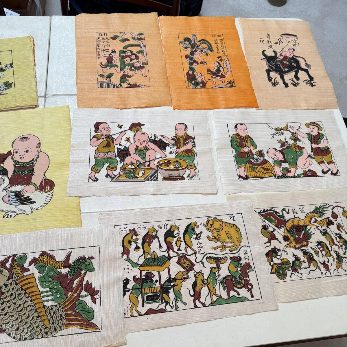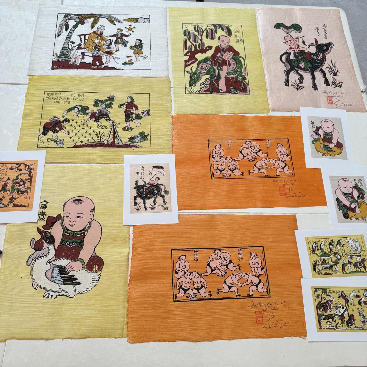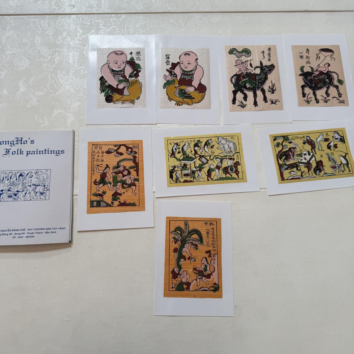 This lot features a fascinating and fairly large collection of Vietnamese artist DongHo’s folk art. Included in this collection are 23 larger prints of depicting various scenes on 10” x 15” what appears to be handmade rice-paper. Of these larger prints three are signed and stamped with a small note. Also included are eight greeting cards featuring mini versions of some of the same scenes. These measure 5” x 7”. See pictures for details. Shipping available.