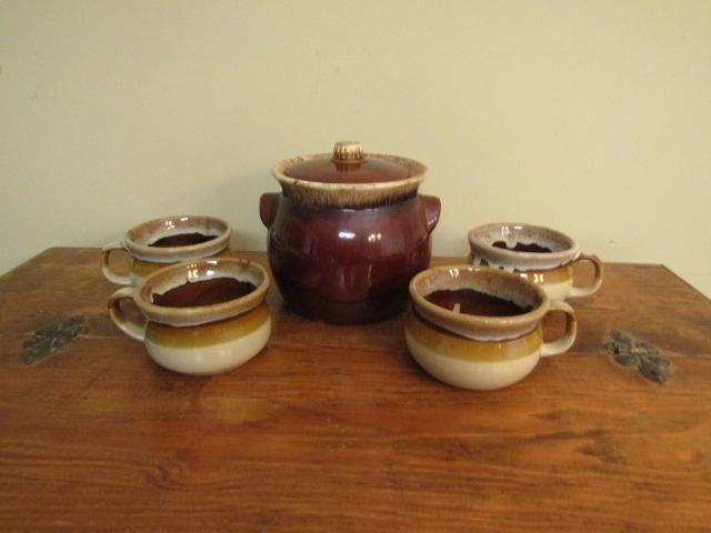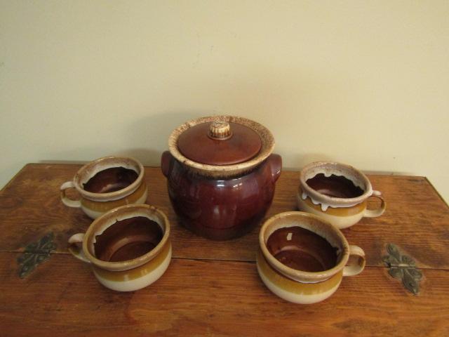 Collection of Drip Glaze Pottery Includes Hull Beanpot and Unmarked Soup Cups