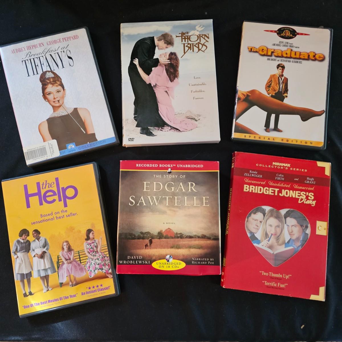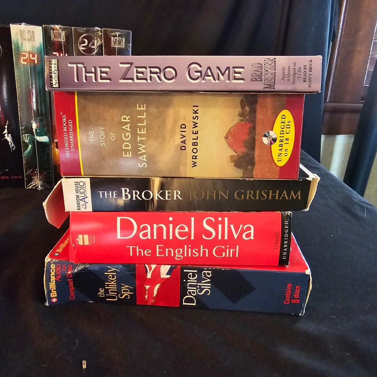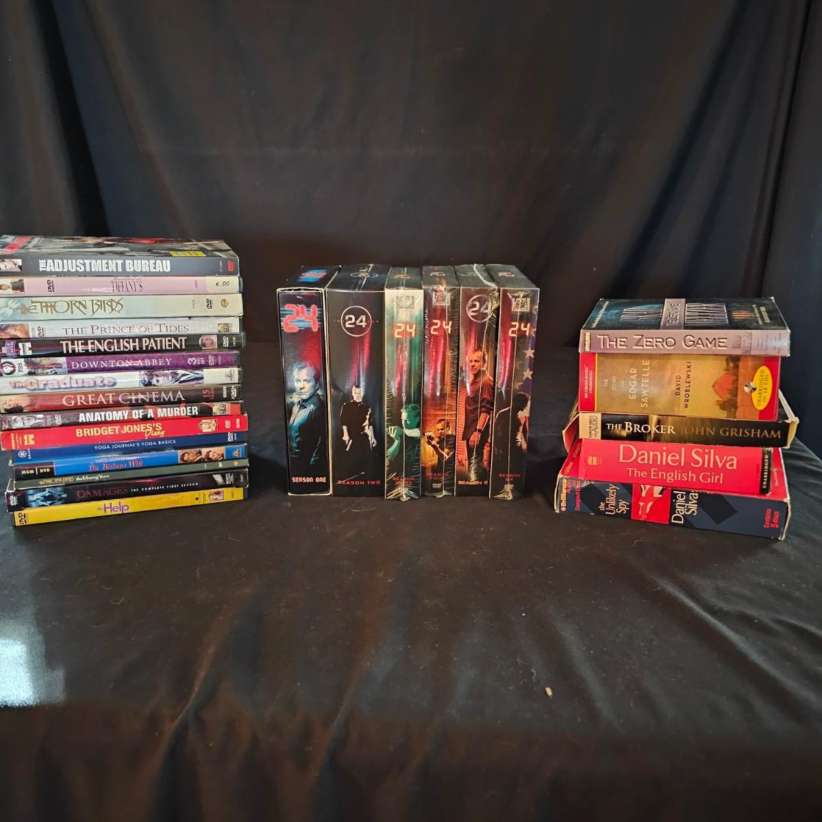 A variety of titles and genres for viewing enjoyment. Classics and newer titles. The first six seasons of '24', still sealed in package. Five different audio books, by Grisham, Daniel Silva and others. See photos for details. Shipping available.