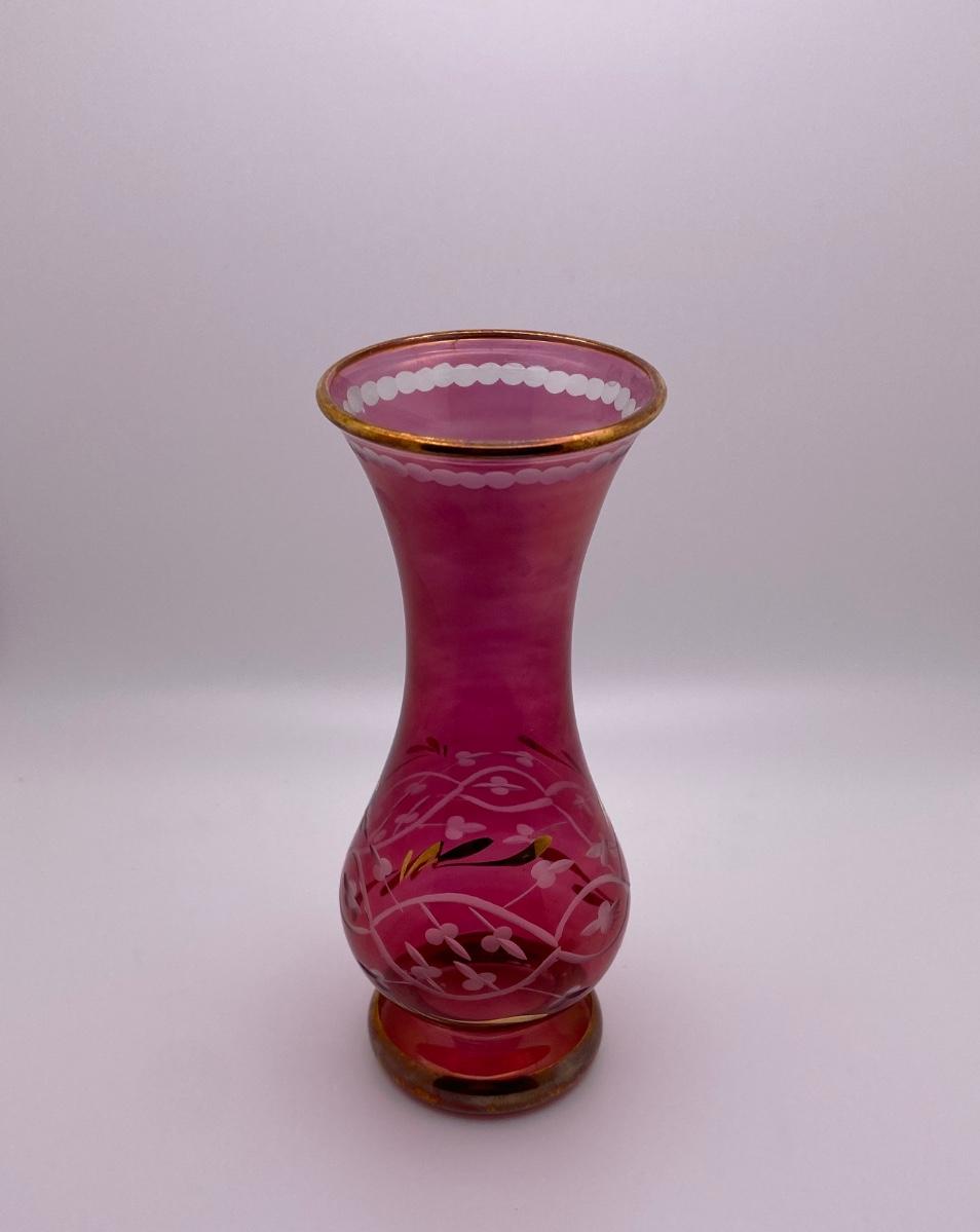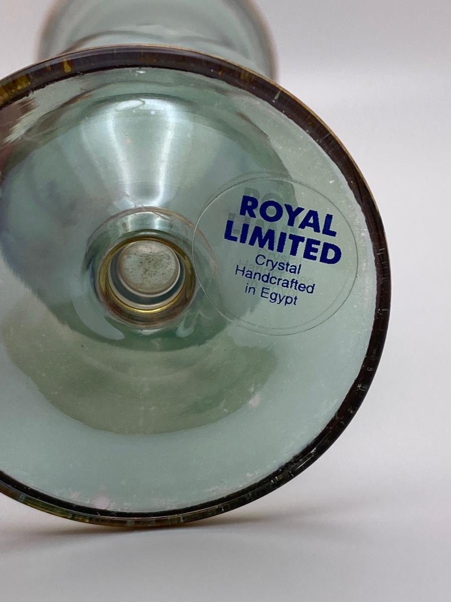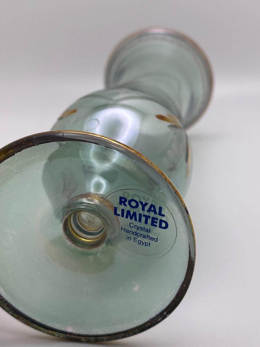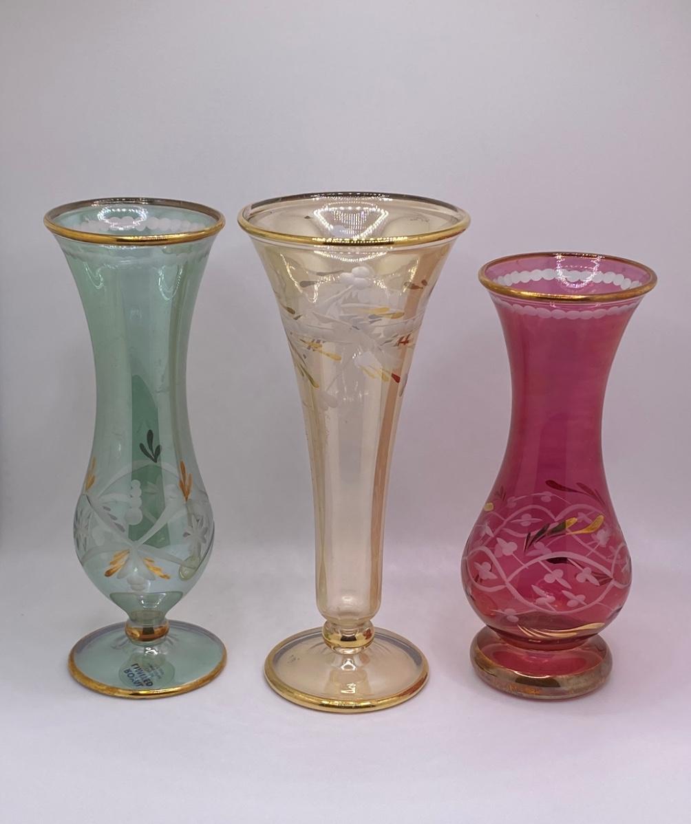 Collection of Royal Limited Crystal Handcrafted in Egypt Vases. Amber Tone Vase is 6.75in T. Emerald Tone Vase is 6.5in T. Cranberry Tone Vase is 5.75in T