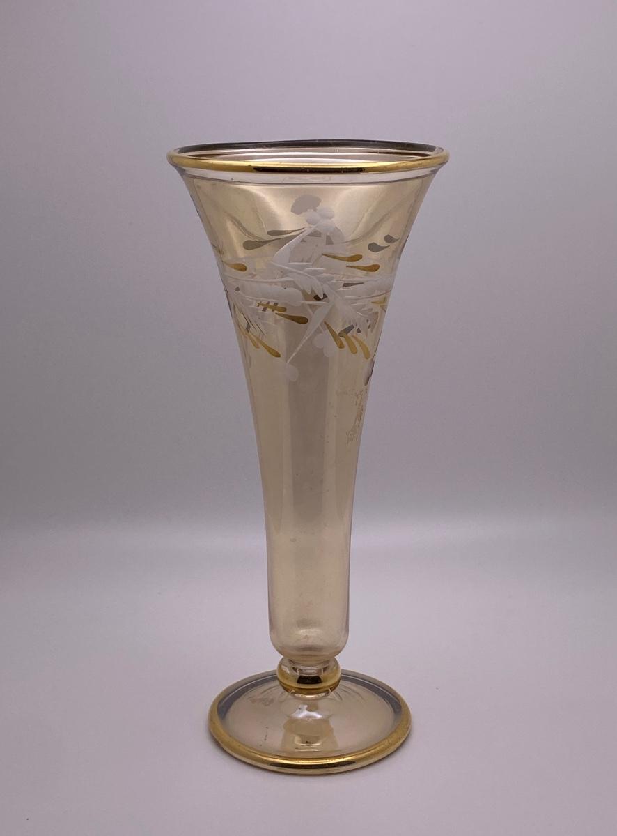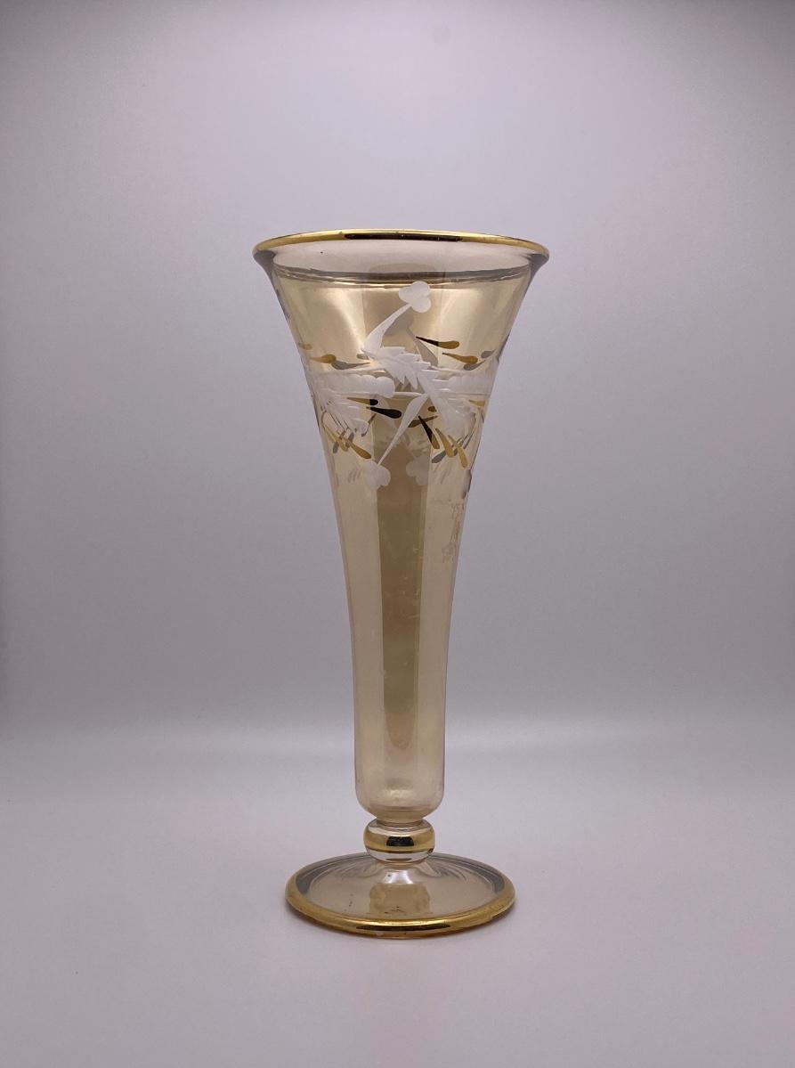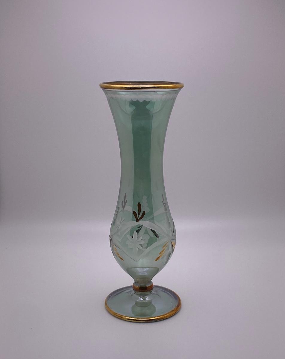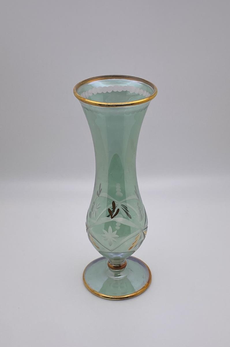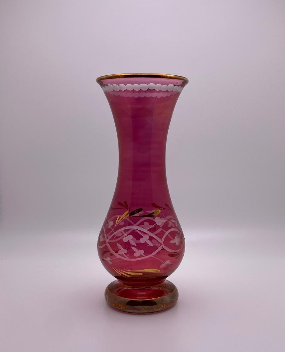 Collection of Royal Limited Crystal Handcrafted in Egypt Vases. Amber Tone Vase is 6.75in T. Emerald Tone Vase is 6.5in T. Cranberry Tone Vase is 5.75in T