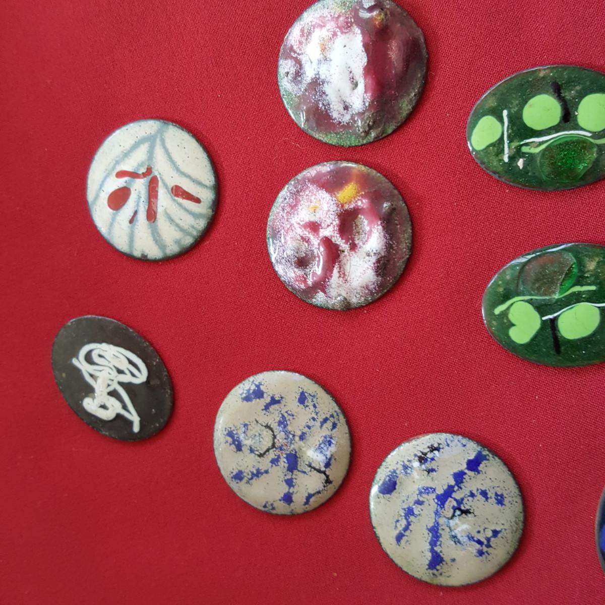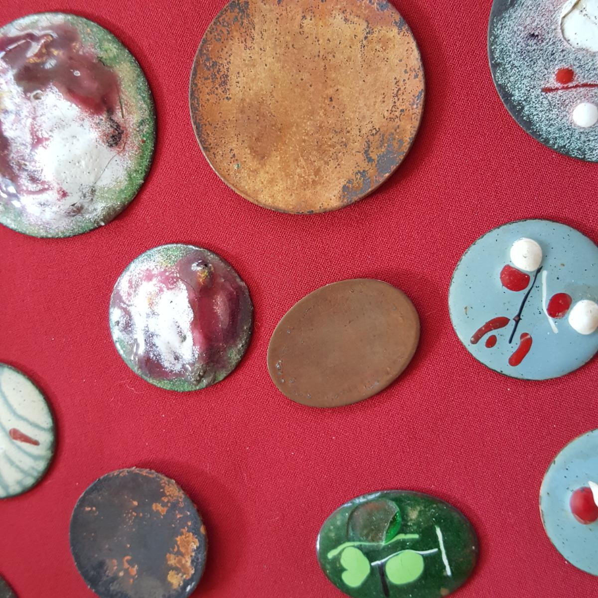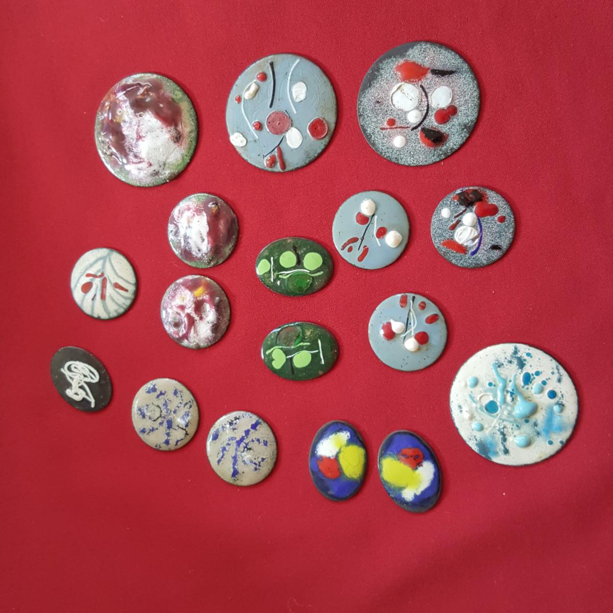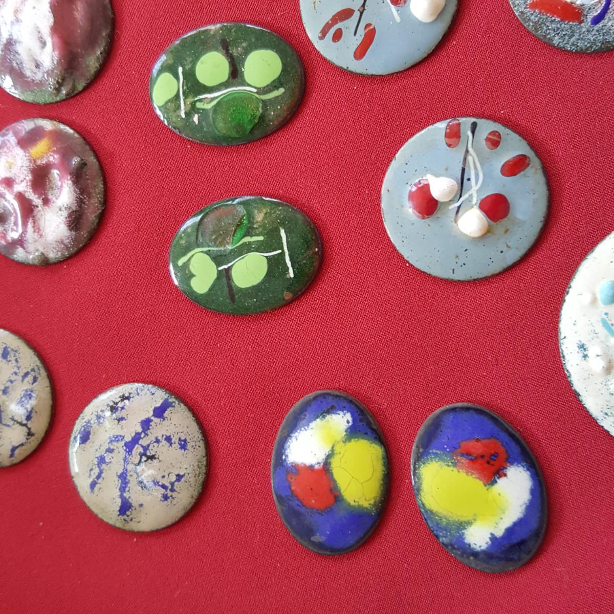 This auction lot is for a Collection of Enamel on Copper Artist Pieces. There are 17 pieces in the gathering. Each is a unique item designed by an enamel artist, appears several were intended to be matching items. Use them for special projects or jewelry - your creativity will shine with these gems.