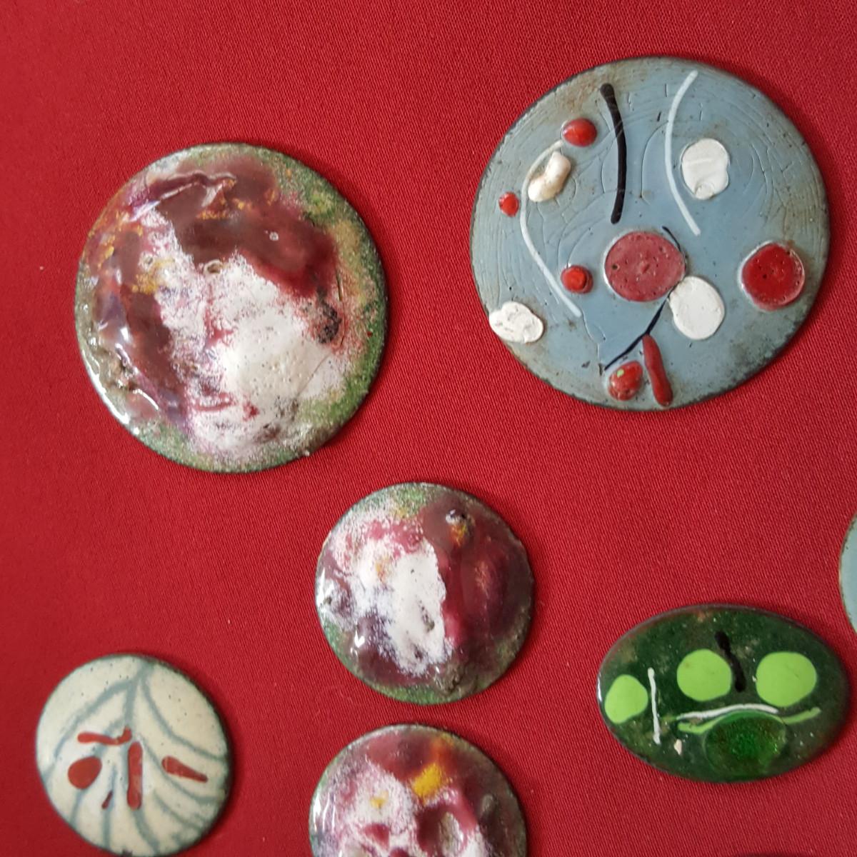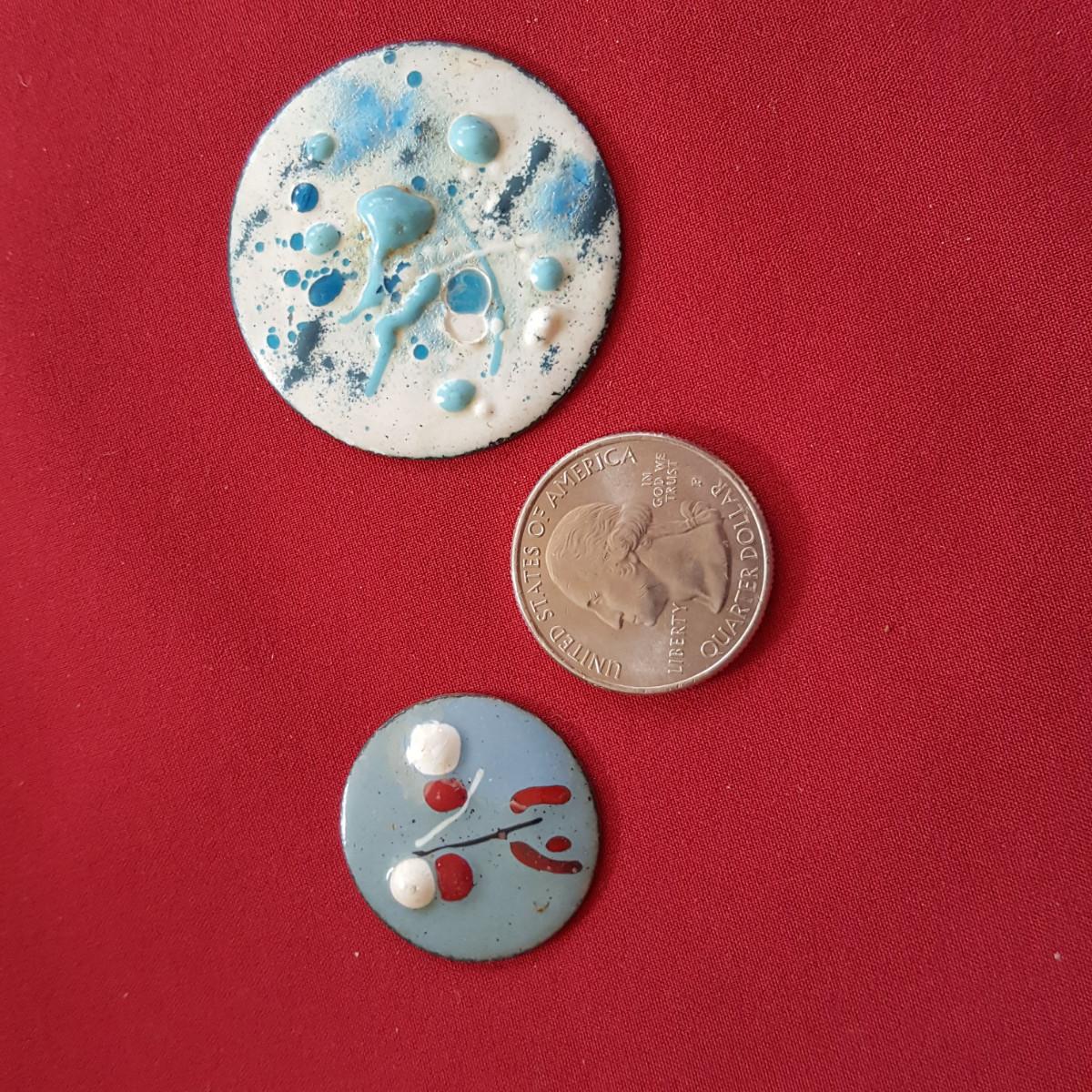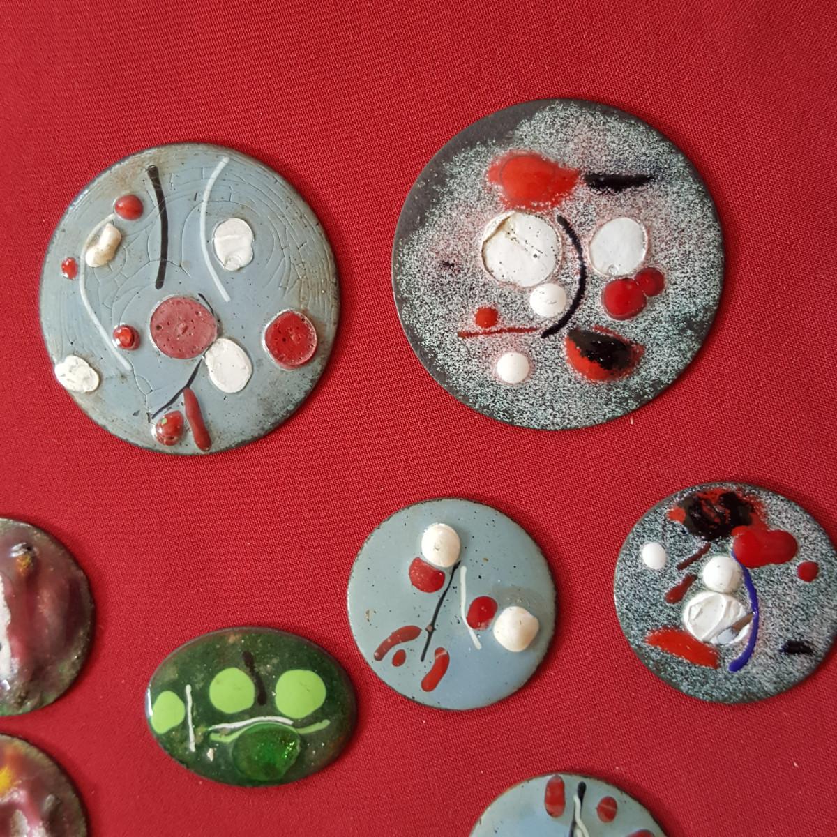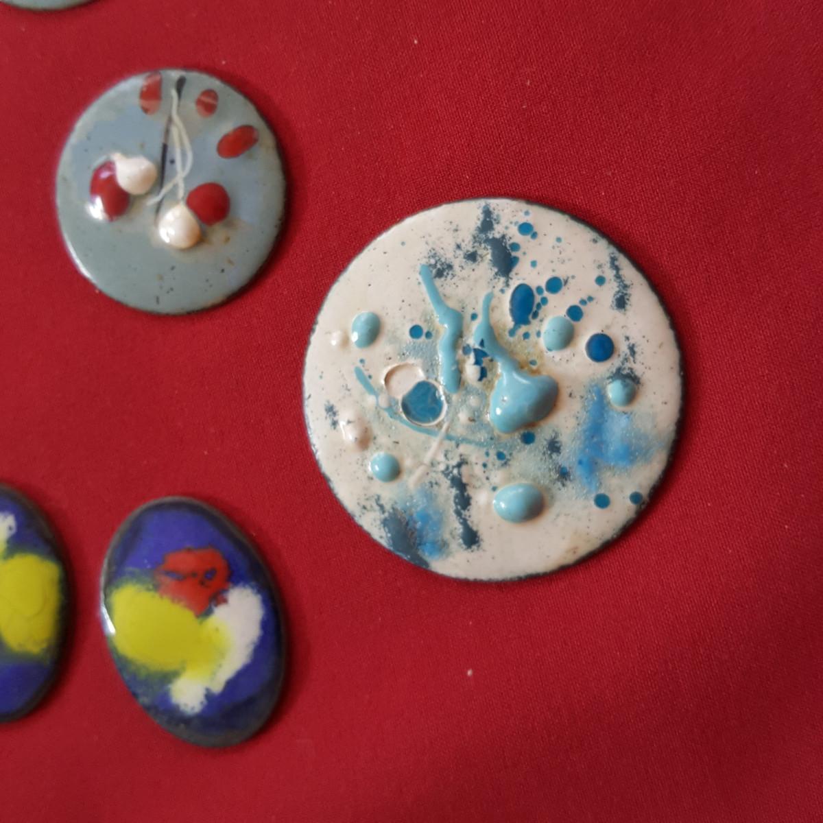 This auction lot is for a Collection of Enamel on Copper Artist Pieces. There are 17 pieces in the gathering. Each is a unique item designed by an enamel artist, appears several were intended to be matching items. Use them for special projects or jewelry - your creativity will shine with these gems.