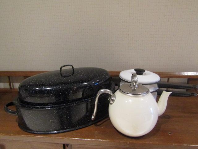 Collection of Enamel Ware Cookware Tea Kettle, Roasting Pan, Double Broiler Pan