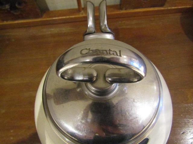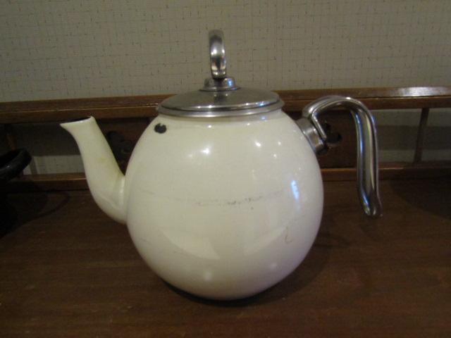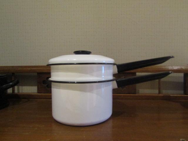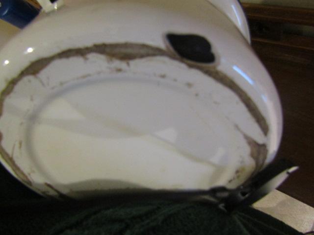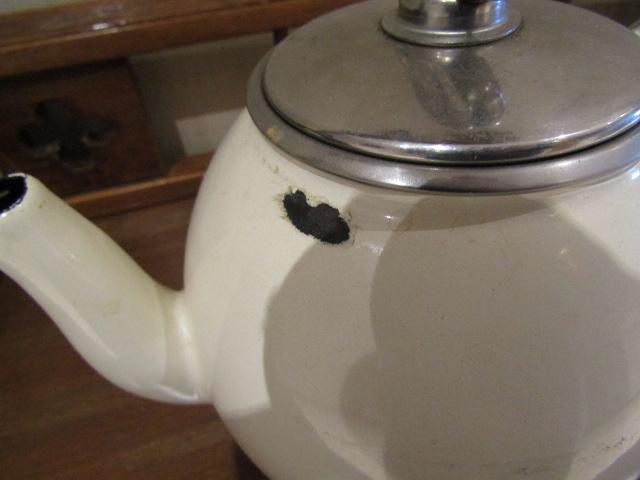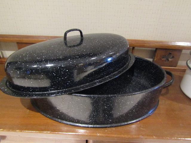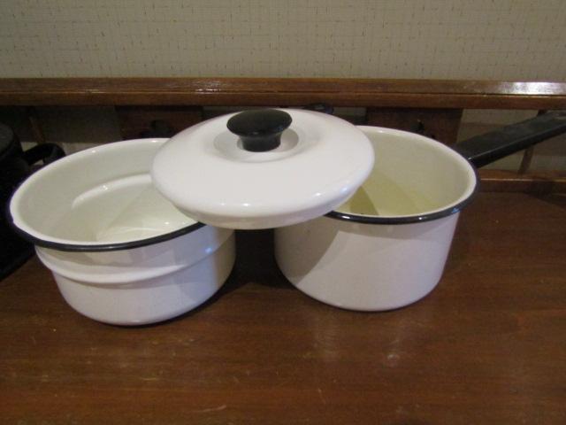 Collection of Enamel Ware Cookware Tea Kettle, Roasting Pan, Double Broiler Pan some chips in enamel on items