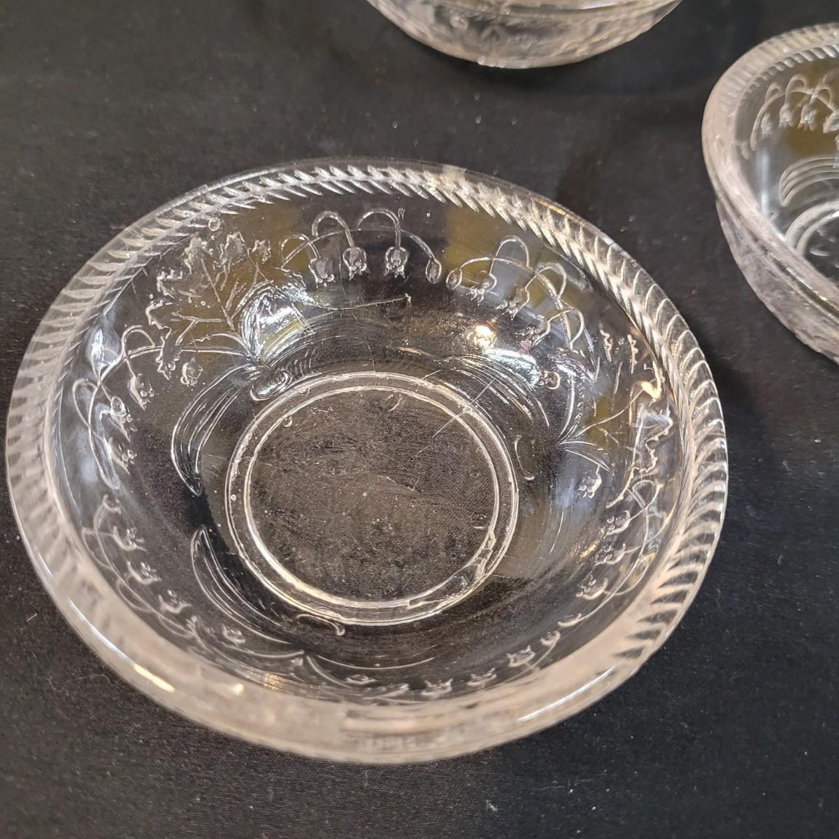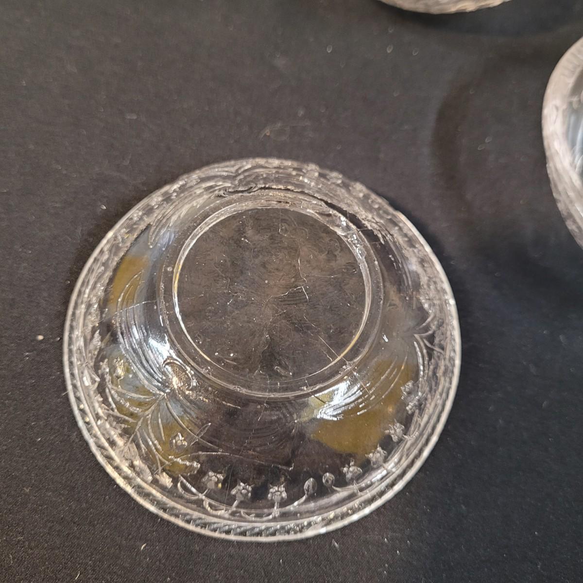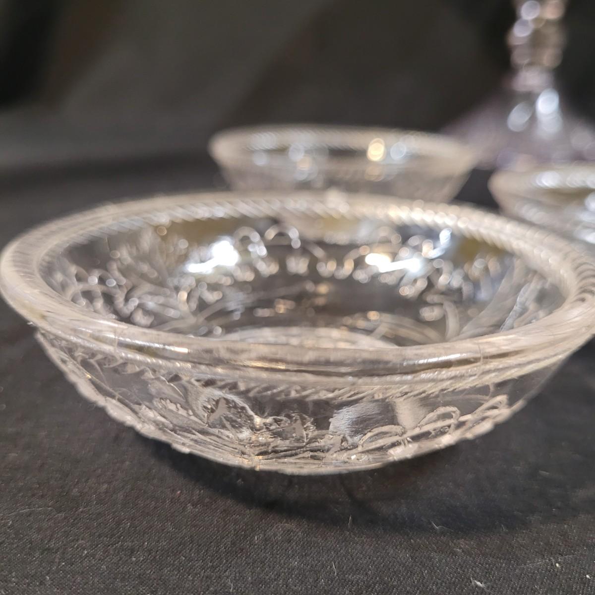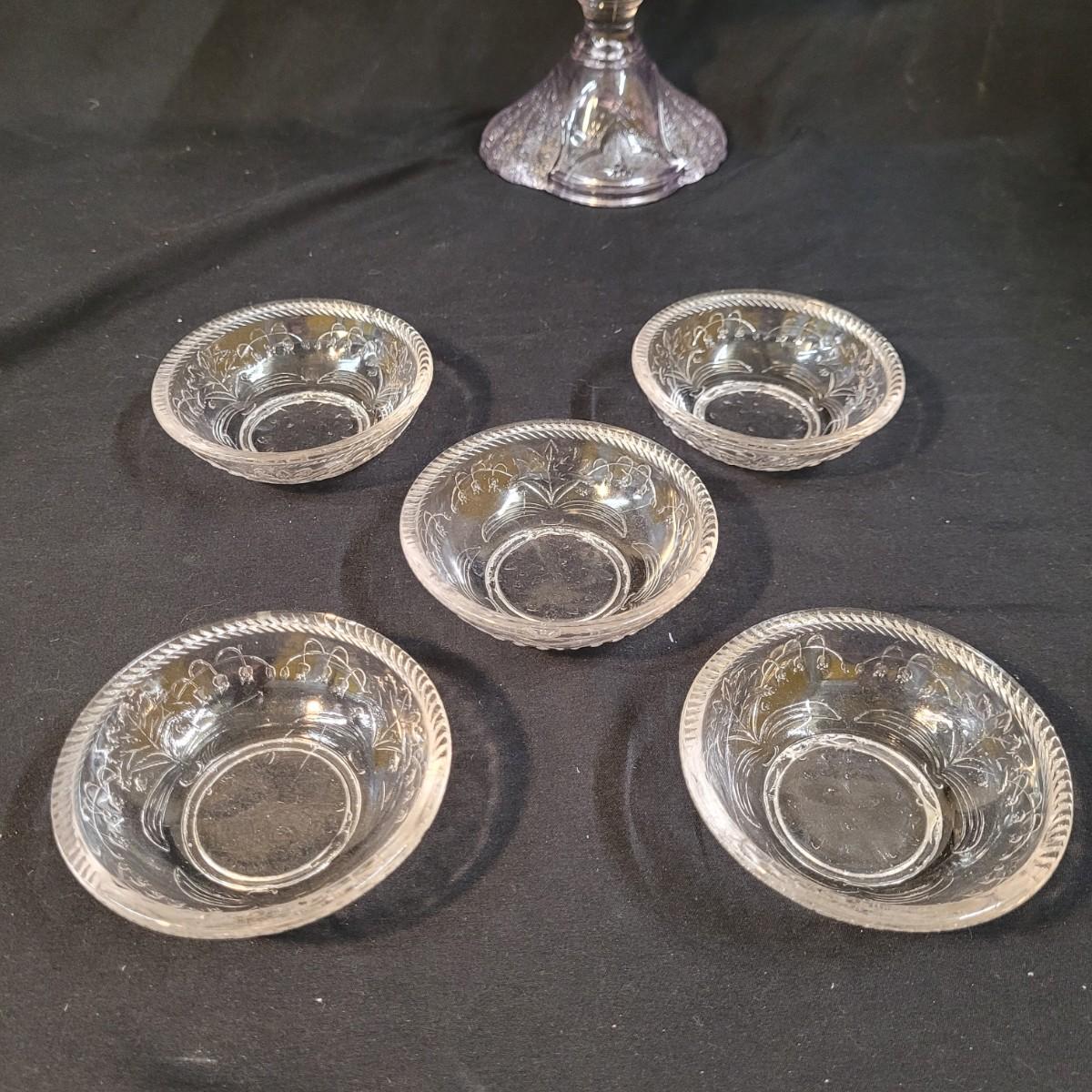 Glass serving ware pieces include standing scallop edged serving dish with matching small sauce dish, and five small sauce bowls. Slight chipping in bowls (see photos). Standing dish measures approximately 10"DIA x7.5"H. Shipping available.