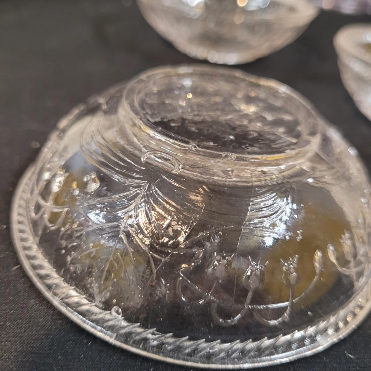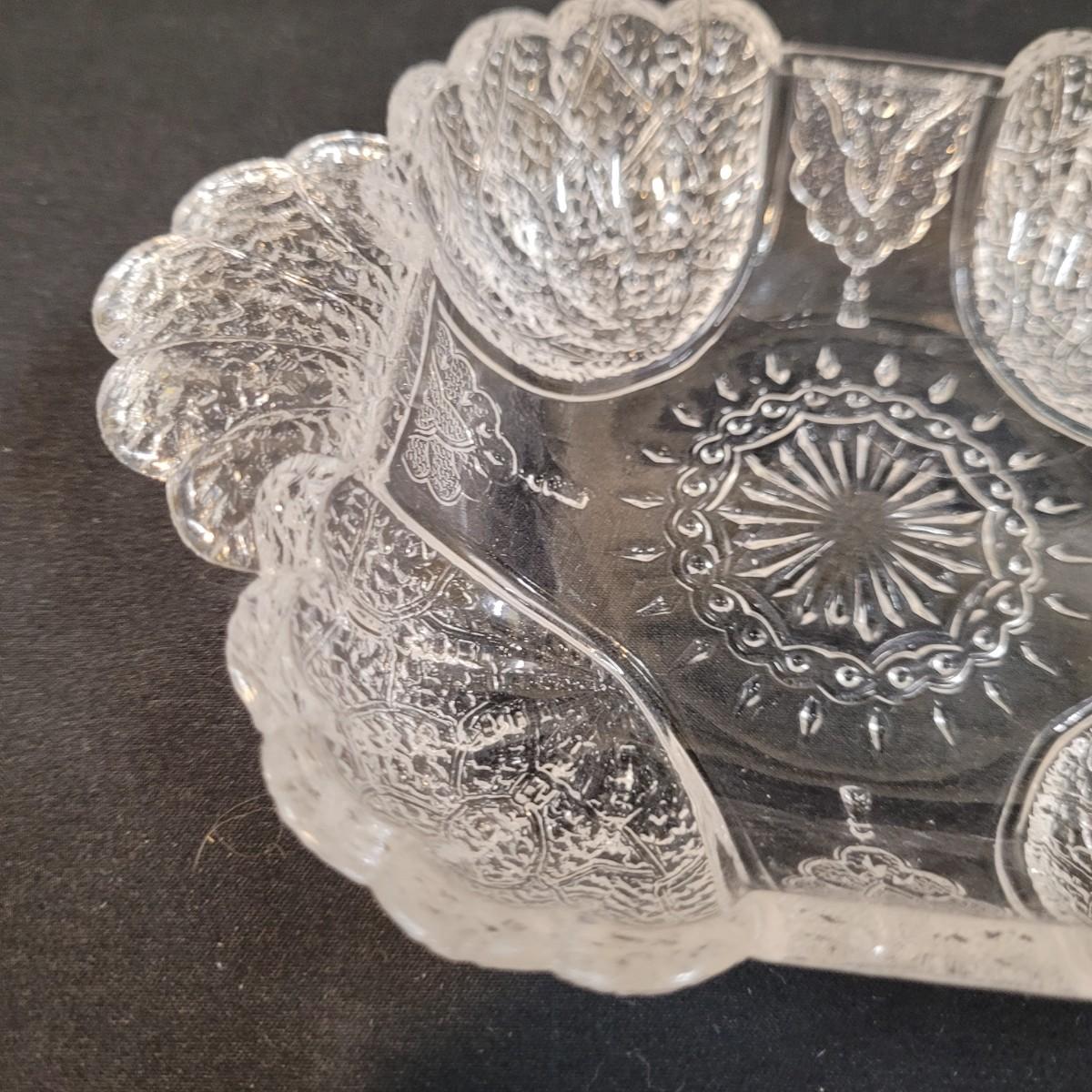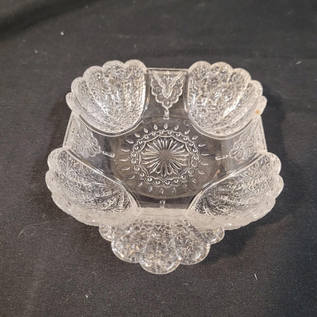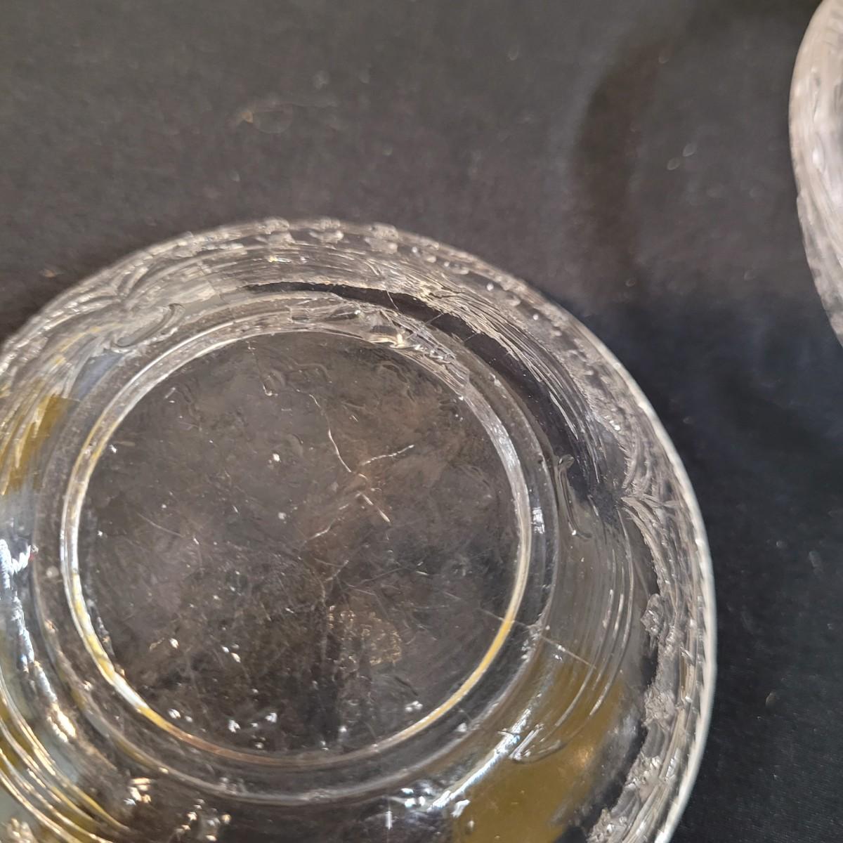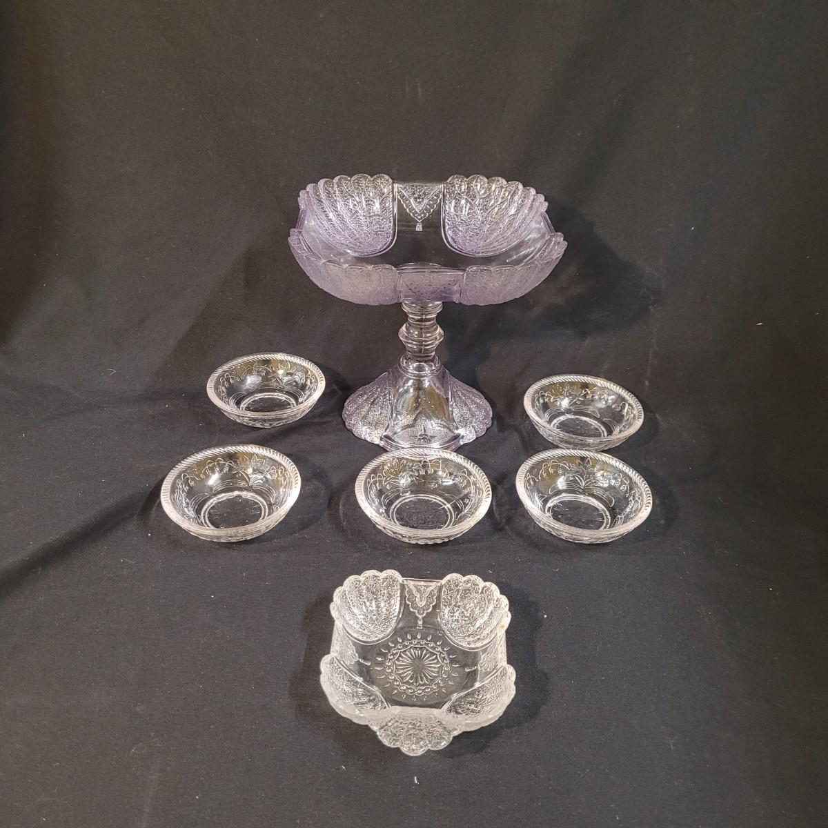 Glass serving ware pieces include standing scallop edged serving dish with matching small sauce dish, and five small sauce bowls. Slight chipping in bowls (see photos). Standing dish measures approximately 10"DIA x7.5"H. Shipping available.