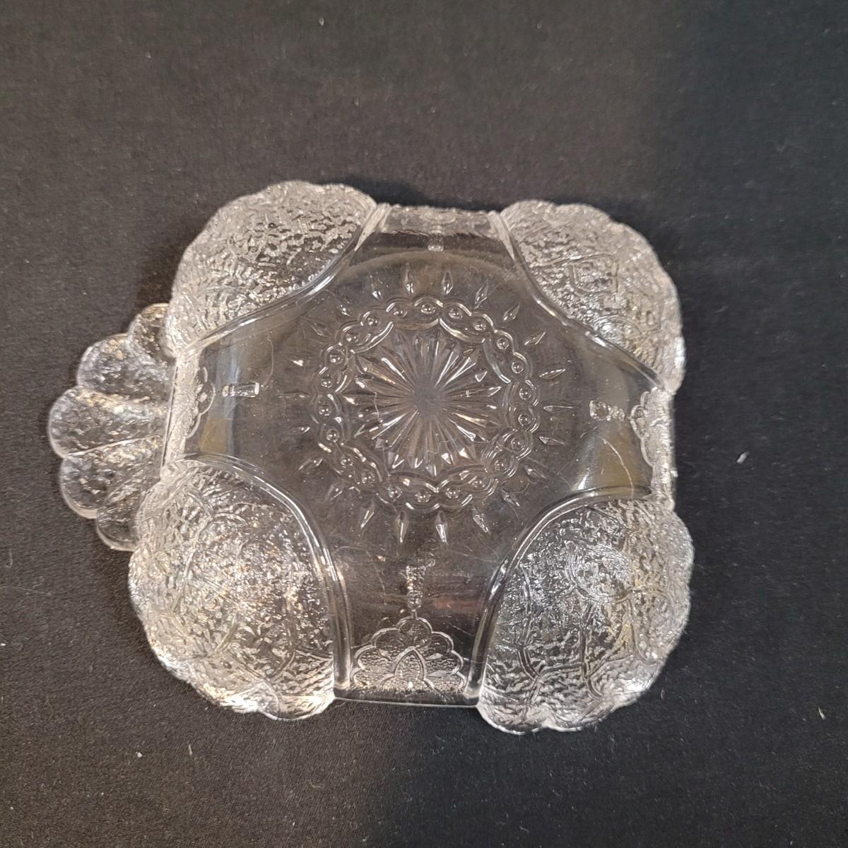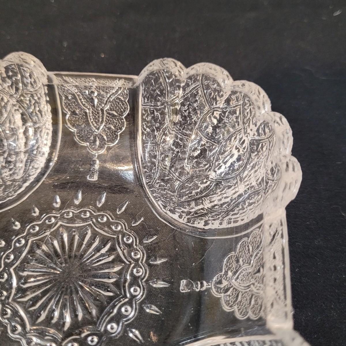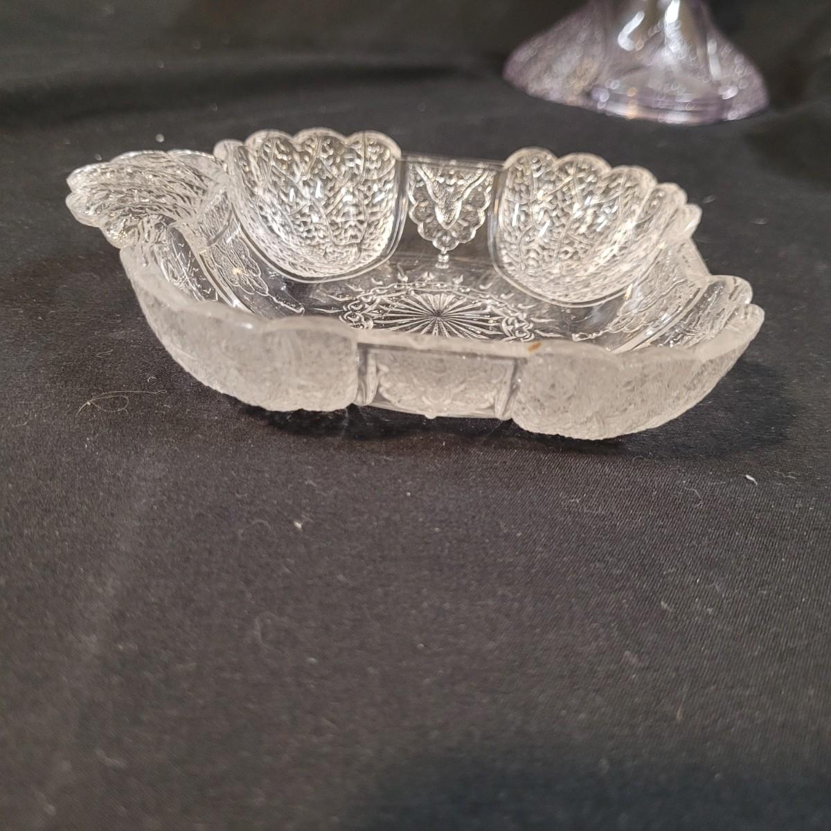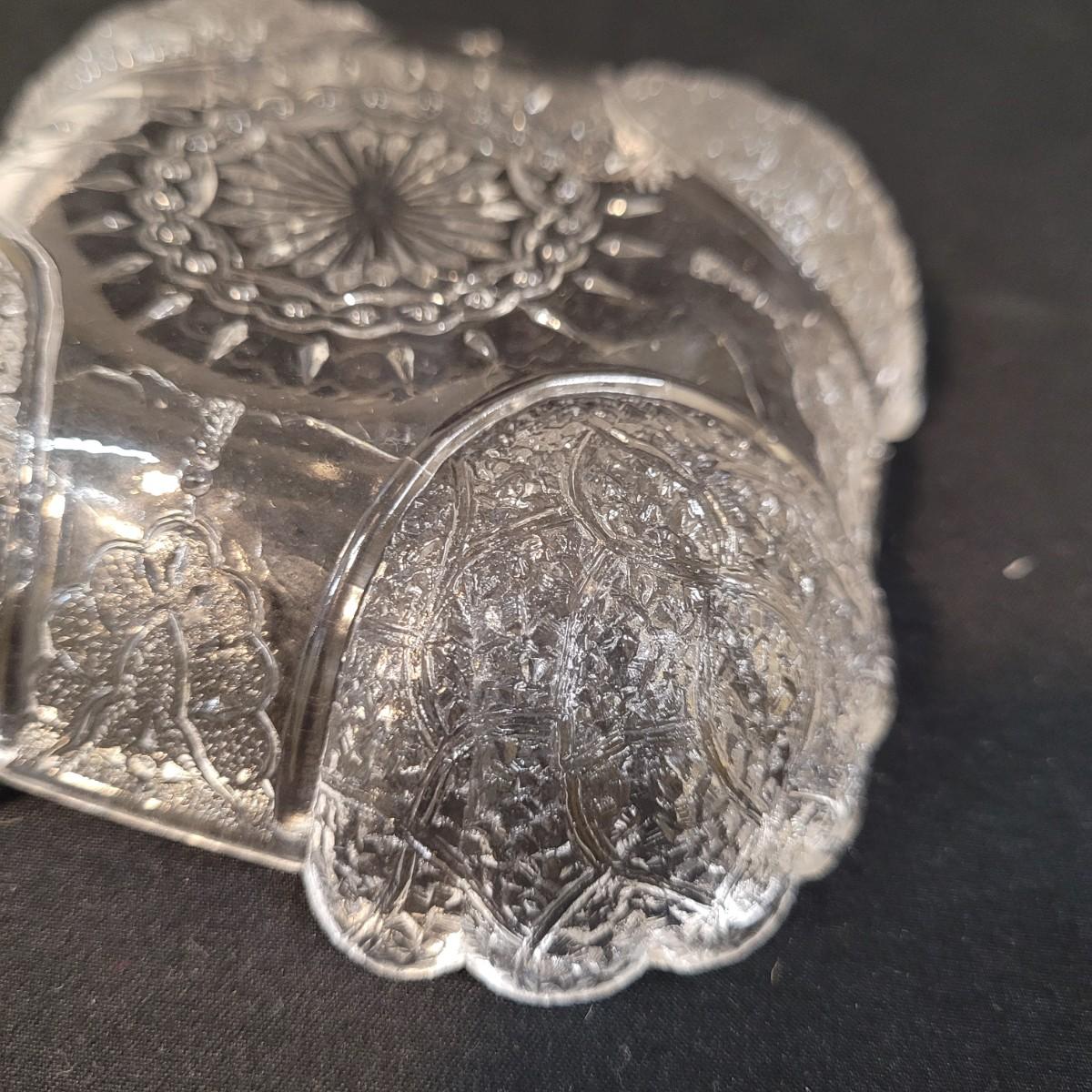 Glass serving ware pieces include standing scallop edged serving dish with matching small sauce dish, and five small sauce bowls. Slight chipping in bowls (see photos). Standing dish measures approximately 10"DIA x7.5"H. Shipping available.