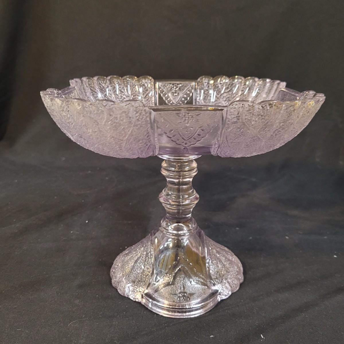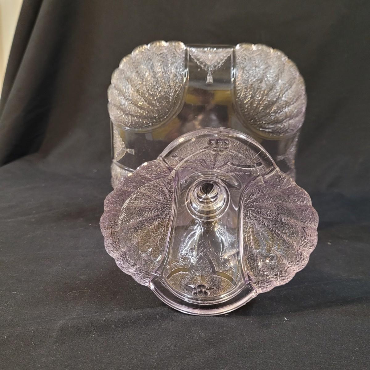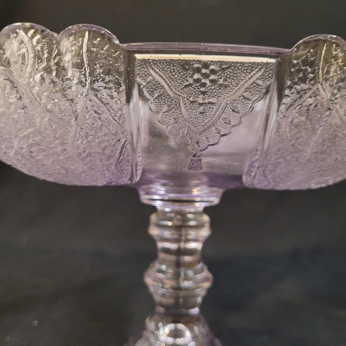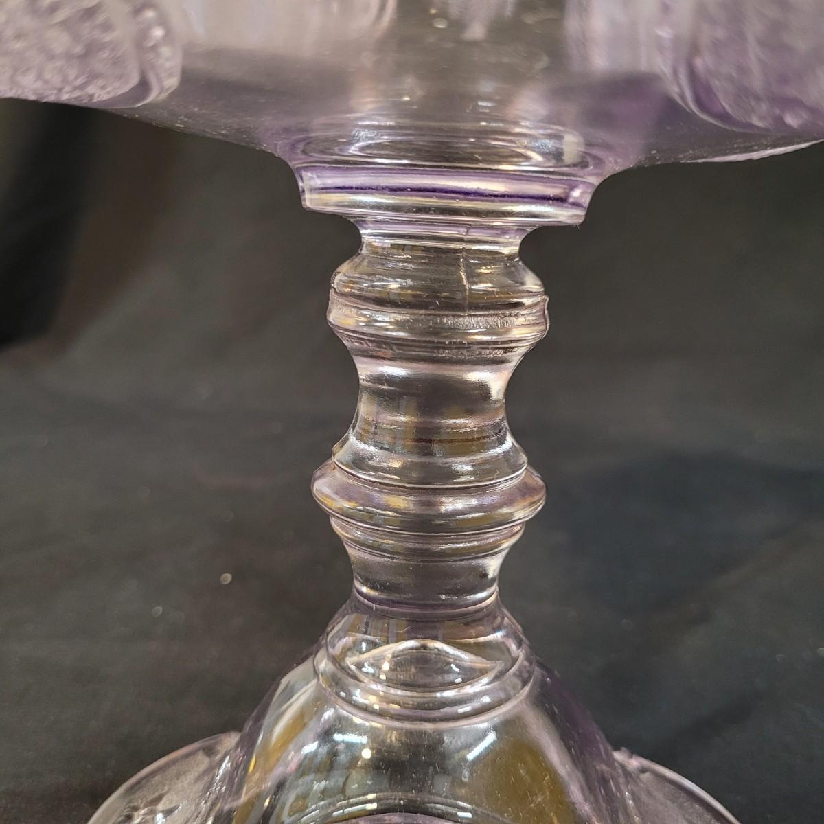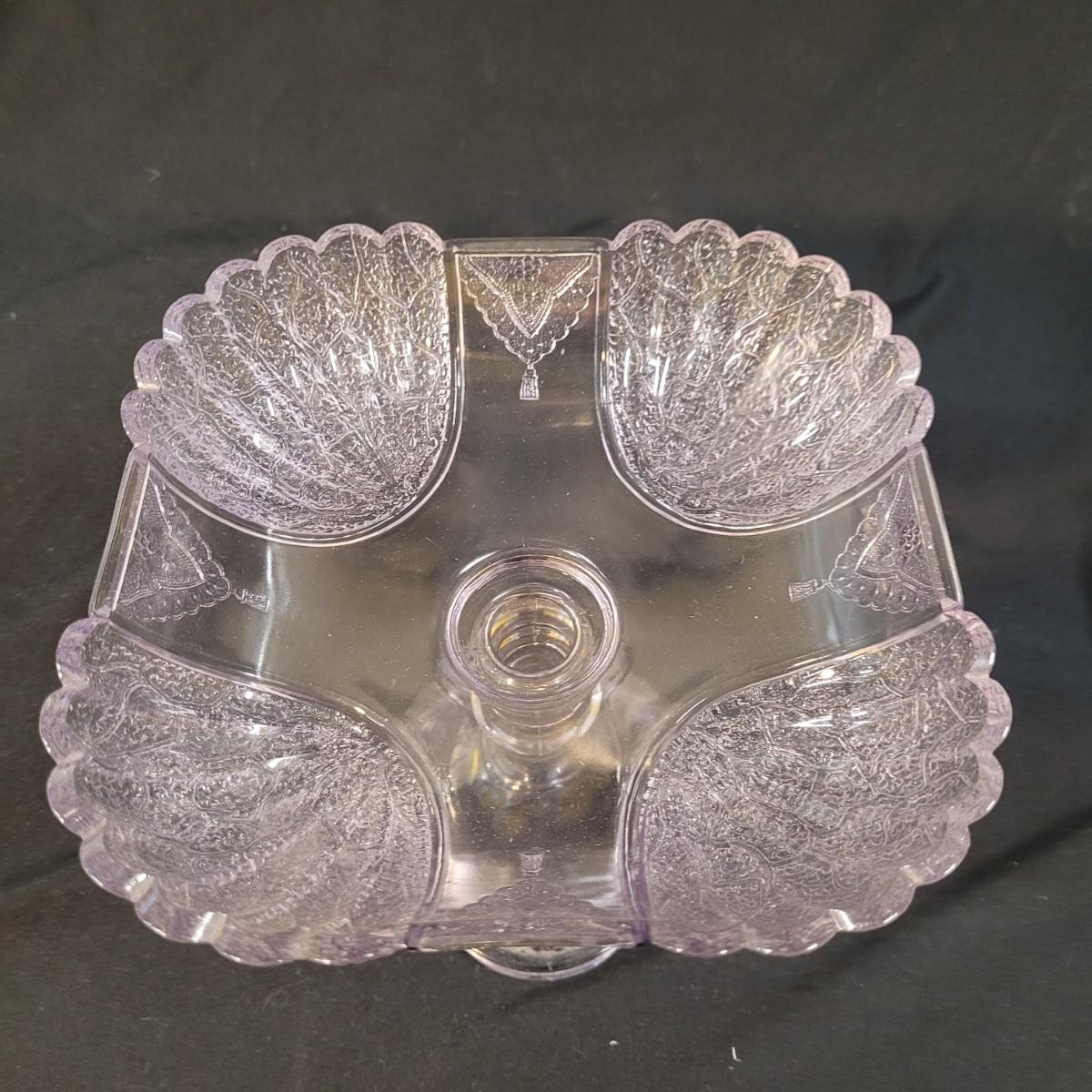 Glass serving ware pieces include standing scallop edged serving dish with matching small sauce dish, and five small sauce bowls. Slight chipping in bowls (see photos). Standing dish measures approximately 10"DIA x7.5"H. Shipping available.