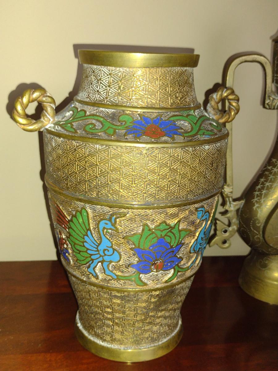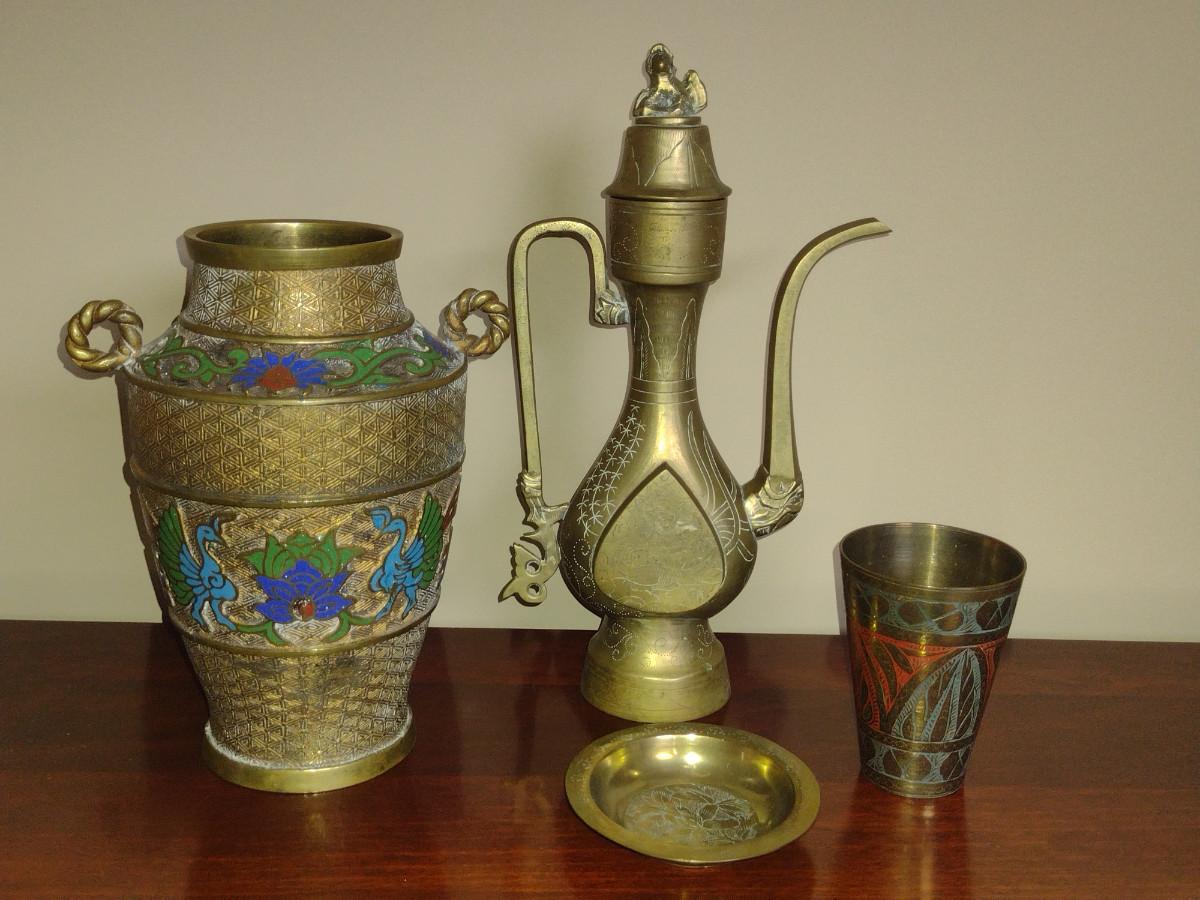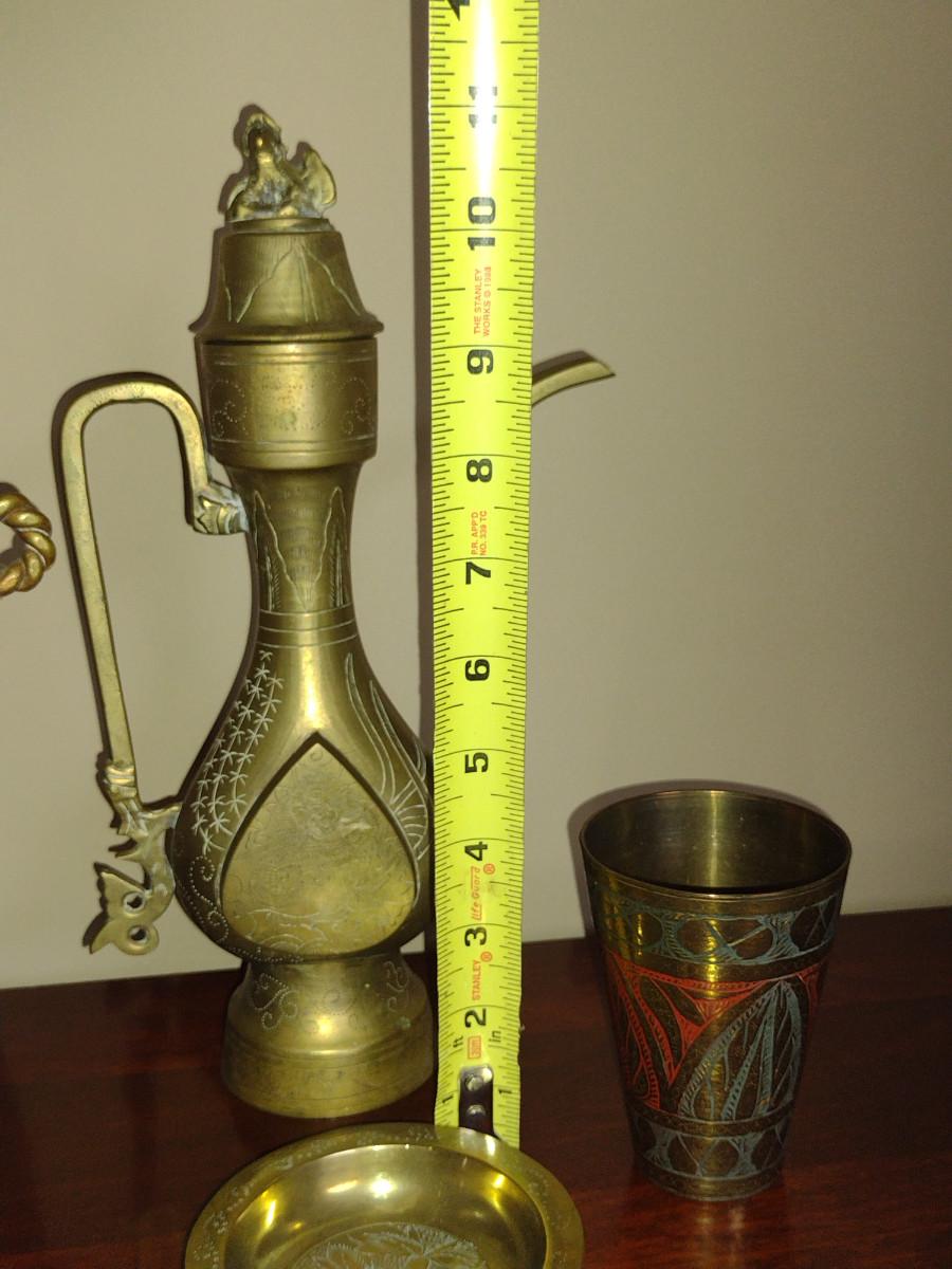 Collection of Etched Brass Decor- Vase, Wine Decanter, Cup, and Plate