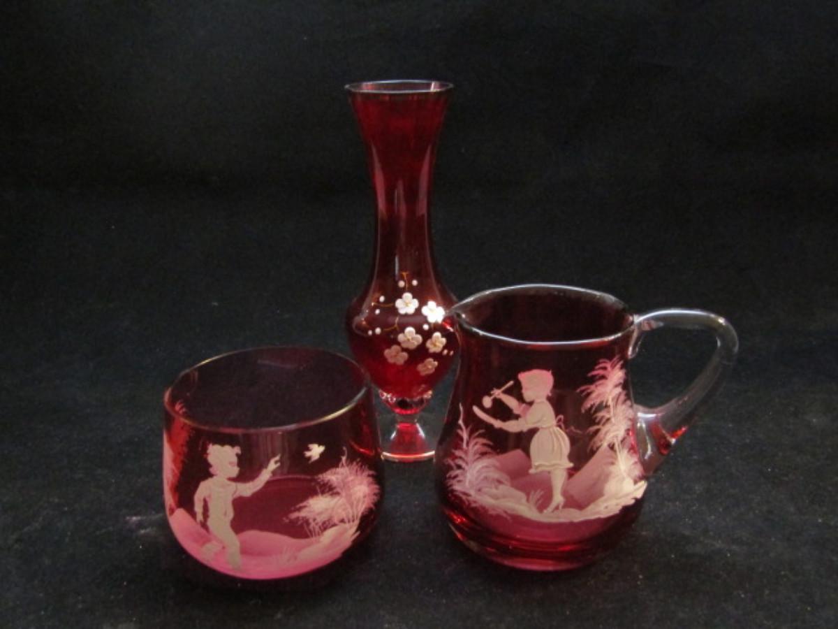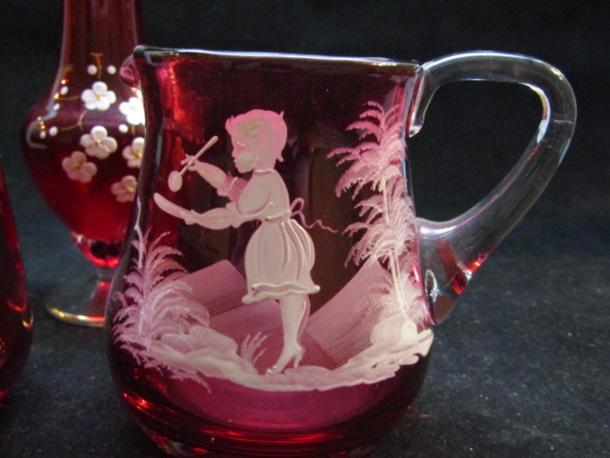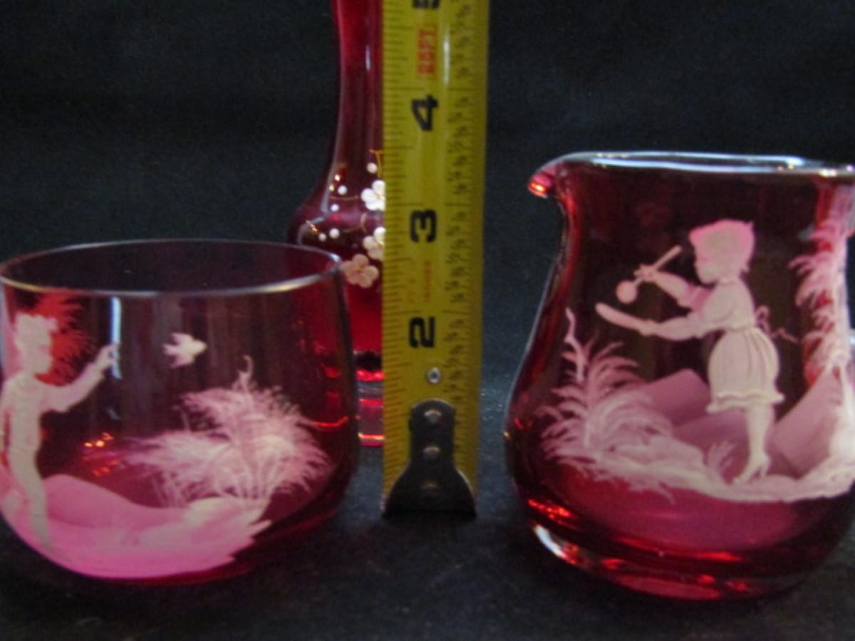 Collection of Etched Cranberry Glass (#88). Creamer and sugar possibly Mary Gregory.