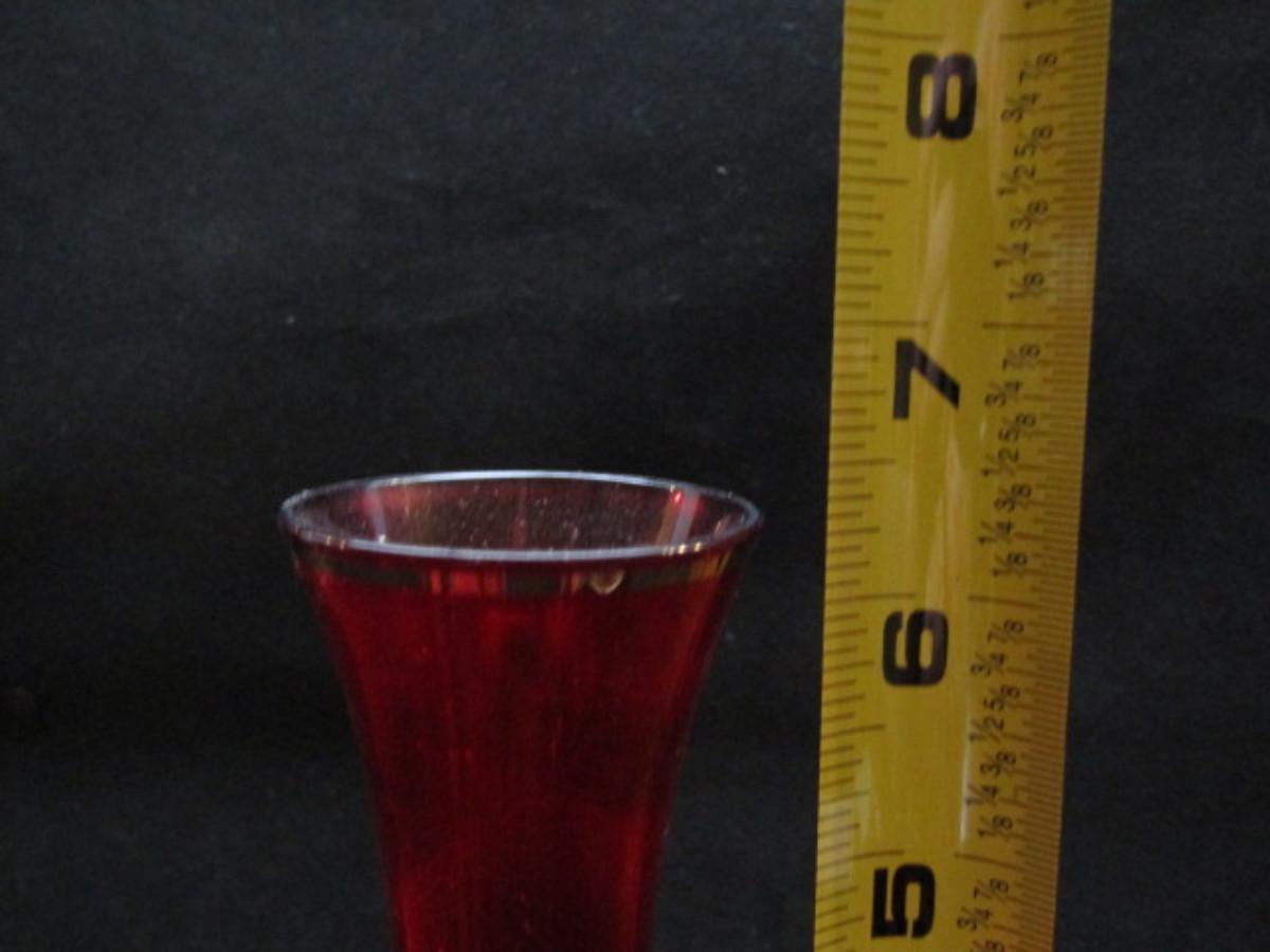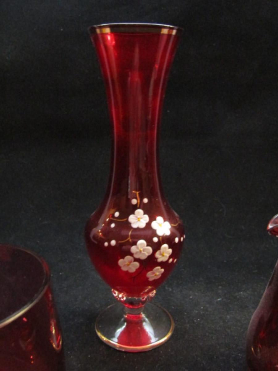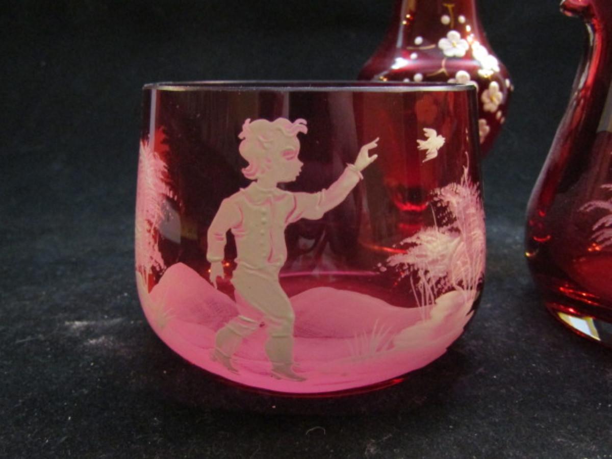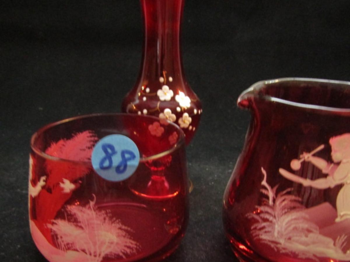 Collection of Etched Cranberry Glass (#88). Creamer and sugar possibly Mary Gregory.