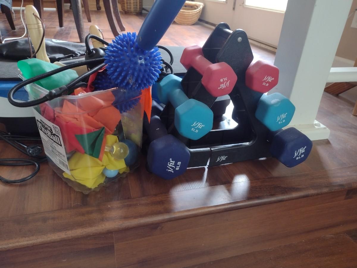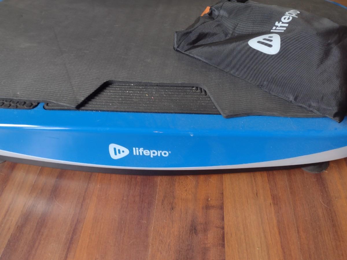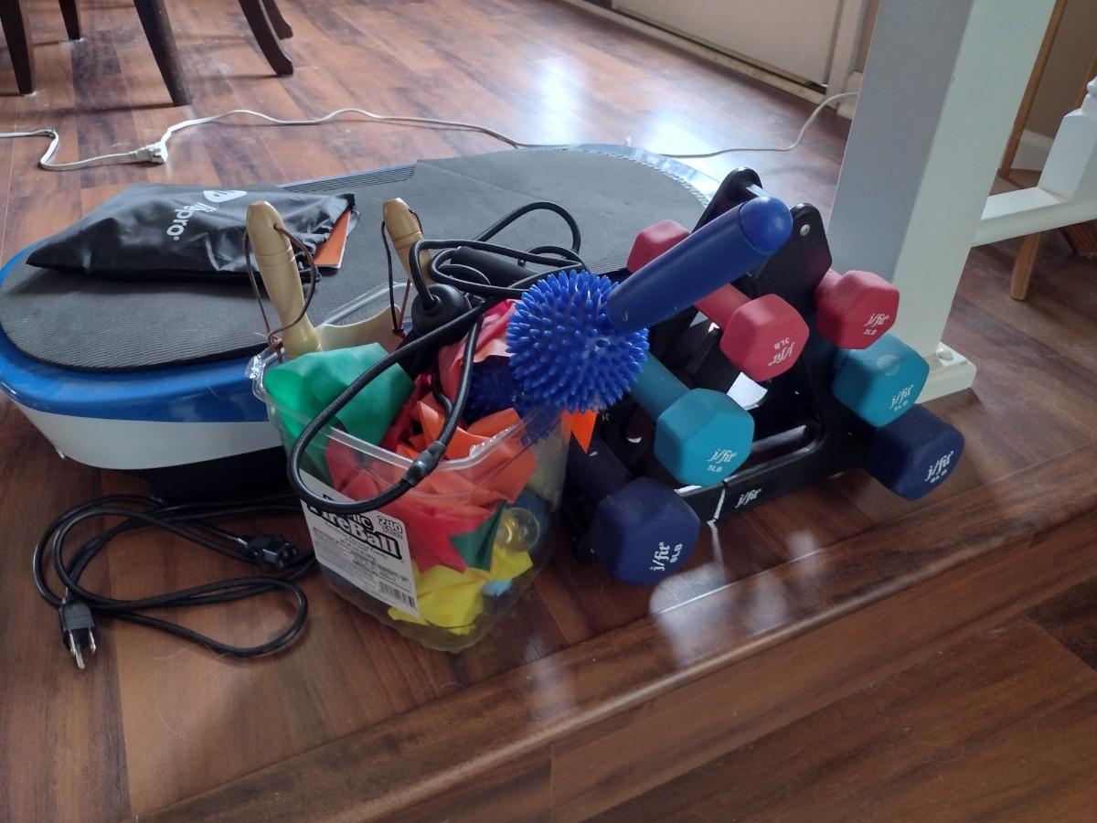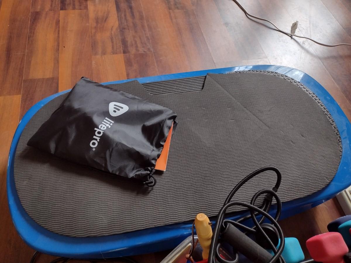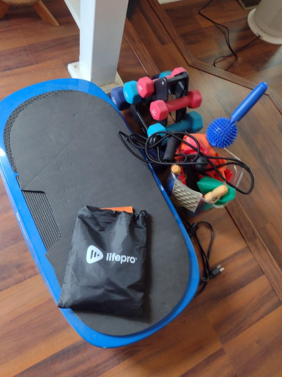 Collection of Exercise Equipment Lightweight Barbells, Life Pro Machine and Resistance Bands. Vibration plate needs a new cord.