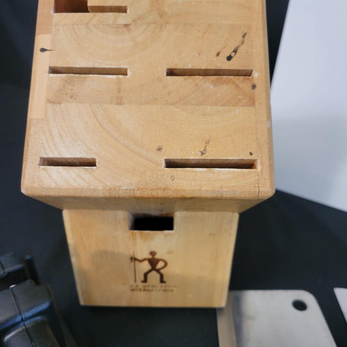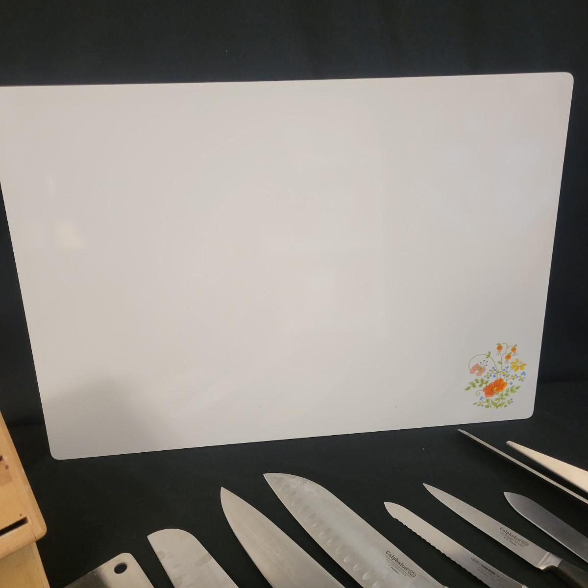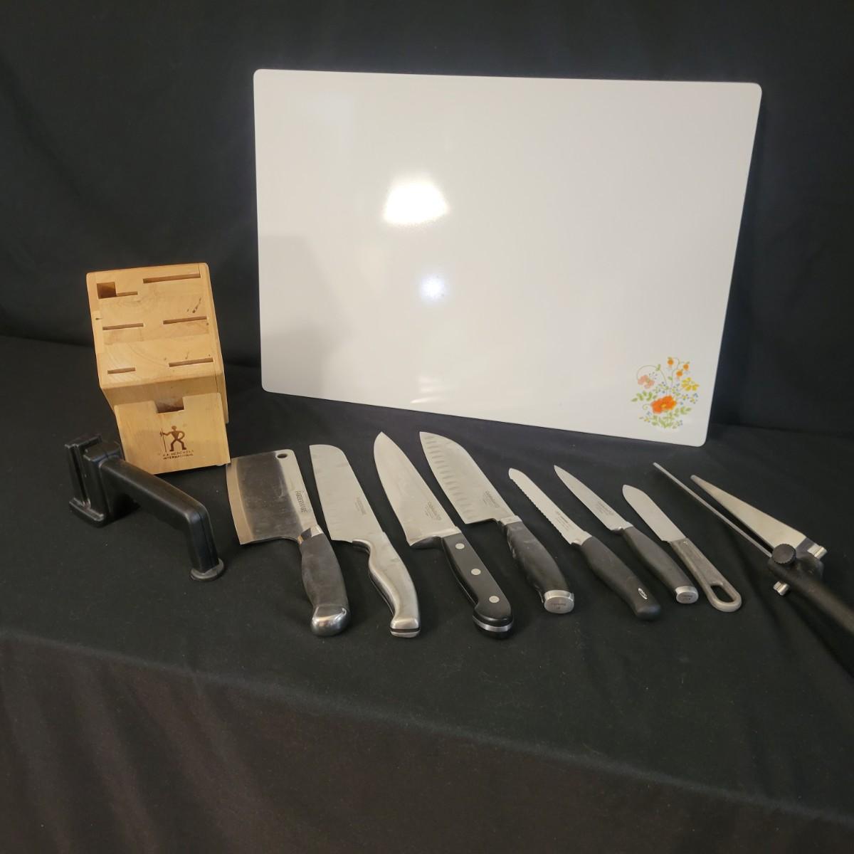 A collection of knives, cutting board and knife block in good condition. There eight knives in this assortment, including an adjustable carving knife. A Farberware knife sharpener and JA Henckels knife block included. Cutting appears to be ceramic with a cute flower decal on its corner. Cutting board measures approximately 20" x 14" Local pickup only
