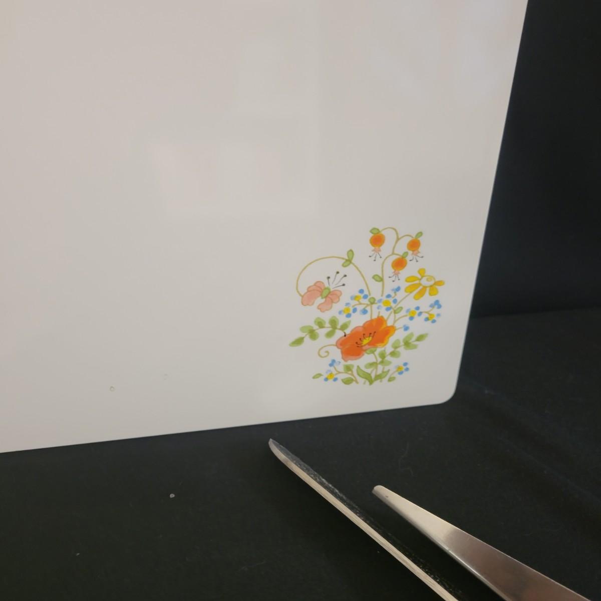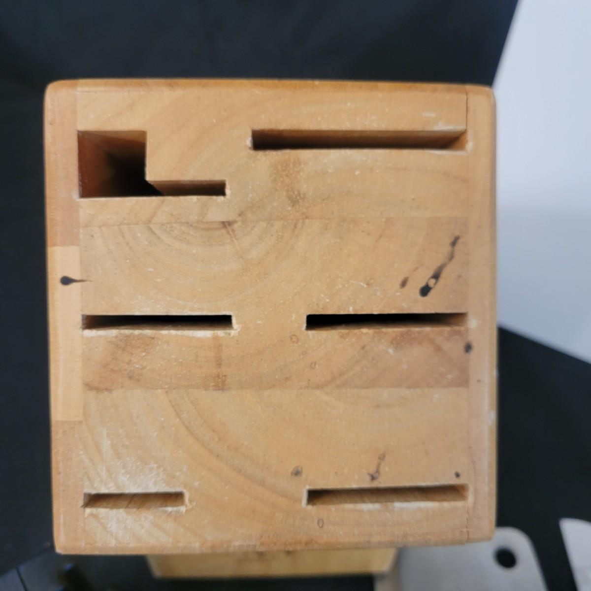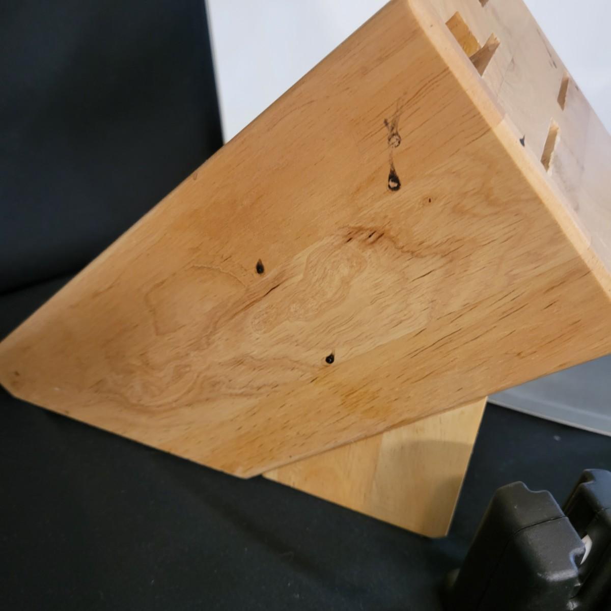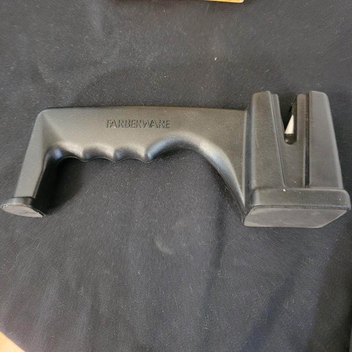 A collection of knives, cutting board and knife block in good condition. There eight knives in this assortment, including an adjustable carving knife. A Farberware knife sharpener and JA Henckels knife block included. Cutting appears to be ceramic with a cute flower decal on its corner. Cutting board measures approximately 20" x 14" Local pickup only