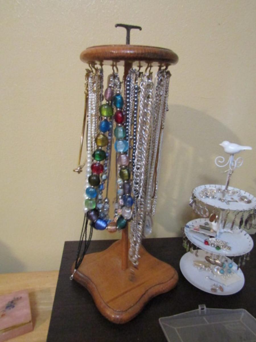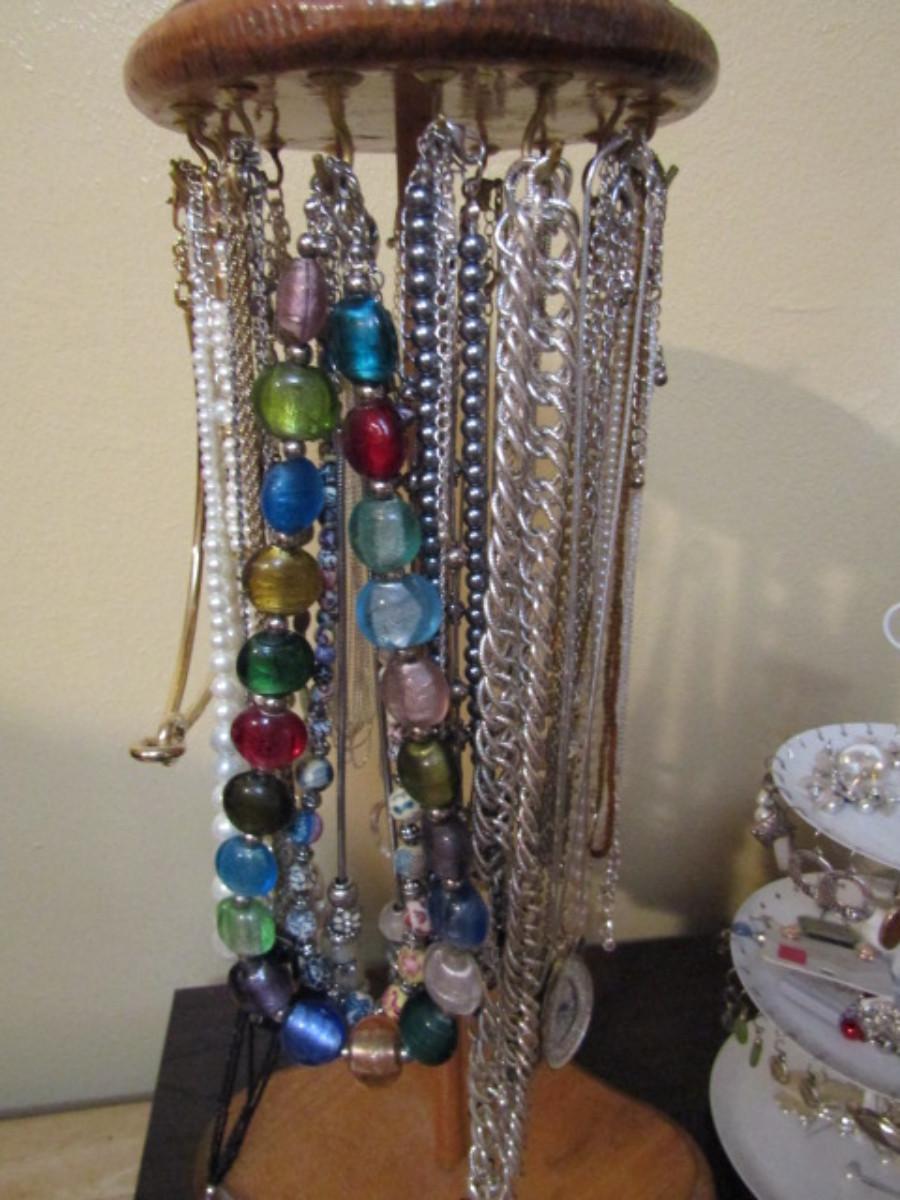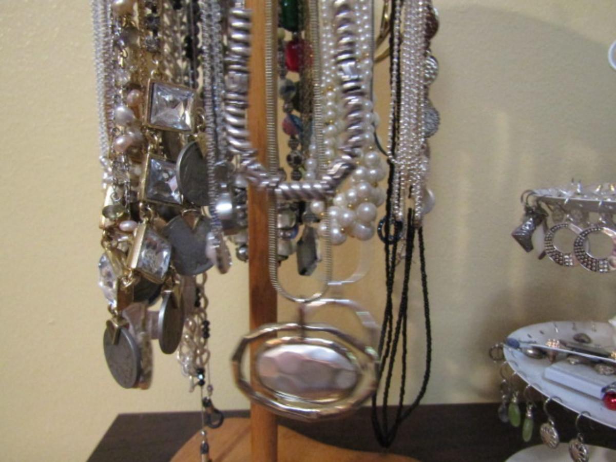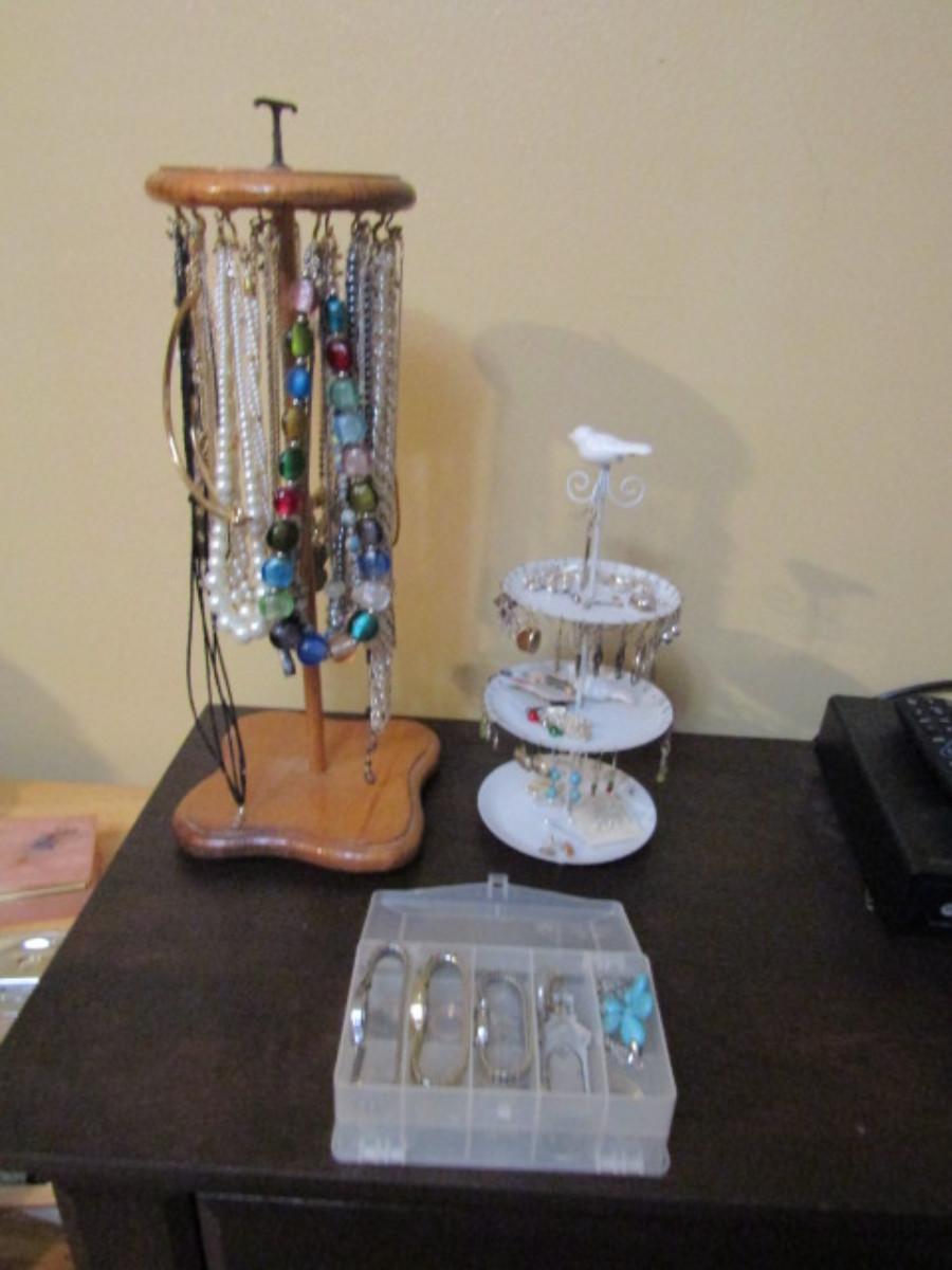 Collection of Fashion Jewelry with Organizers- one for necklaces (wooden) and one for earrings (metal).