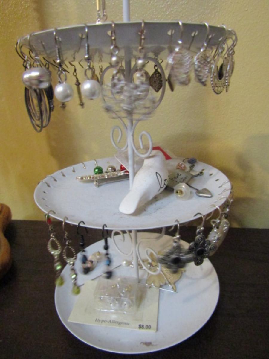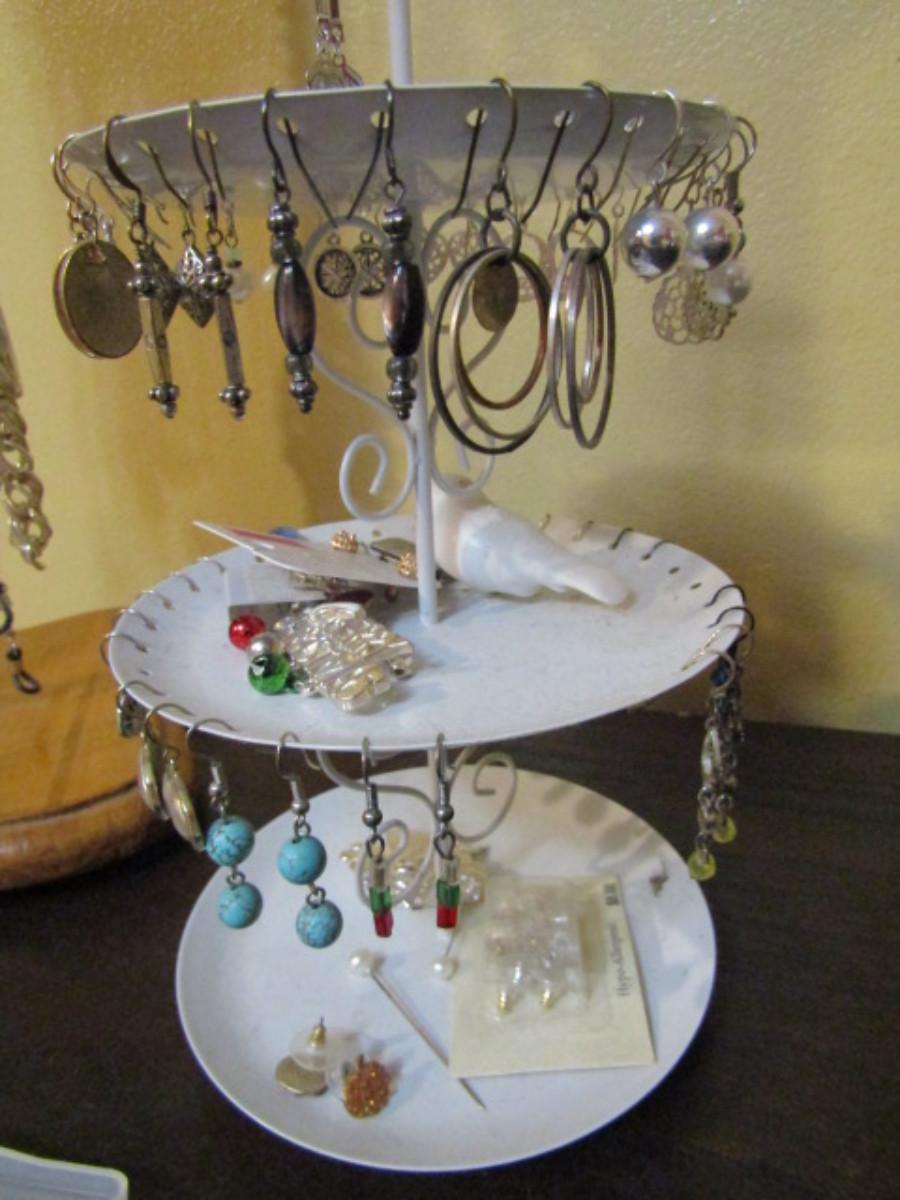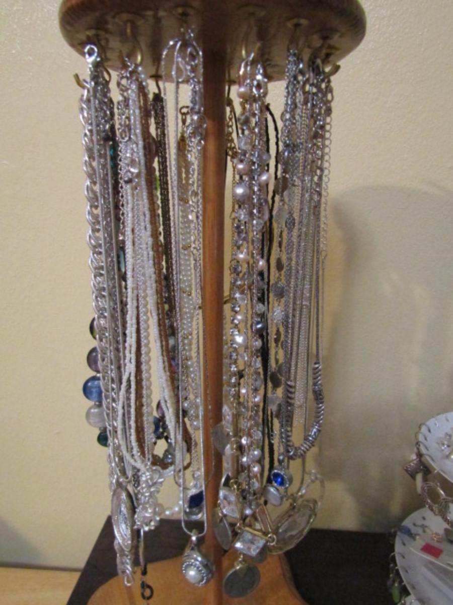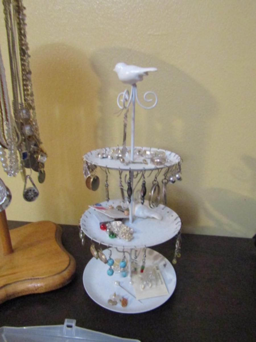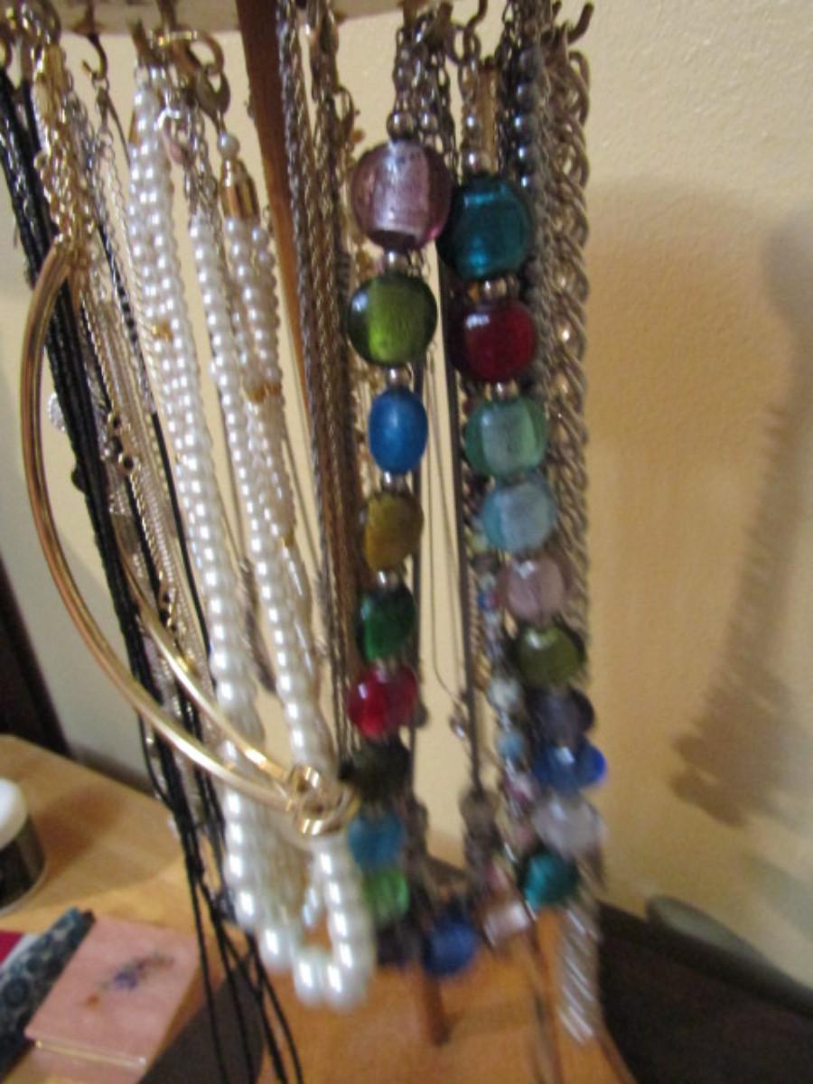 Collection of Fashion Jewelry with Organizers- one for necklaces (wooden) and one for earrings (metal).