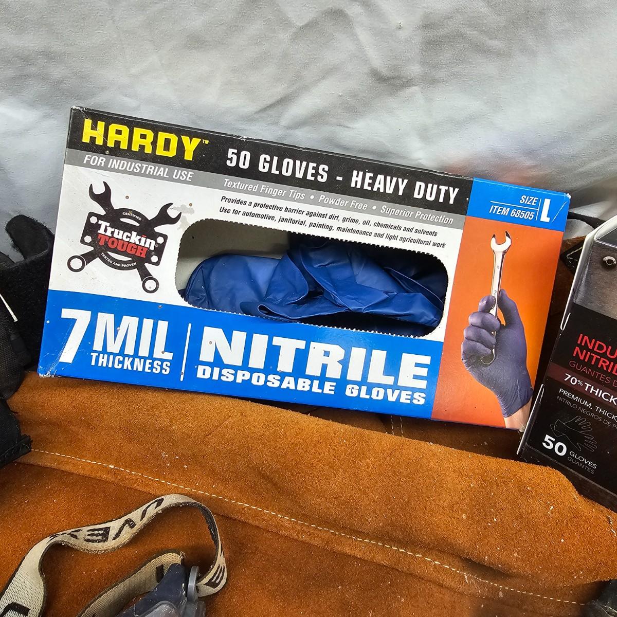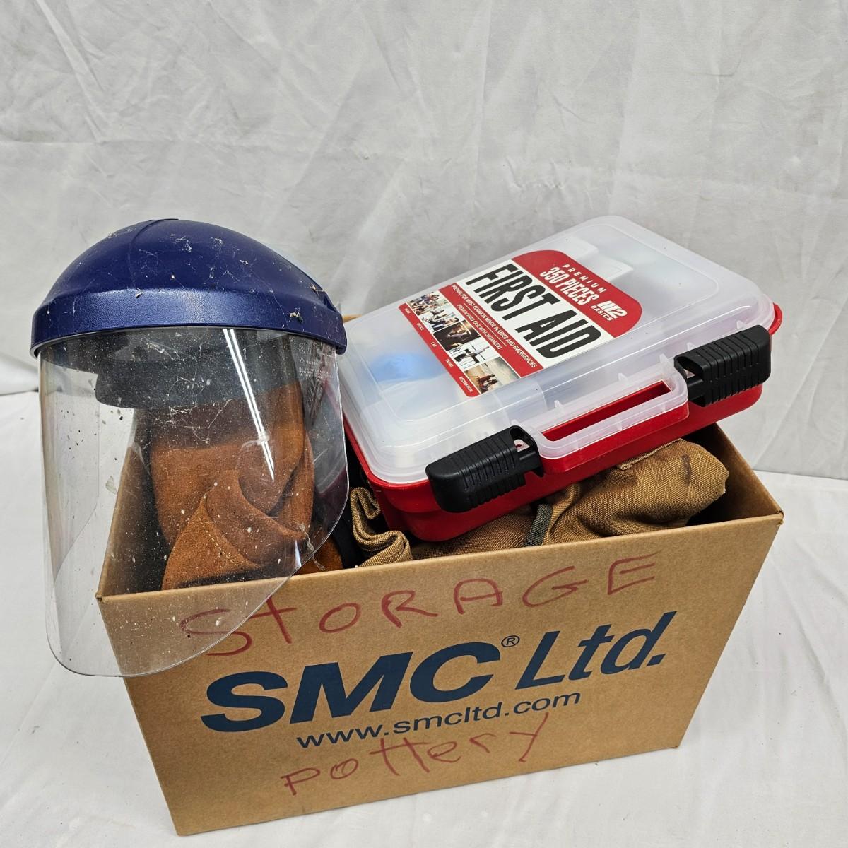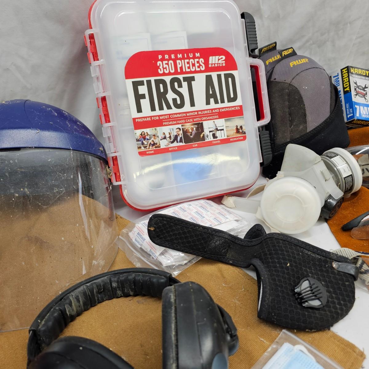 Work gloves, masks, respiratory, face shields and more. Two work aprons, one leather and one canvas. Knee pads, goggles, hearing protection. Hard shell first aid case with bandaid, compresses, cleaners and more. Box is 11" x 13" x 4"H. Most all items used. See photos for details. Local pickup only.