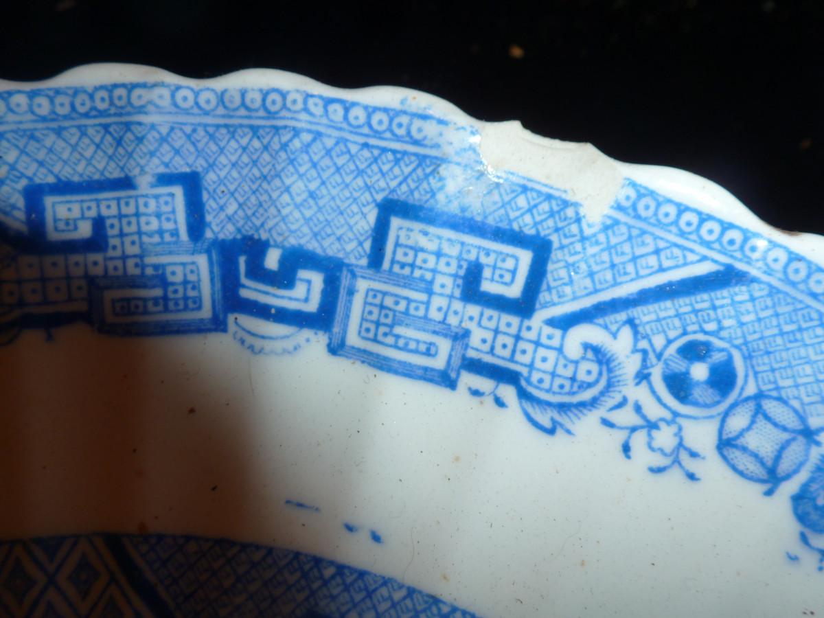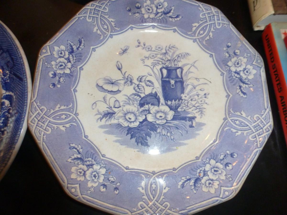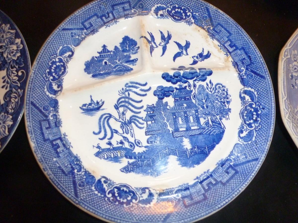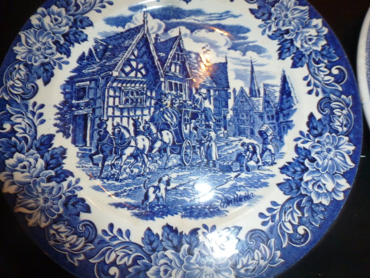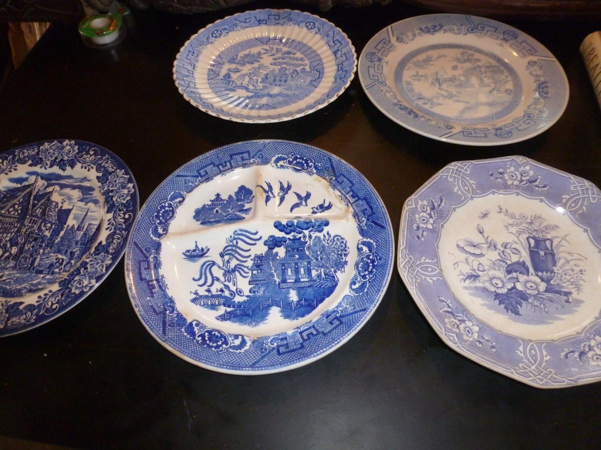 Collection of Five Blue and White Plates. At least one has chipping/cracking.