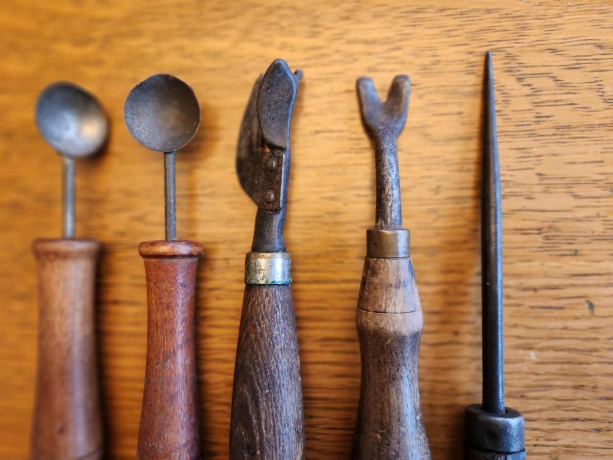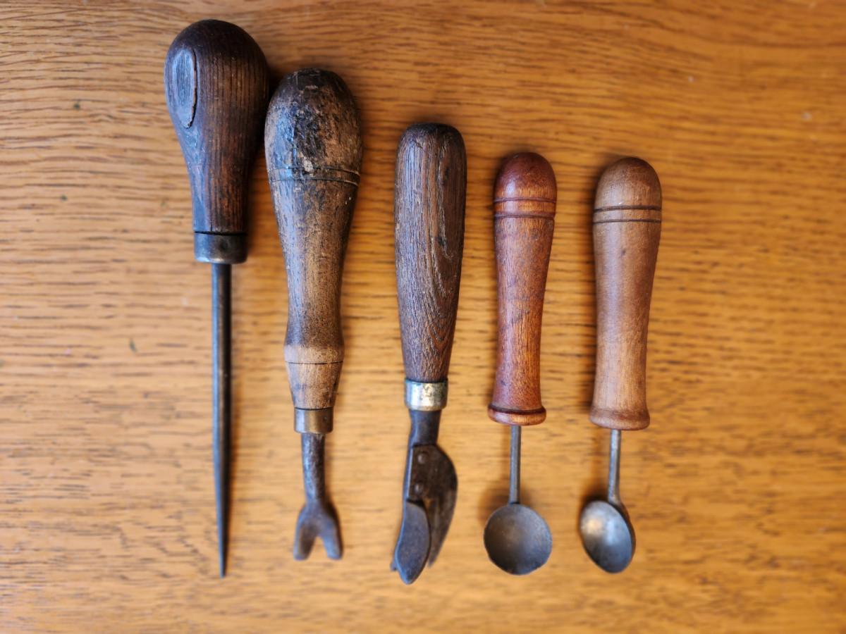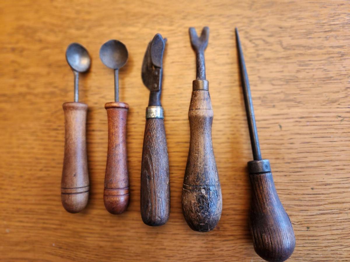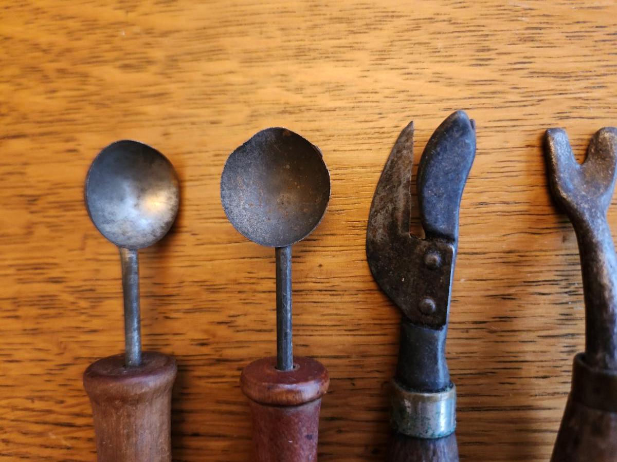 This auction lot is for a Collection of Five Vintage Hand Tools. These old tools include a scratch awl, a nail puller, an old type can opener and two melon ballers. Great for decor and maybe some real use is left in them.