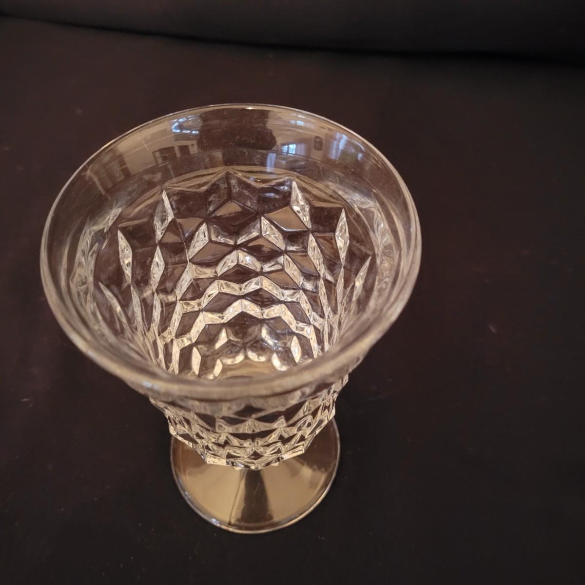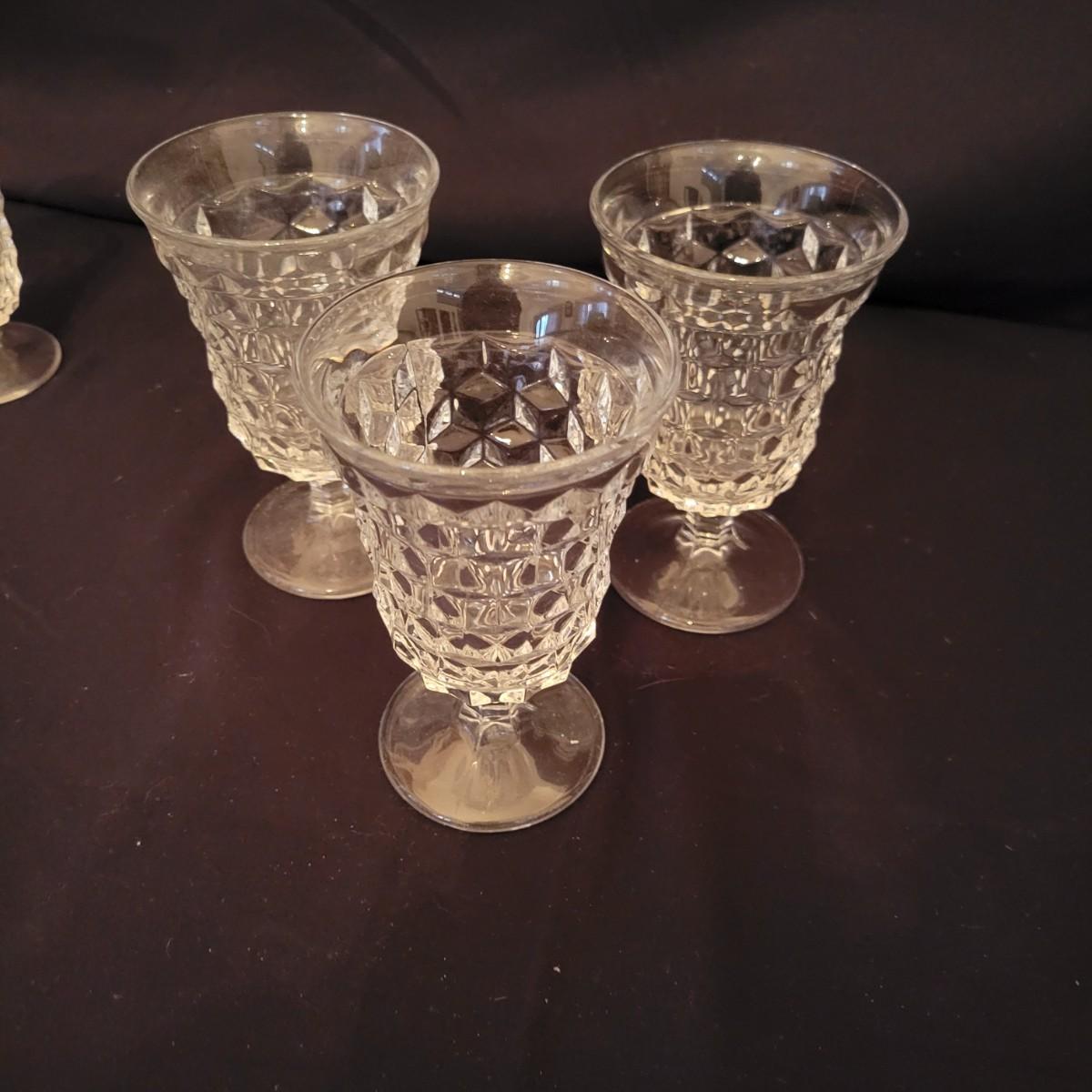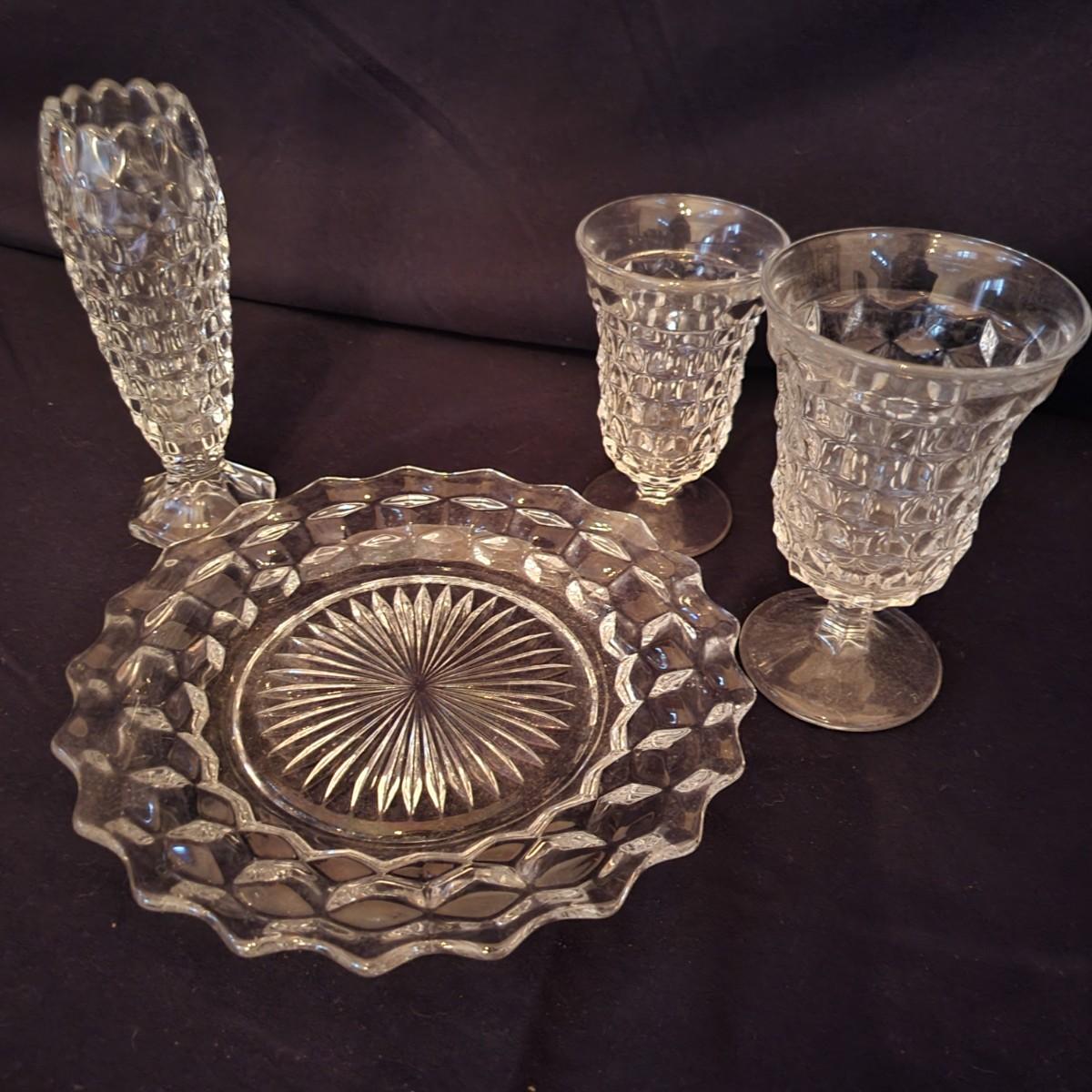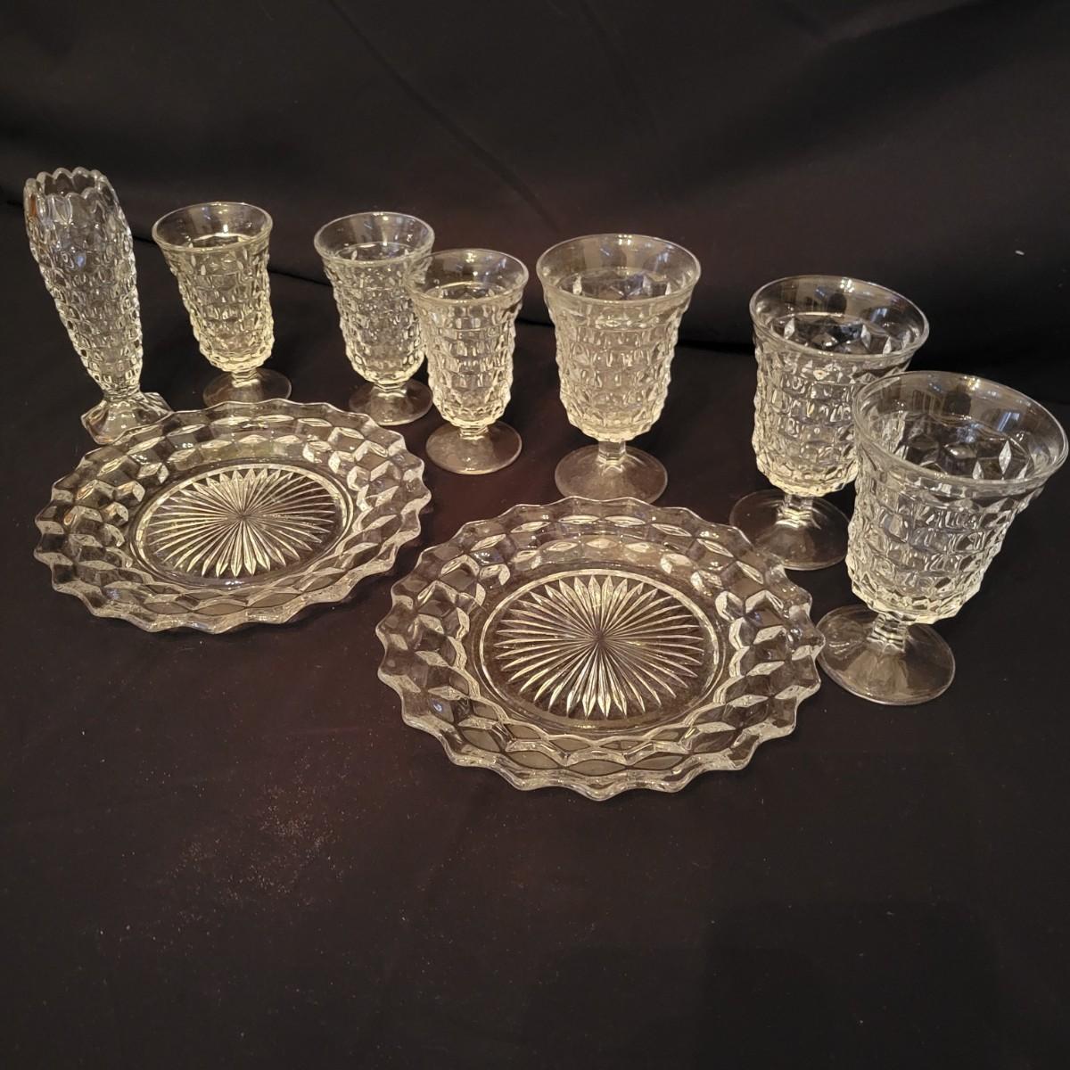 A collection of Fostoria style glass with a cube design. This is a collection of nine pieces with no chips or cracks. Plates measure approximately 8.5" in diameter and the bud vase is approximately 6.5" in height. The glasses are shown are different sized, the largest measure approximately 5.5"H. Shipping available