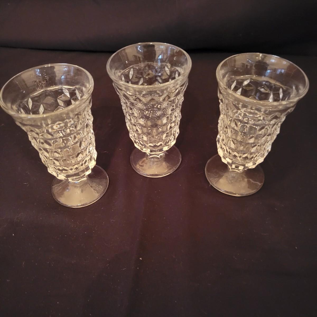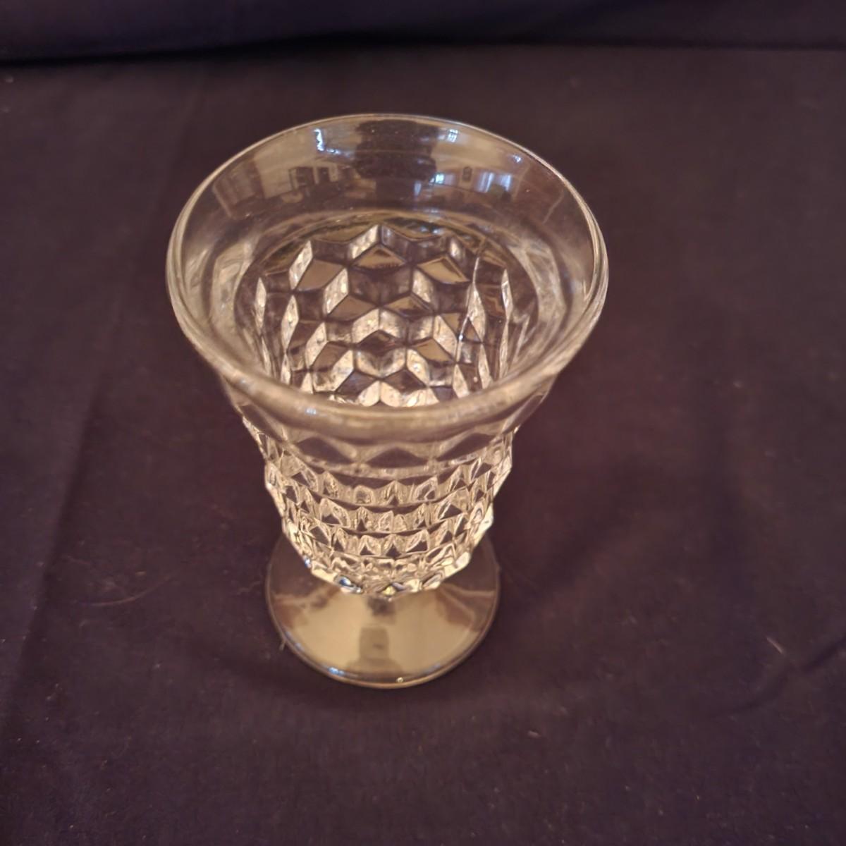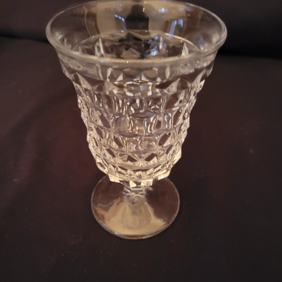 A collection of Fostoria style glass with a cube design. This is a collection of nine pieces with no chips or cracks. Plates measure approximately 8.5" in diameter and the bud vase is approximately 6.5" in height. The glasses are shown are different sized, the largest measure approximately 5.5"H. Shipping available