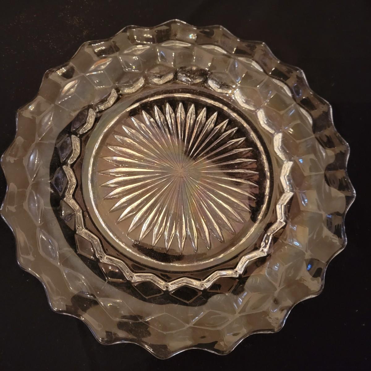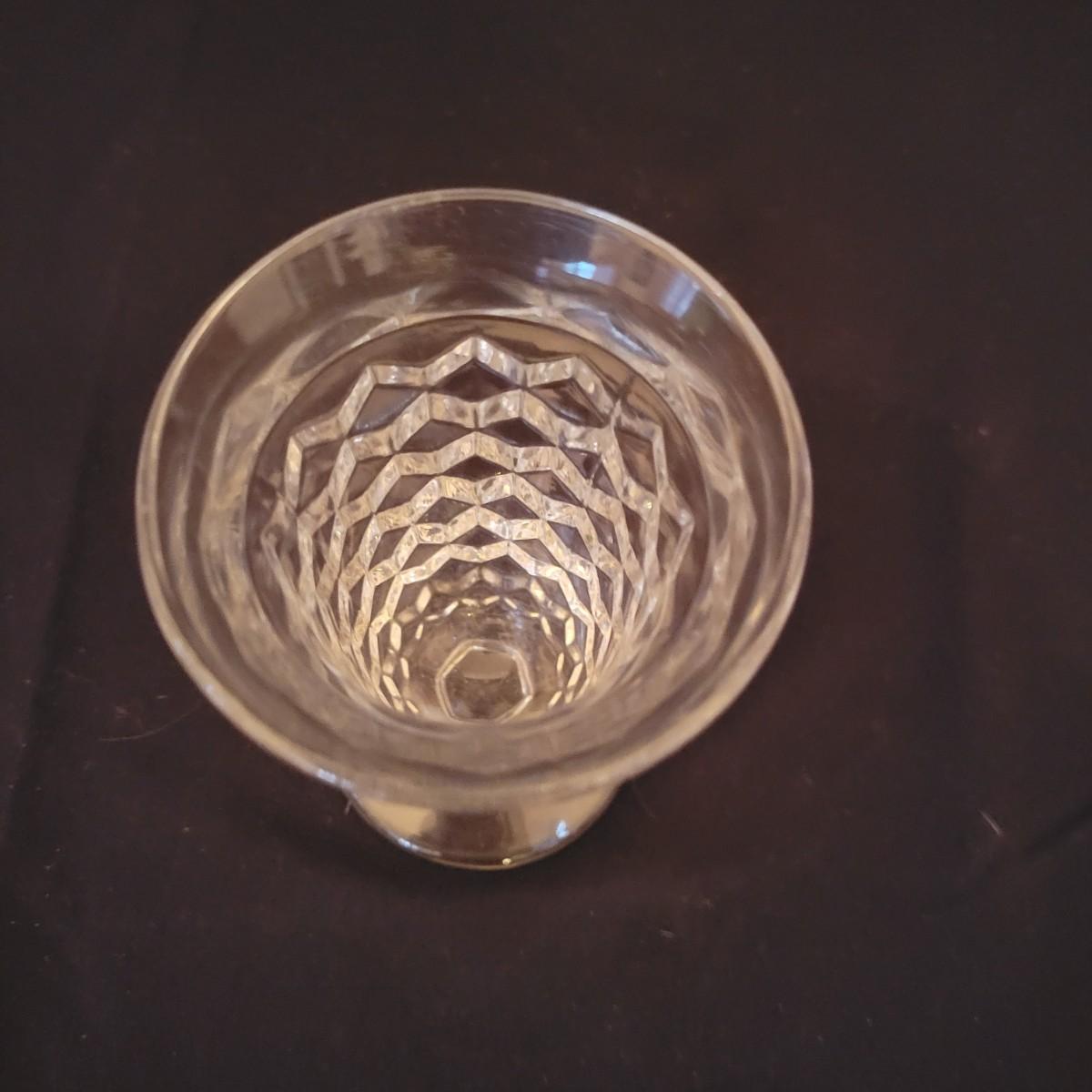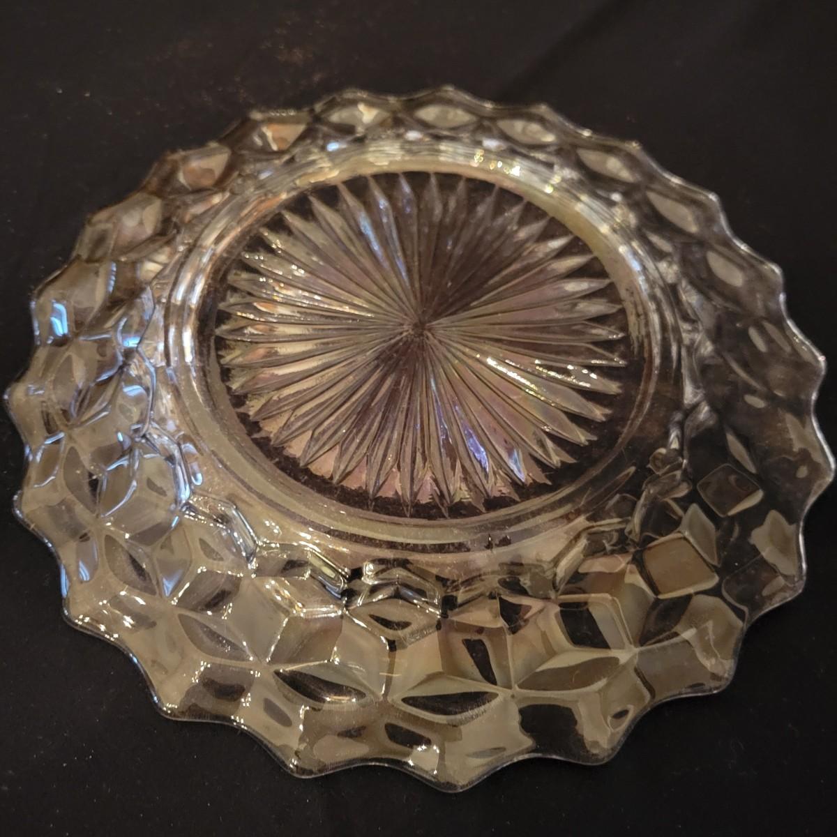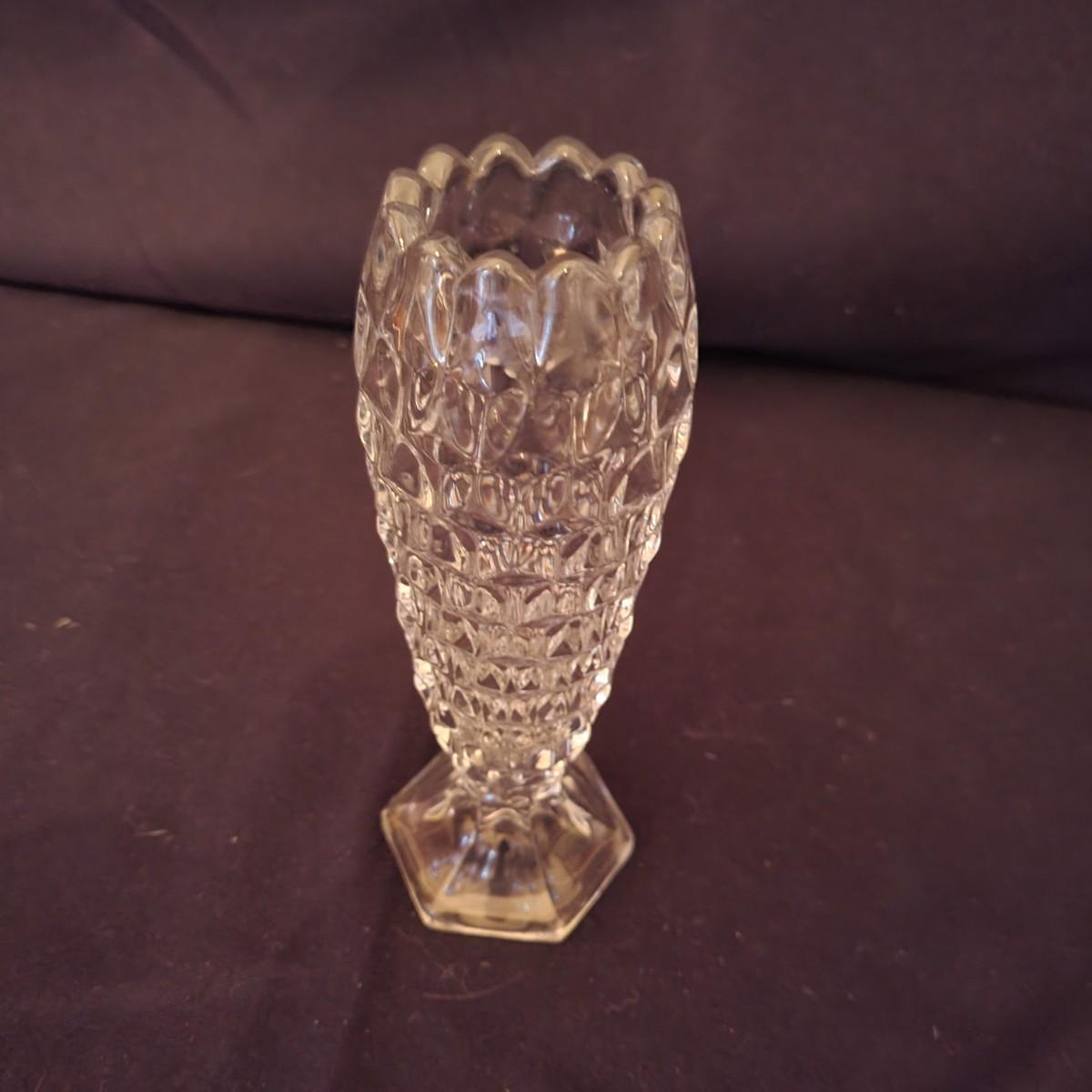 A collection of Fostoria style glass with a cube design. This is a collection of nine pieces with no chips or cracks. Plates measure approximately 8.5" in diameter and the bud vase is approximately 6.5" in height. The glasses are shown are different sized, the largest measure approximately 5.5"H. Shipping available