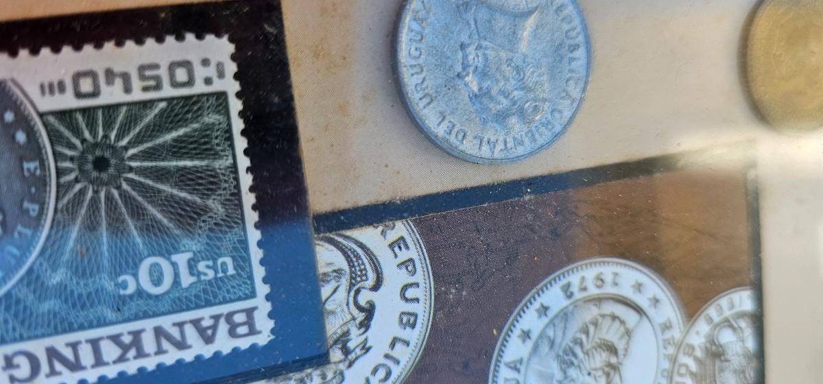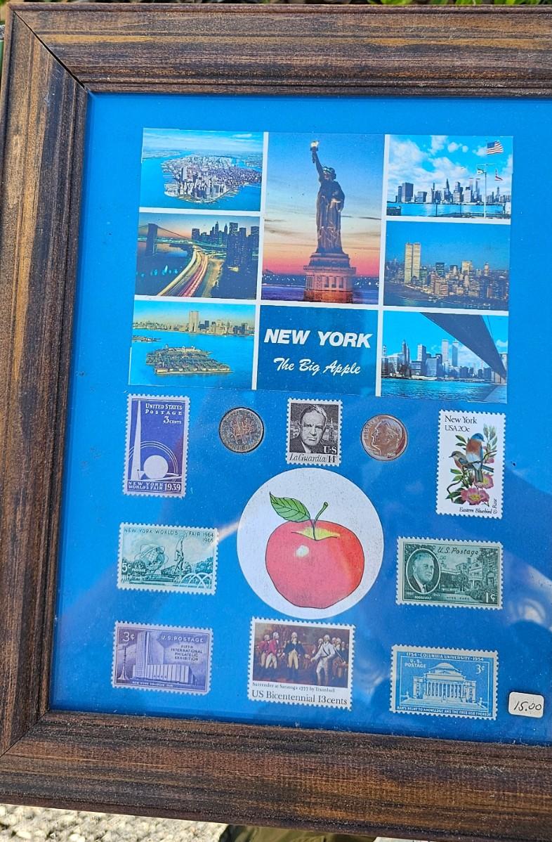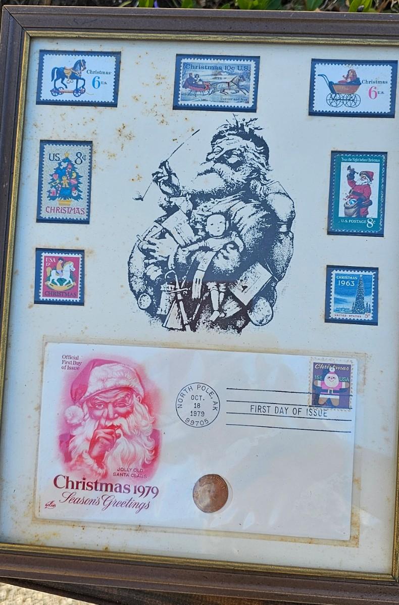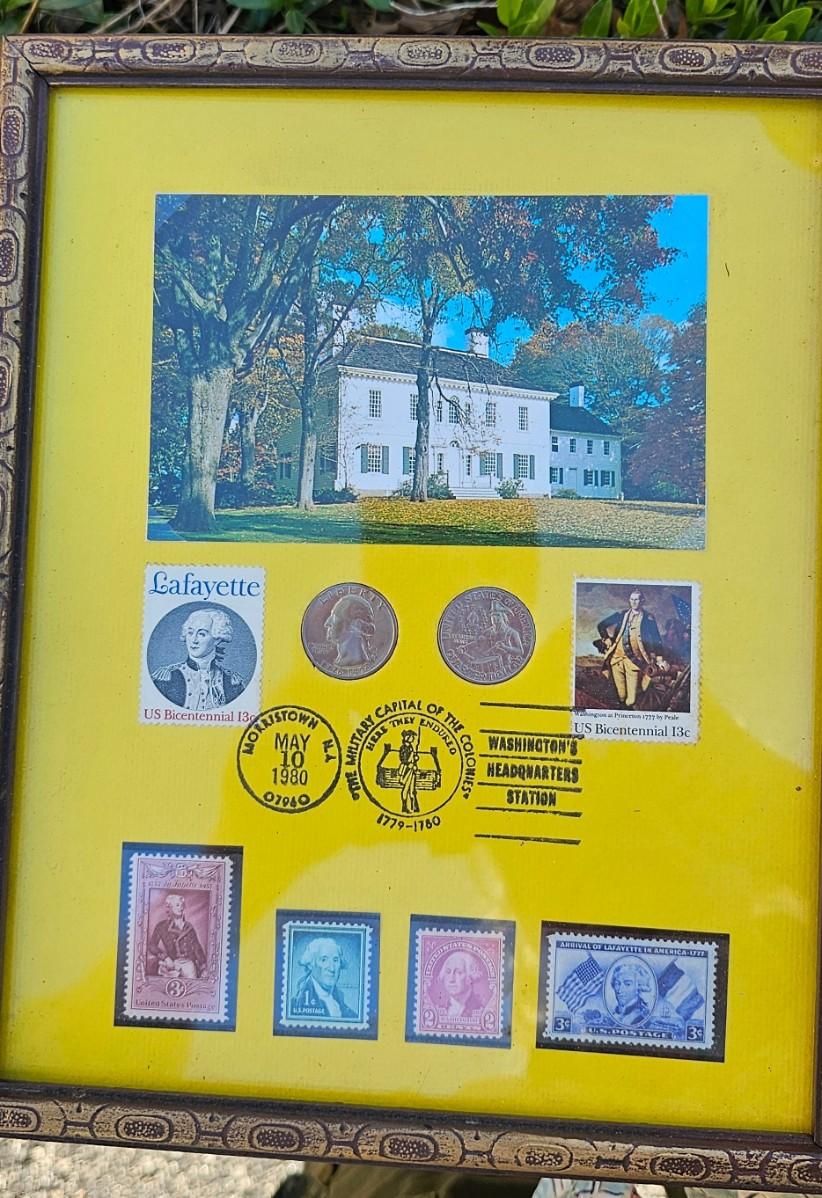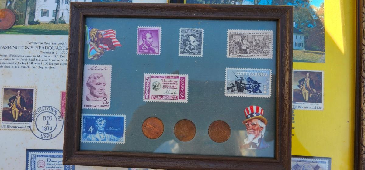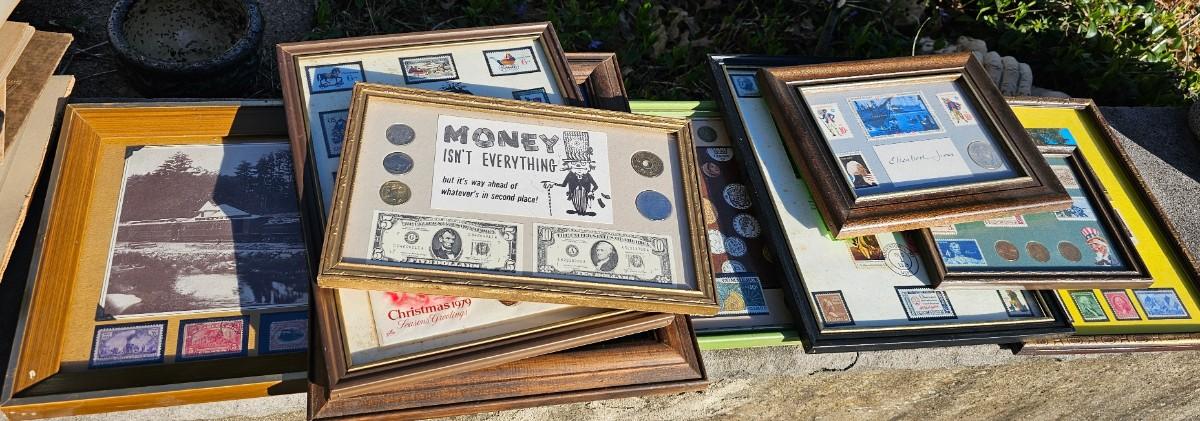 Collection of 9 framed stamps and coins in vintage frames with some bonus items