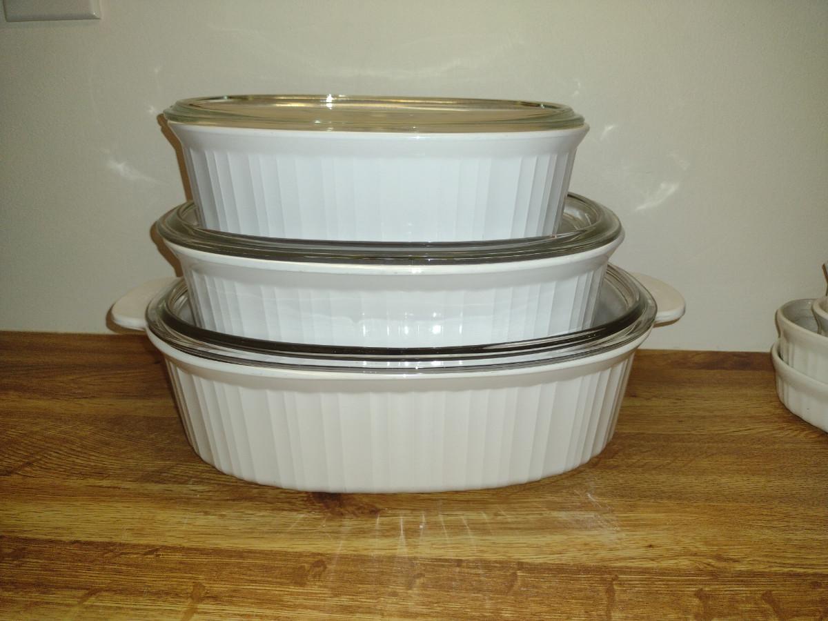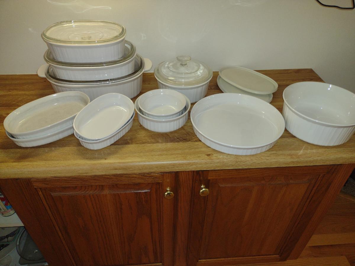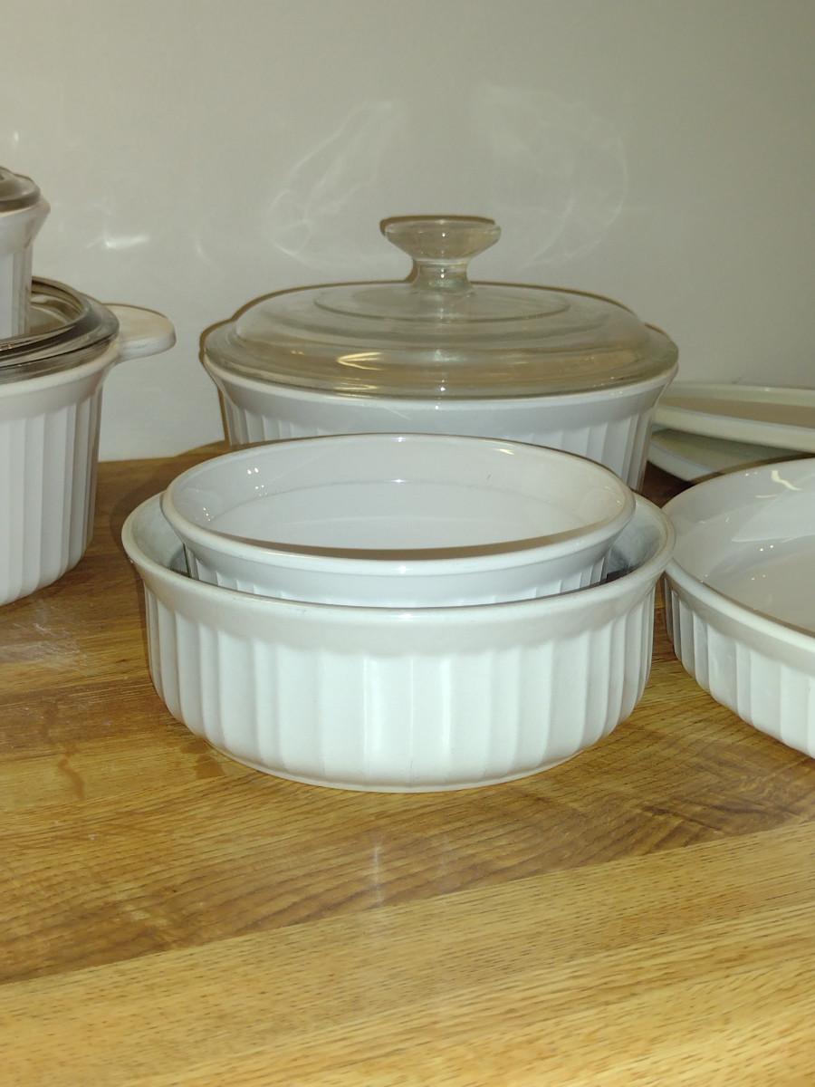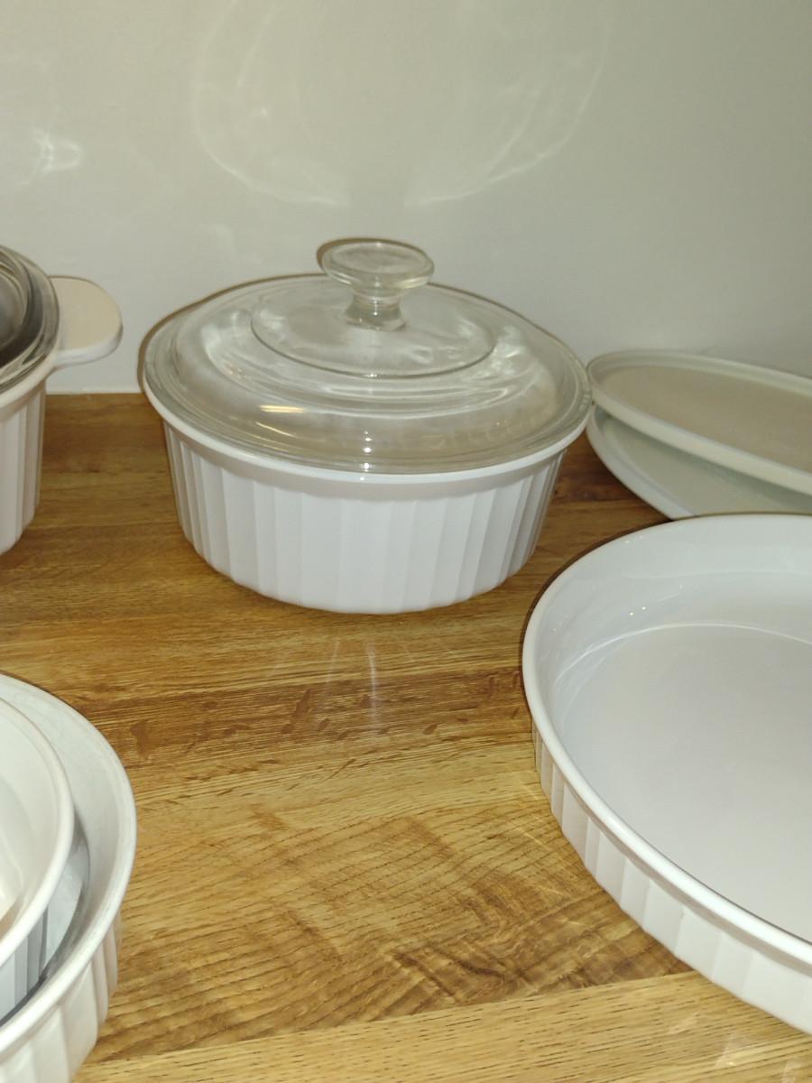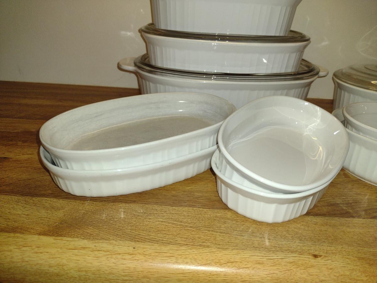 Collection of French White Corning Ware- 12 pieces, 6 lids. Some pieces have utensil markings on inside from use.