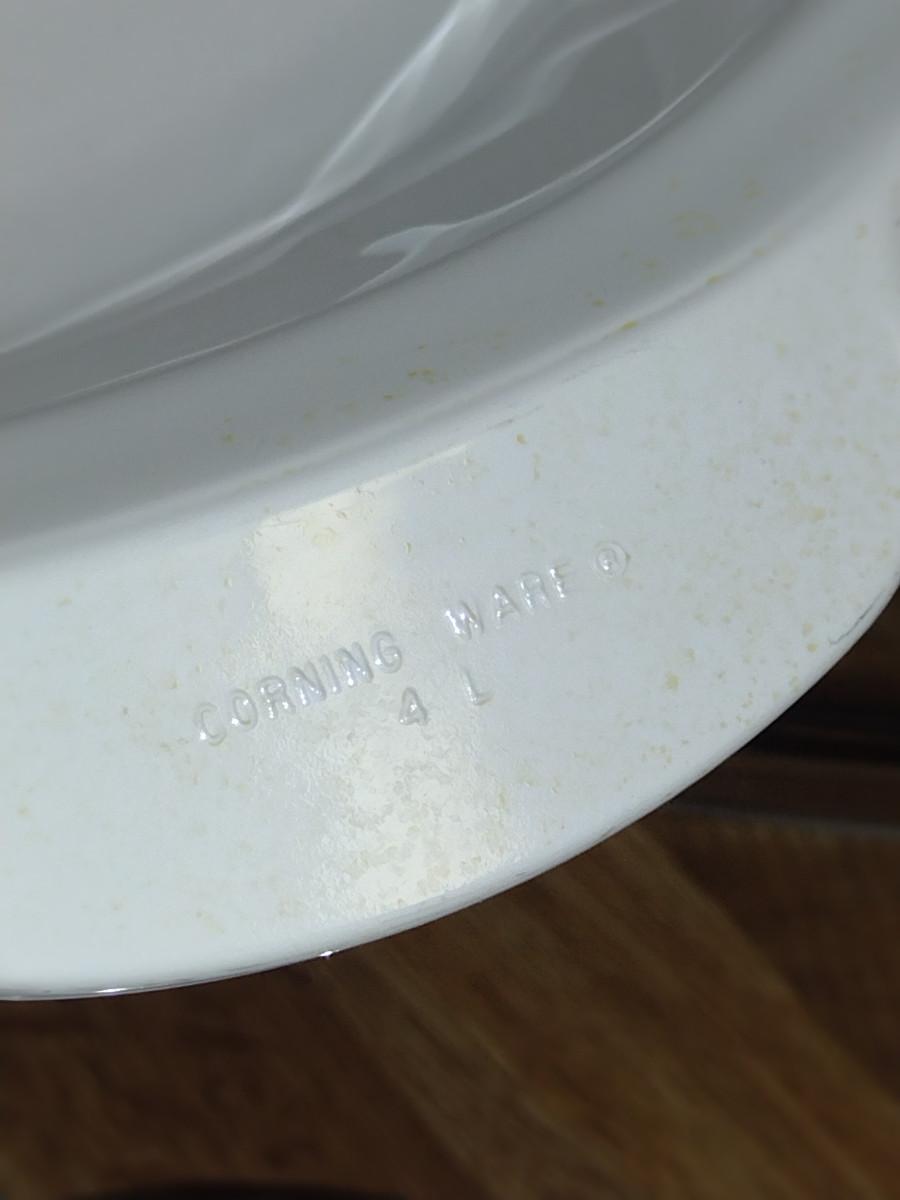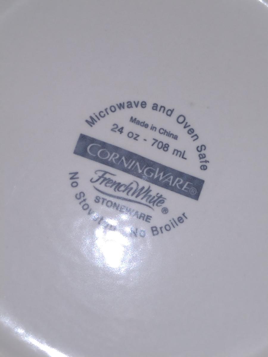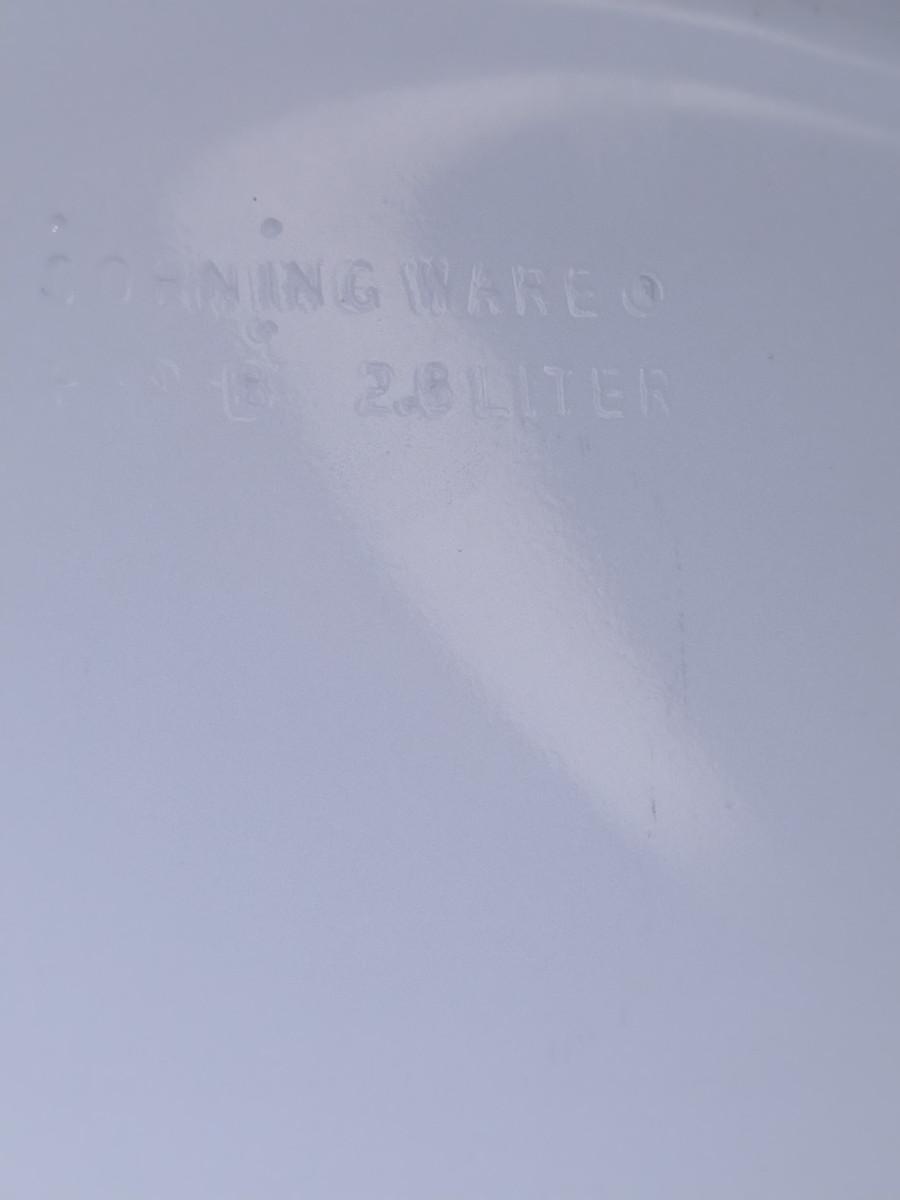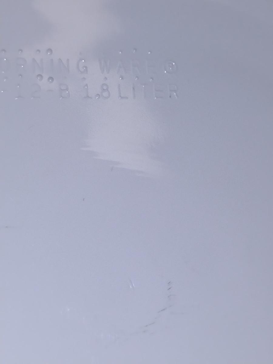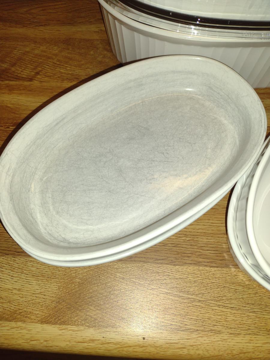 Collection of French White Corning Ware- 12 pieces, 6 lids. Some pieces have utensil markings on inside from use.