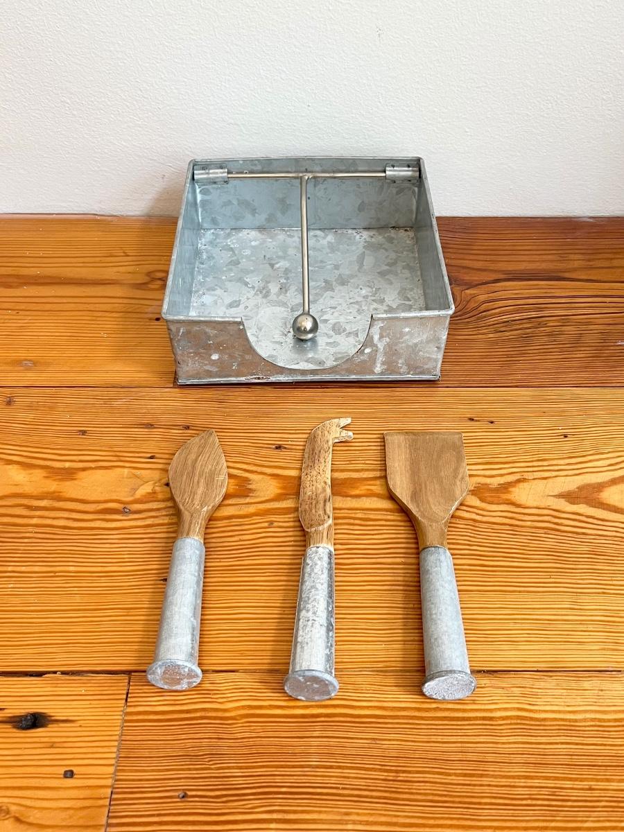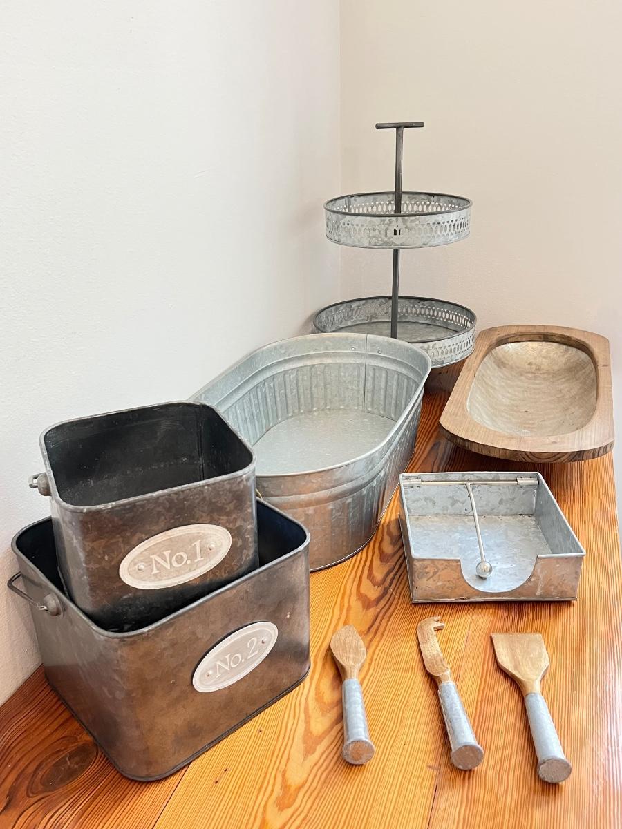 Includes = (1) 2 Tiered Tray ~ (1) Napkin Holder ~ (3) Utensils ~ (2) No. 1 & No. 2 Buckets ~ (1) Beverage tub 6” H x 20” W ~ (1) Wood & metal oval bowl