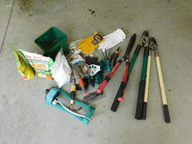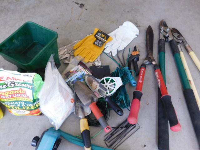 Collection of Garden and Lawn Hand Tools, Gloves, Spreader, Etc.