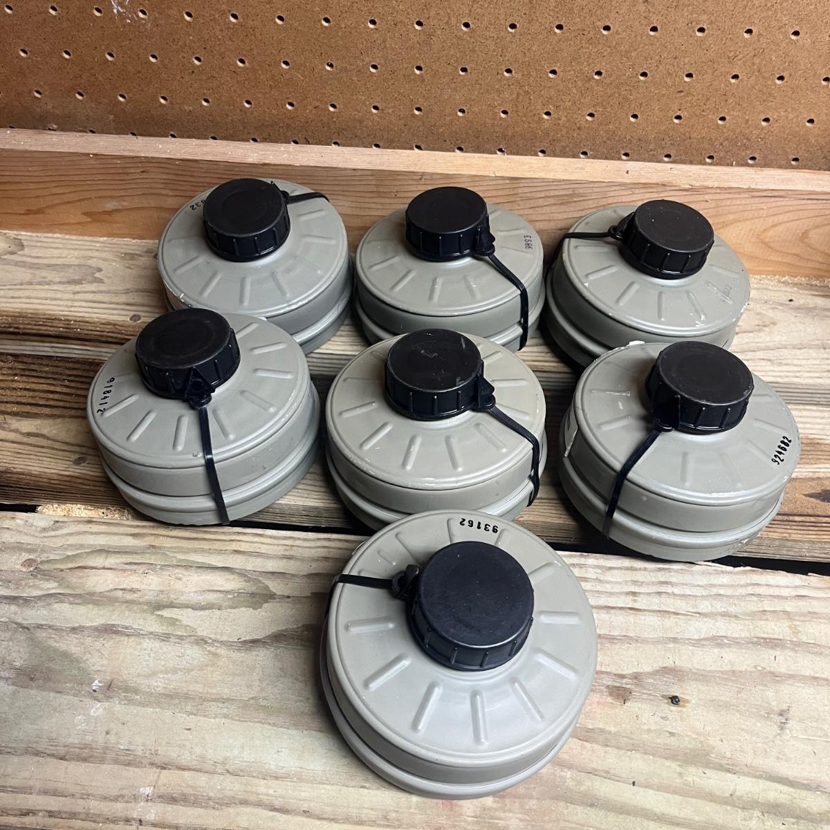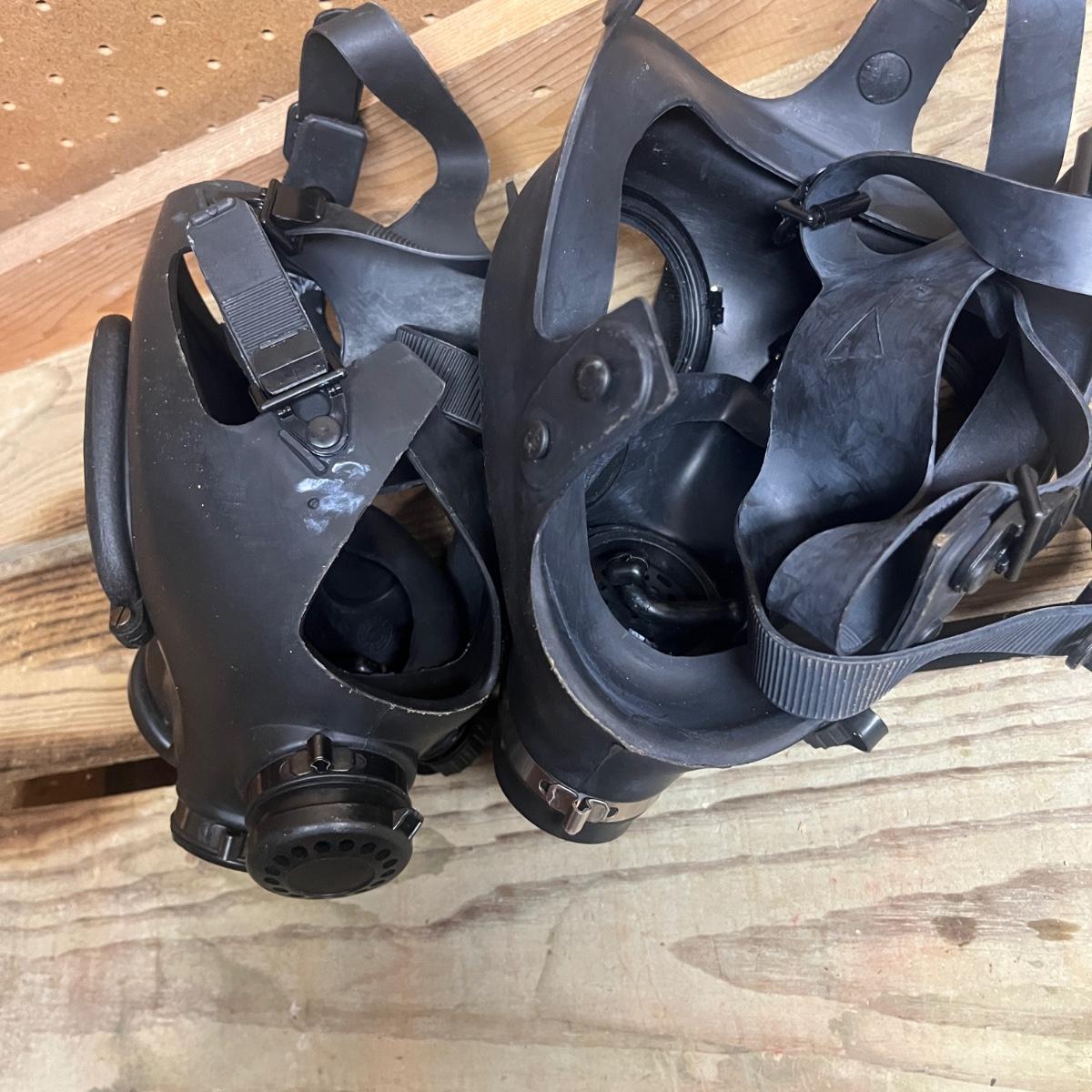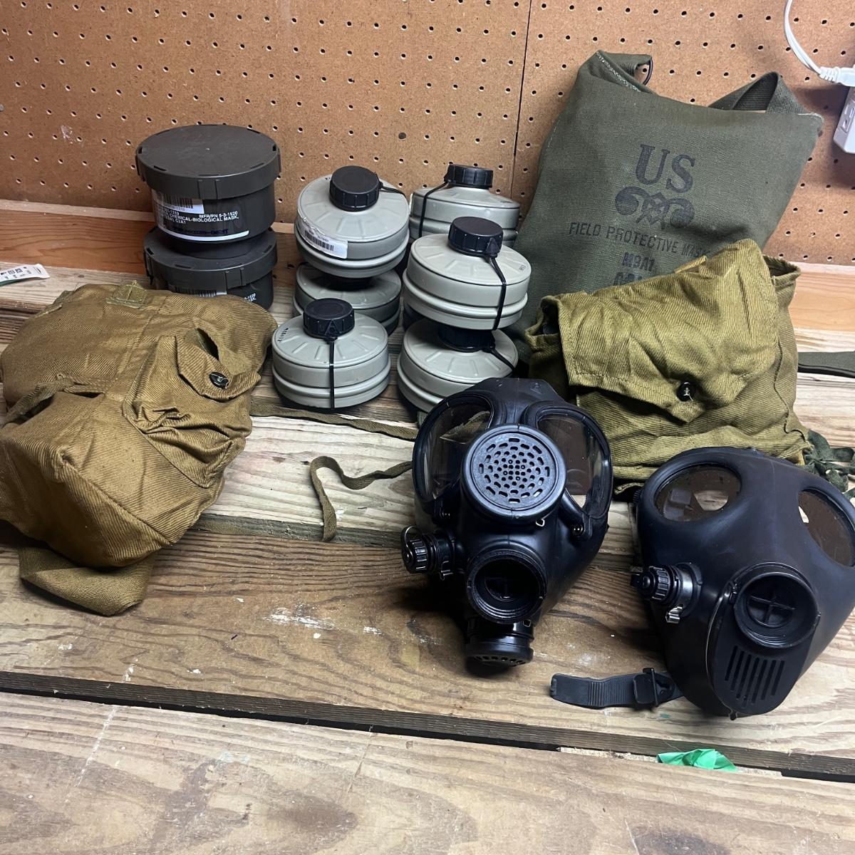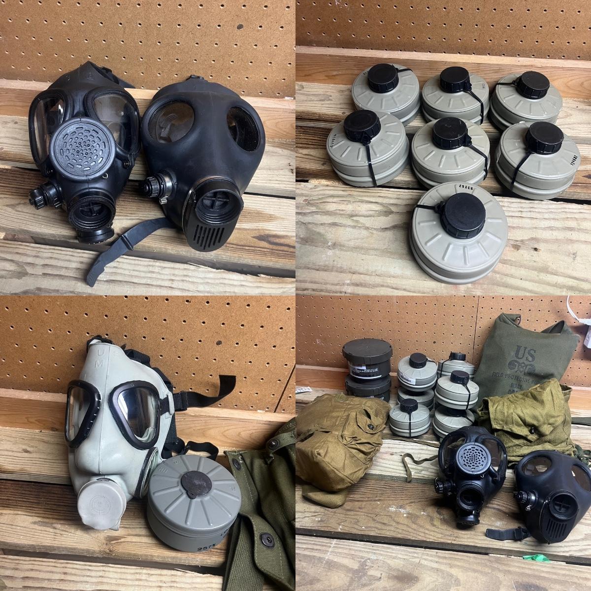 Lot includes four gas masks, over 10 canisters and a few carrying bags.