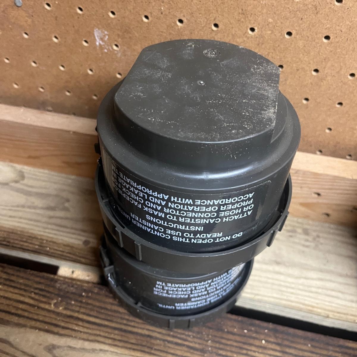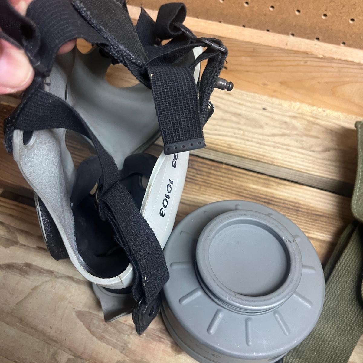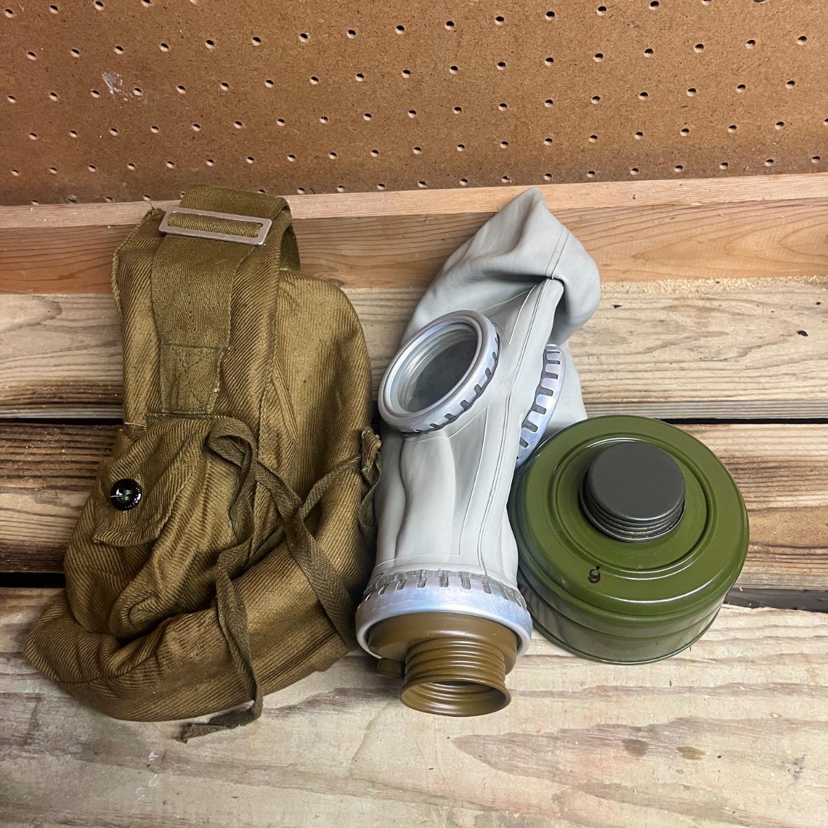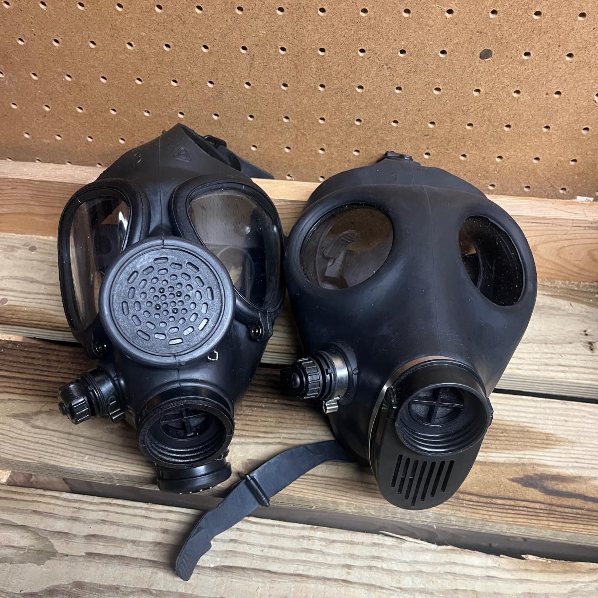 Lot includes four gas masks, over 10 canisters and a few carrying bags.